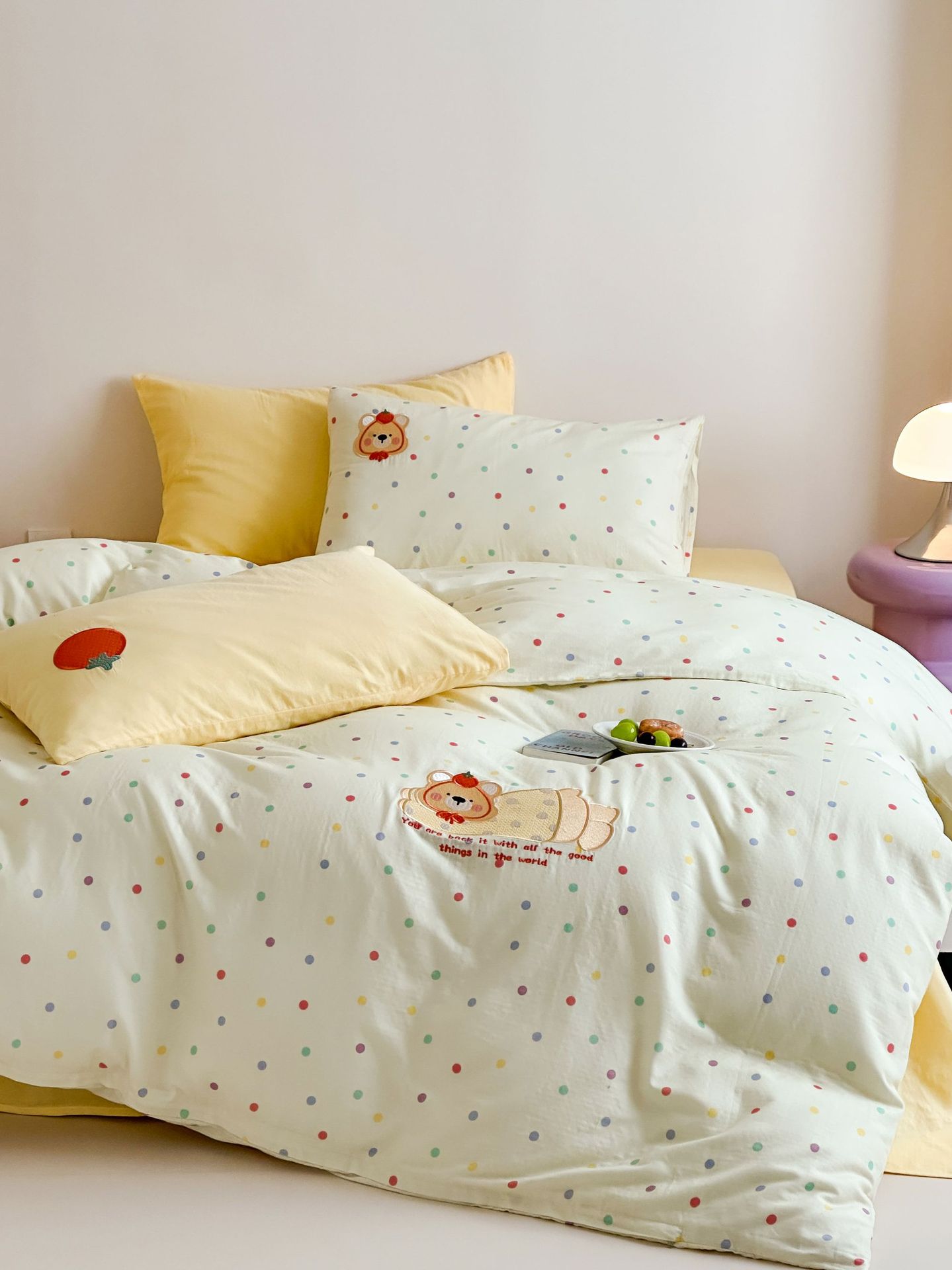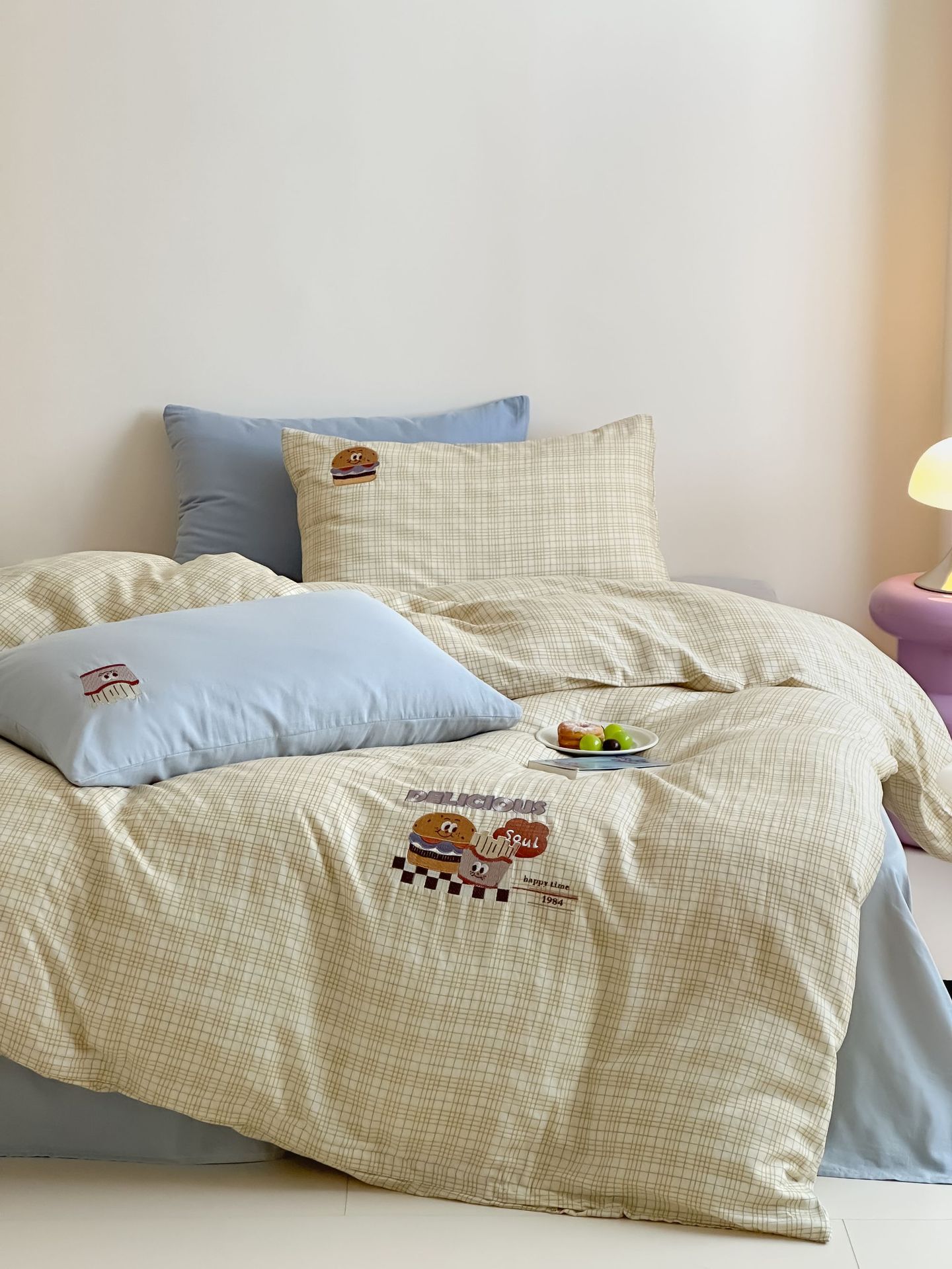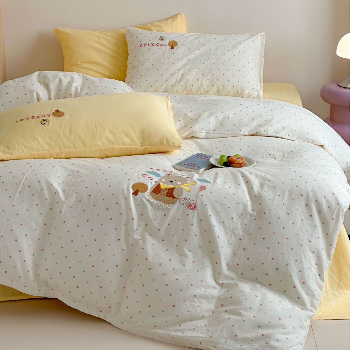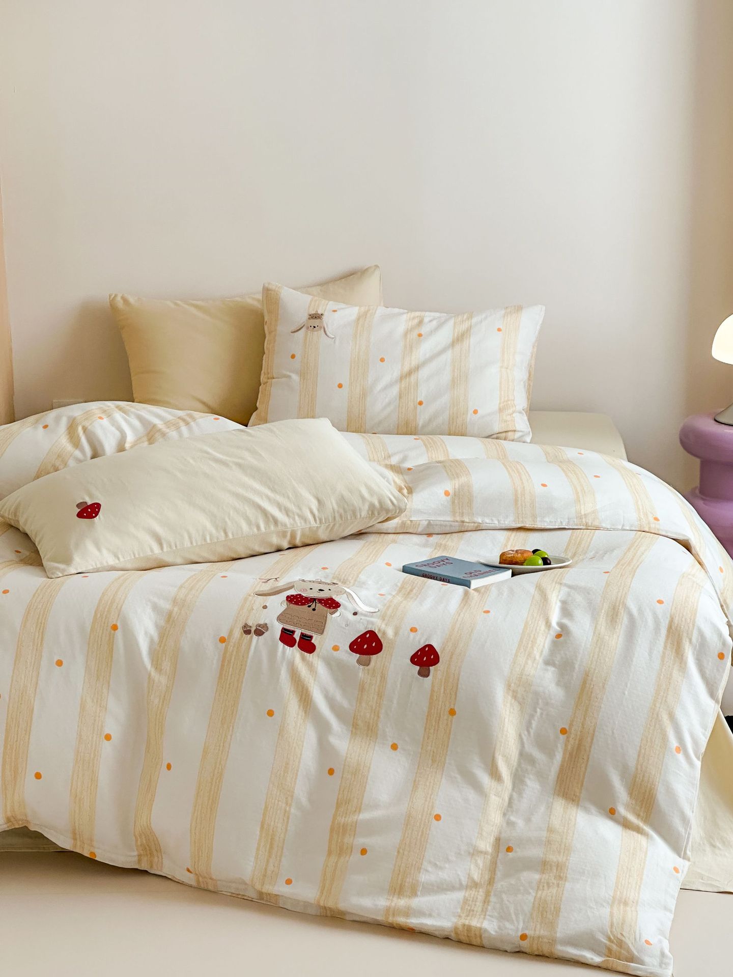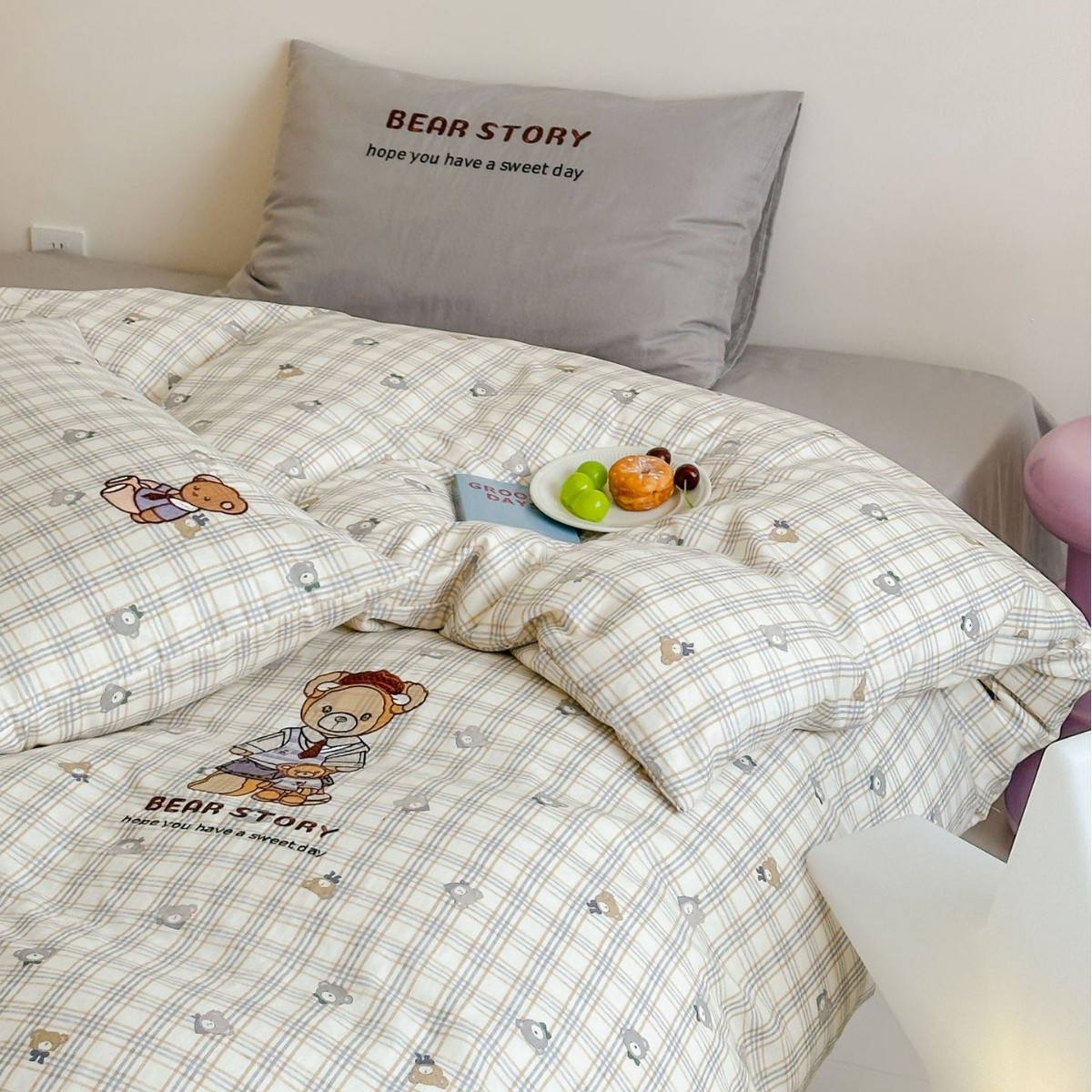 작은 신선한 면 더블 레이어 원사 4 세트 활 자수 코튼 퀼트 커버 기숙사 3 피스 침구