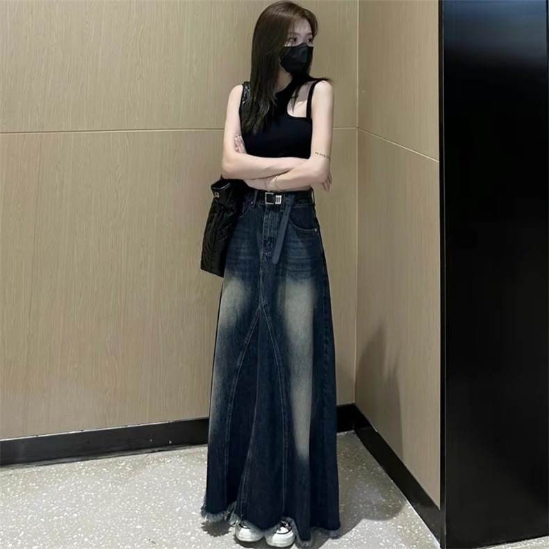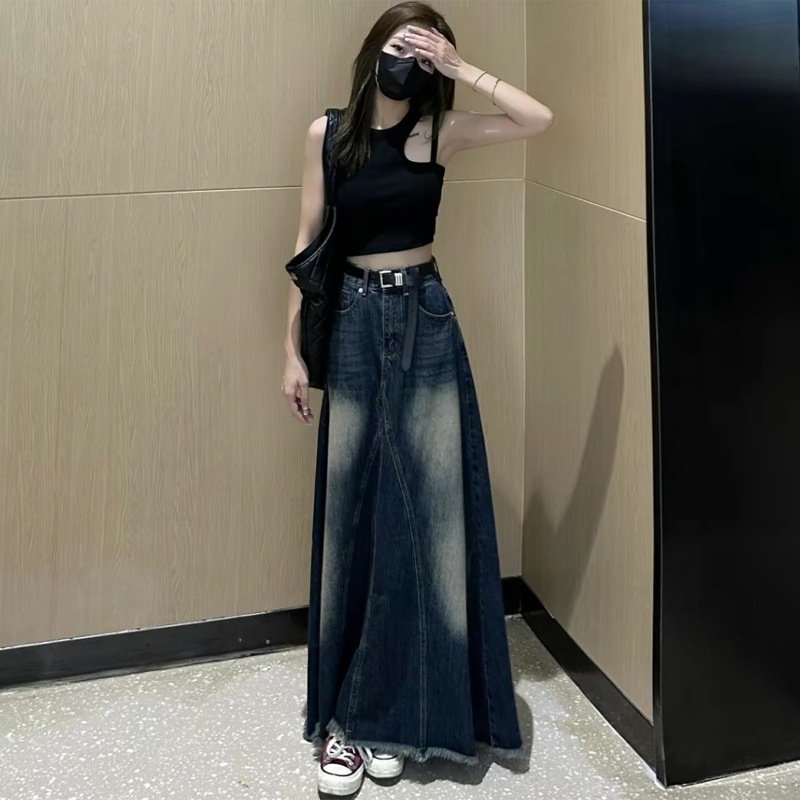 빈티지 화이트 데님 스커트 여자 2025 여름 새 스타일 게으른 스타일 불규칙한 중간 길이 A 라인 스커트스토어 가기