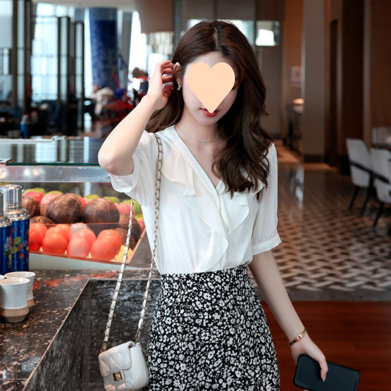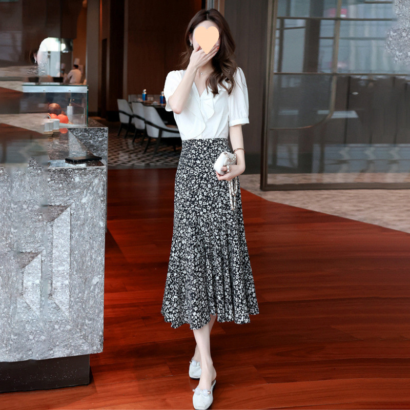 • 하이엔드 화이트 투피스 세트 하이엔드 화이트 탑 + 꽃무늬 스커트