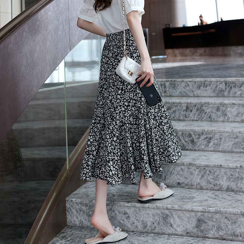 프랑스 레트로 로터스 칼라 우아한 탑 하이 웨이스트 피쉬 테일 플로랄 스커트 투피스 슬리밍 여름 여성 세트
