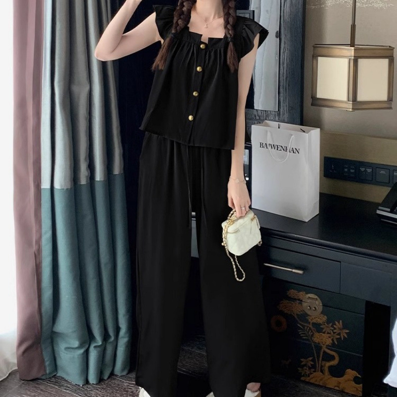 빈티지 캐주얼 연령 감소 세트 여성의 작은 여름 2025 새로운 작은 비행 소매 셔츠 스트레이트 와이드 레그 바지 투피스 세트