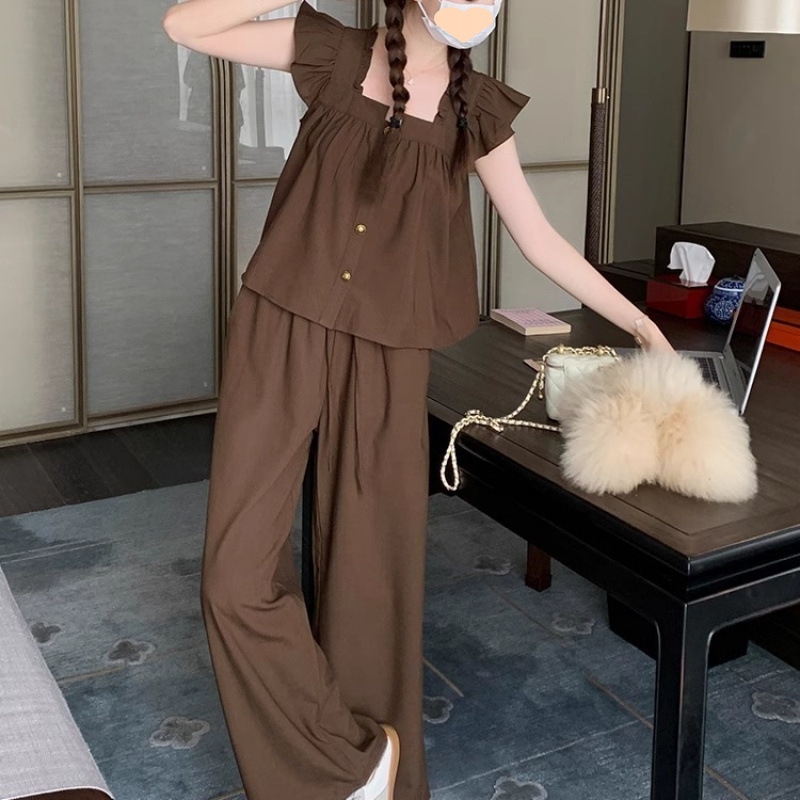 빈티지 캐주얼 연령 감소 세트 여성의 작은 여름 2025 새로운 작은 비행 소매 셔츠 스트레이트 와이드 레그 바지 투피스 세트스토어 가기