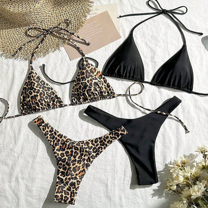 2025 새로운 유럽과 미국의 레오파드 무늬 단색 섹시한 비키니 분할 수영복 여성 해변 온천 4 피스 수영복스토어 가기