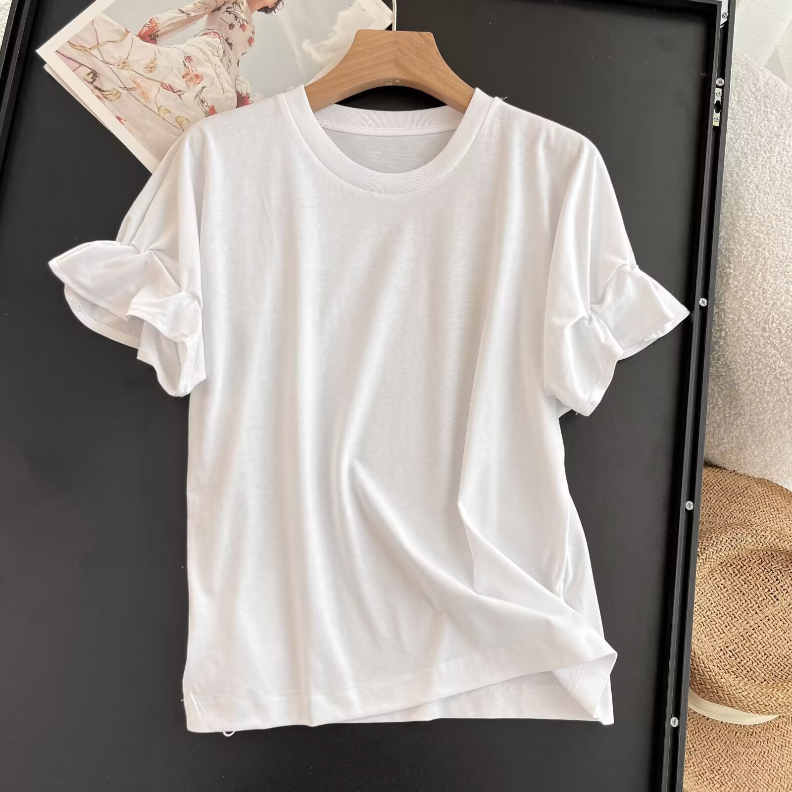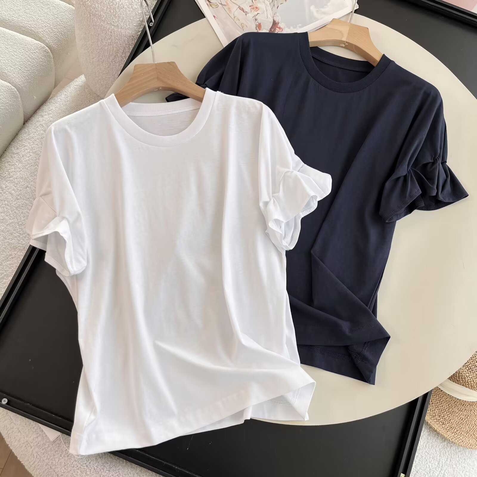 UC & ZA 대외 무역 국경 간 AliExpress 여성복 유럽과 미국 스타일 크루 넥 플리츠 커프 루즈 조커 반팔 티셔츠 탑