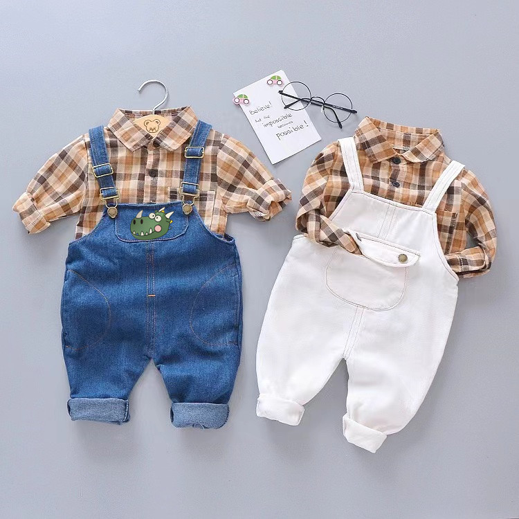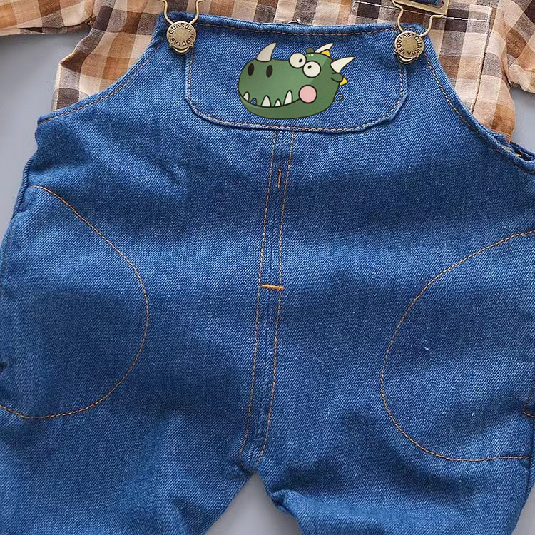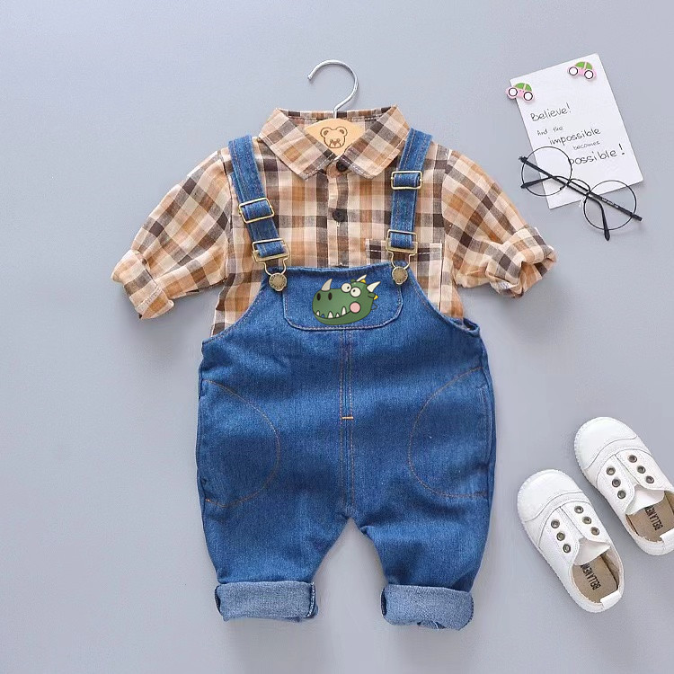 봄과 세트 2025 봄과 가을 새로운 어린이 스타일리스트 타입 격자 무늬 공룡 스트랩 긴 소매 세트 트렌디스토어 가기