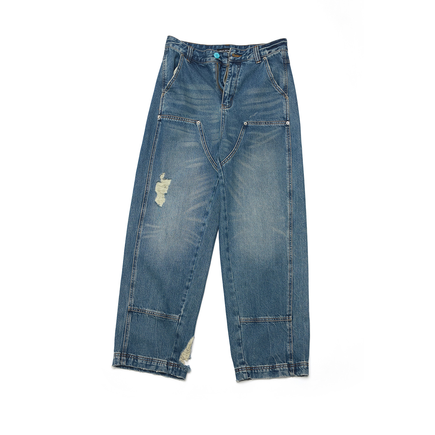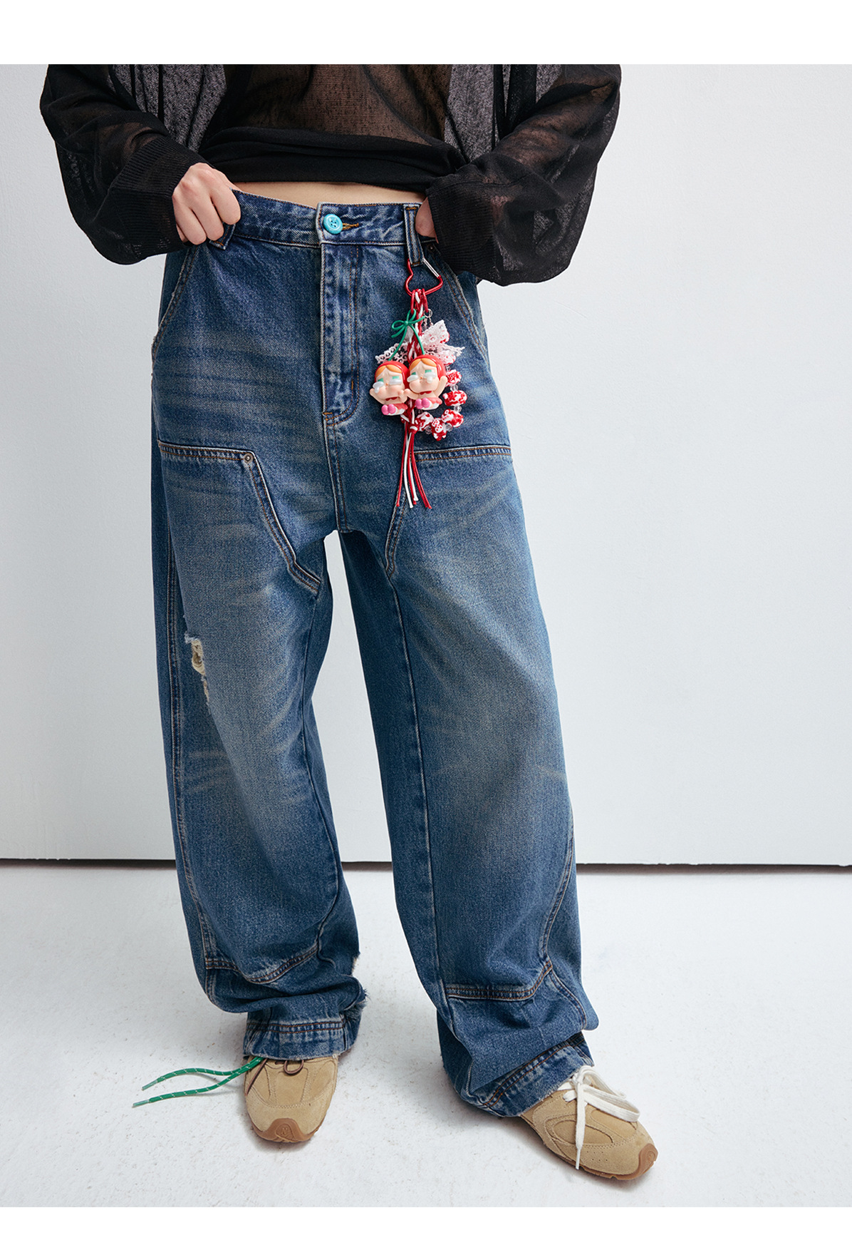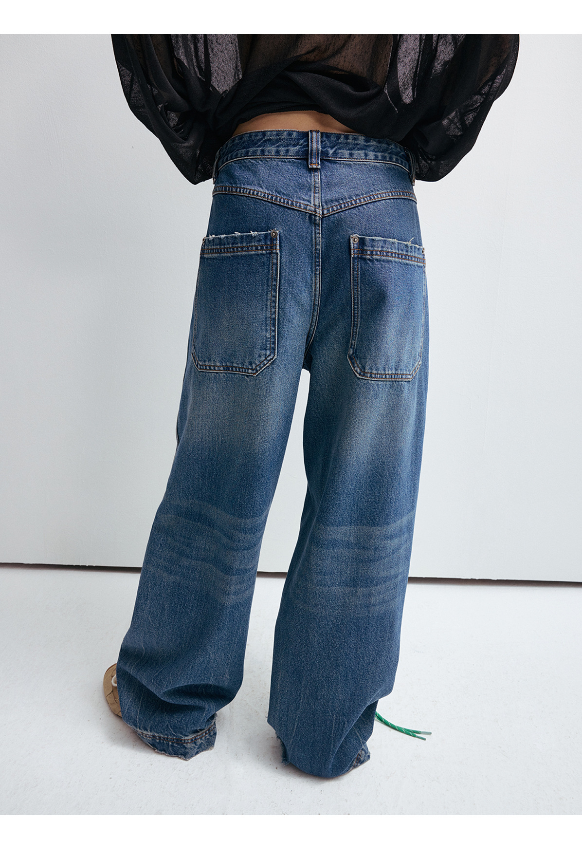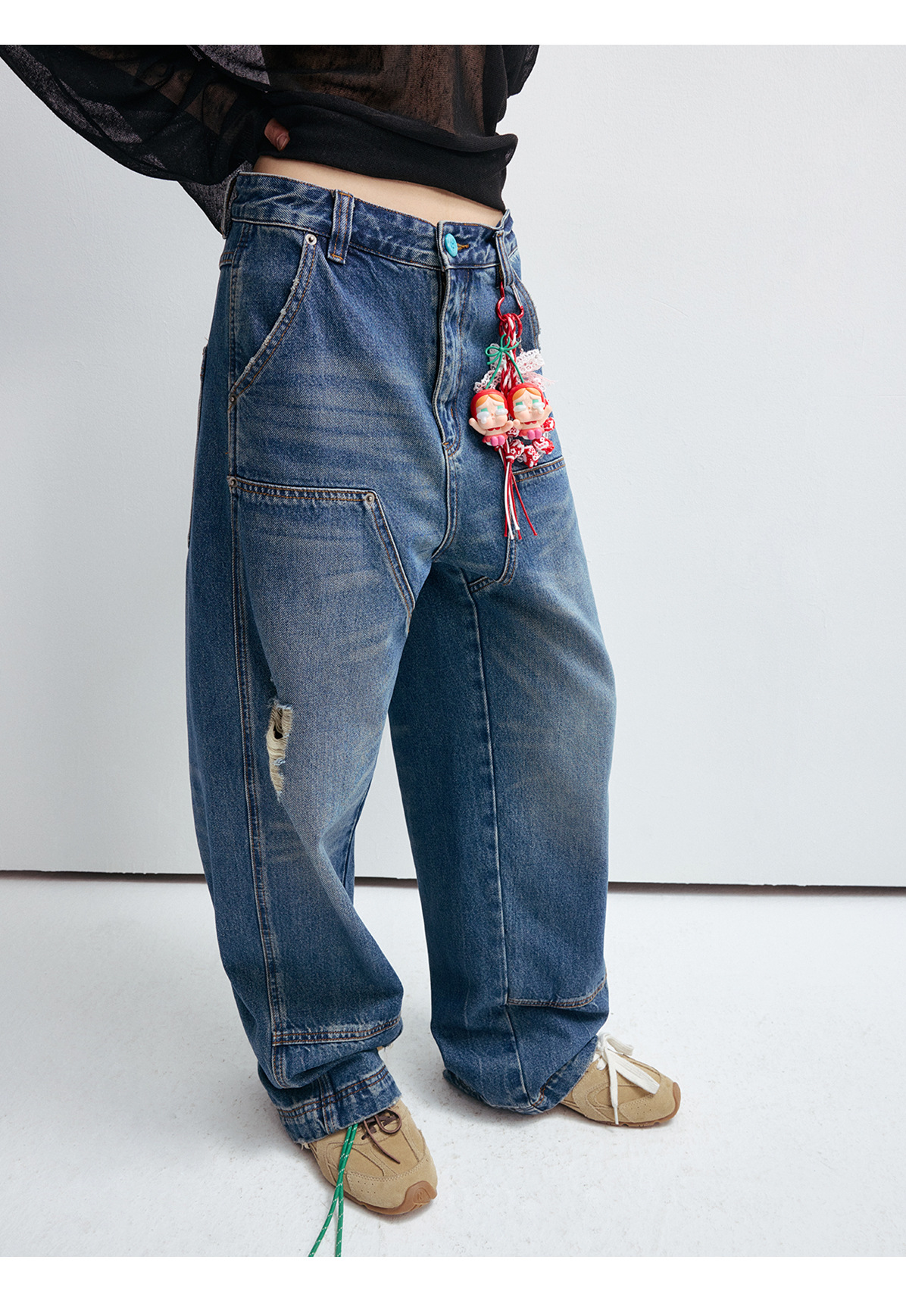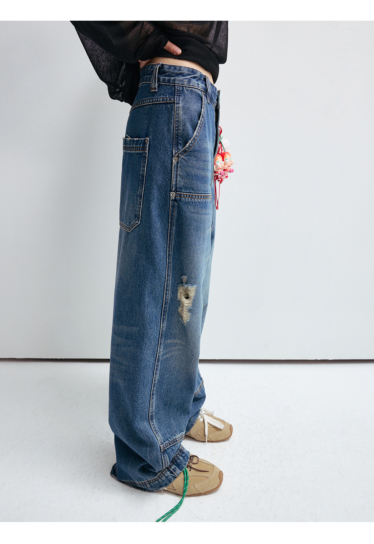 [시시] 신상 블루 터키석 버클 벌커 스타일 루즈핏 롱 팬츠 텐셀 데미지 디테일 미드로우 웨이스트 데님 팬츠 V8276
