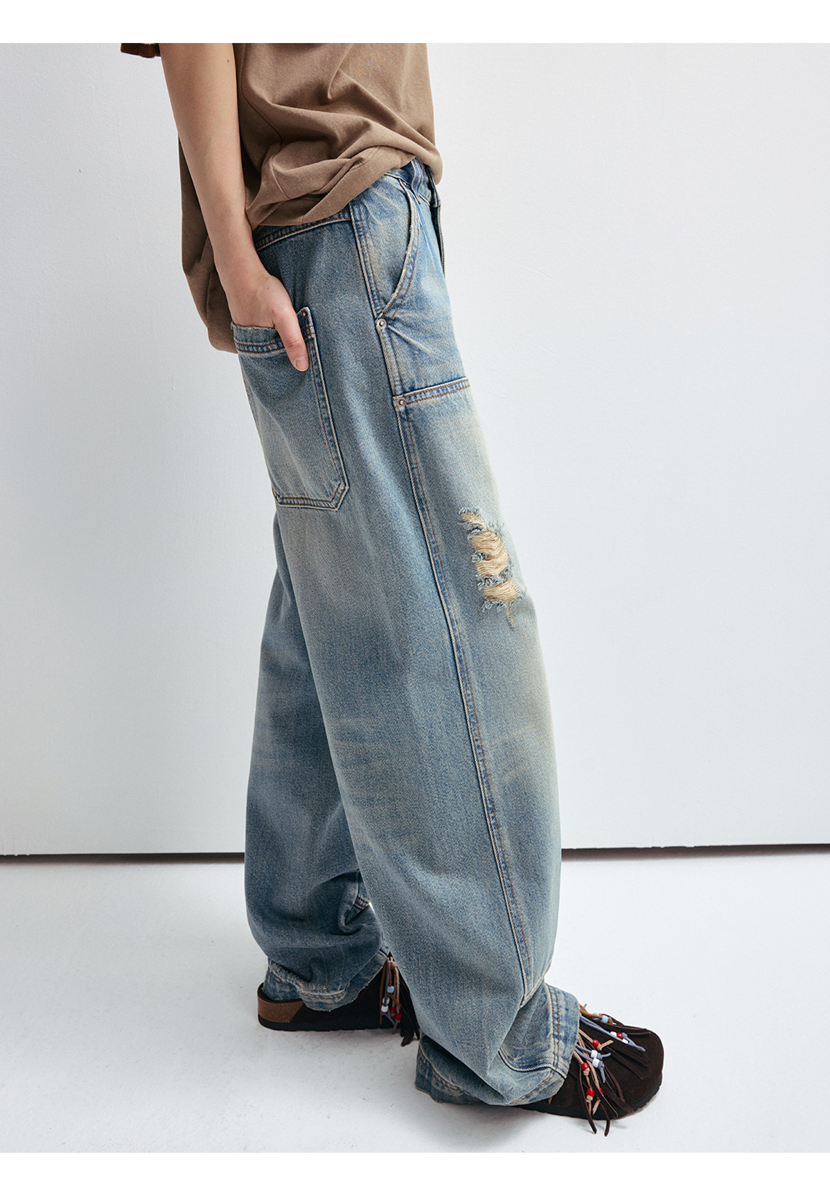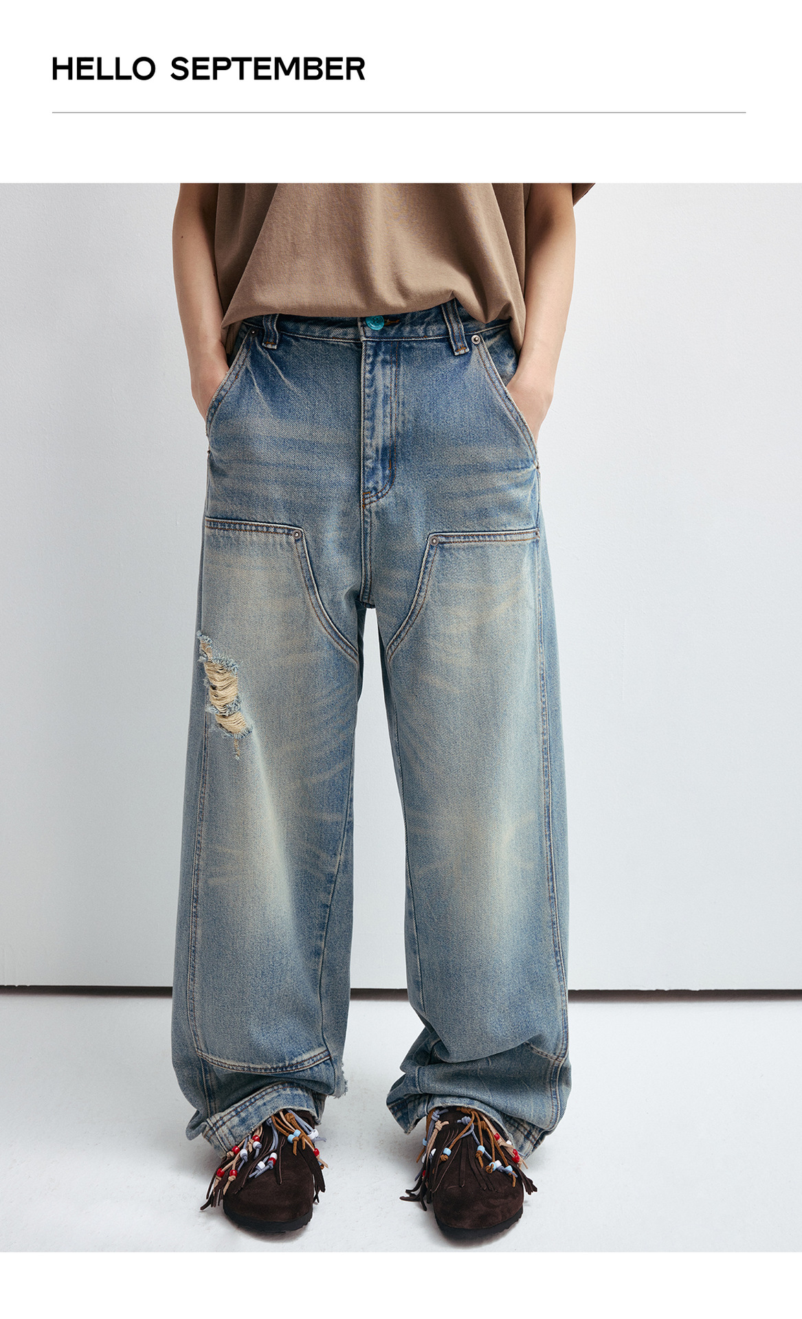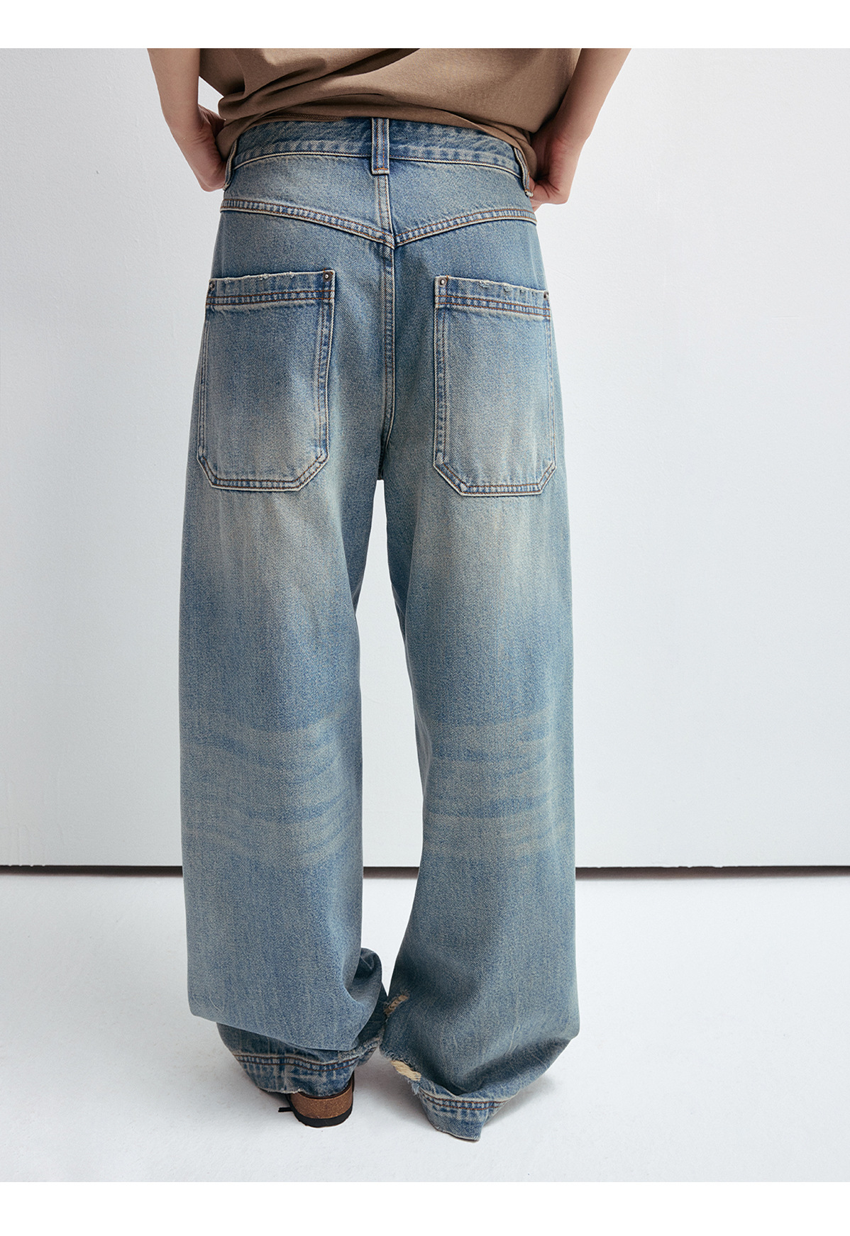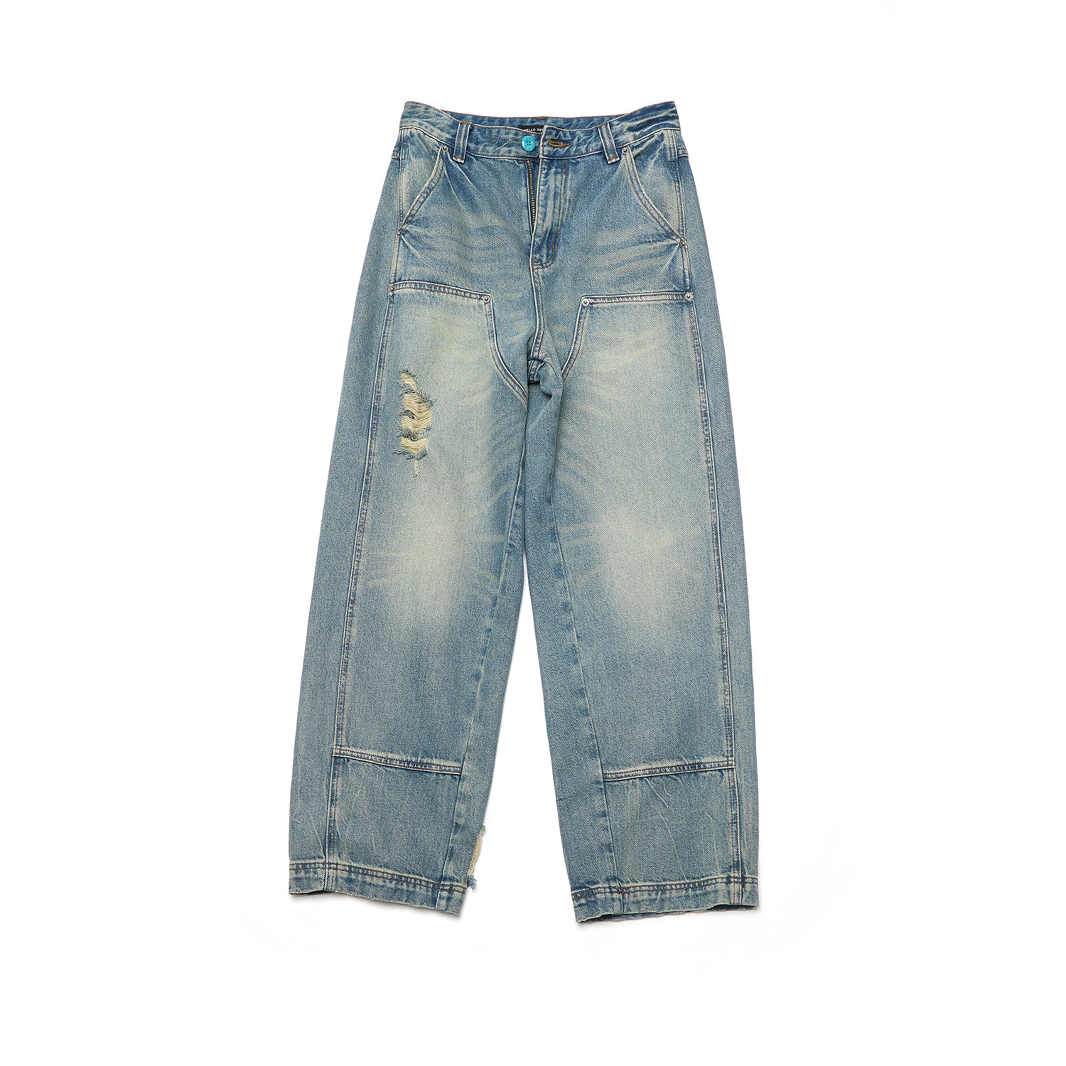 [시시] 신상 블루 터키석 버클 벌커 스타일 루즈핏 롱 팬츠 텐셀 데미지 디테일 미드로우 웨이스트 데님 팬츠 V8276