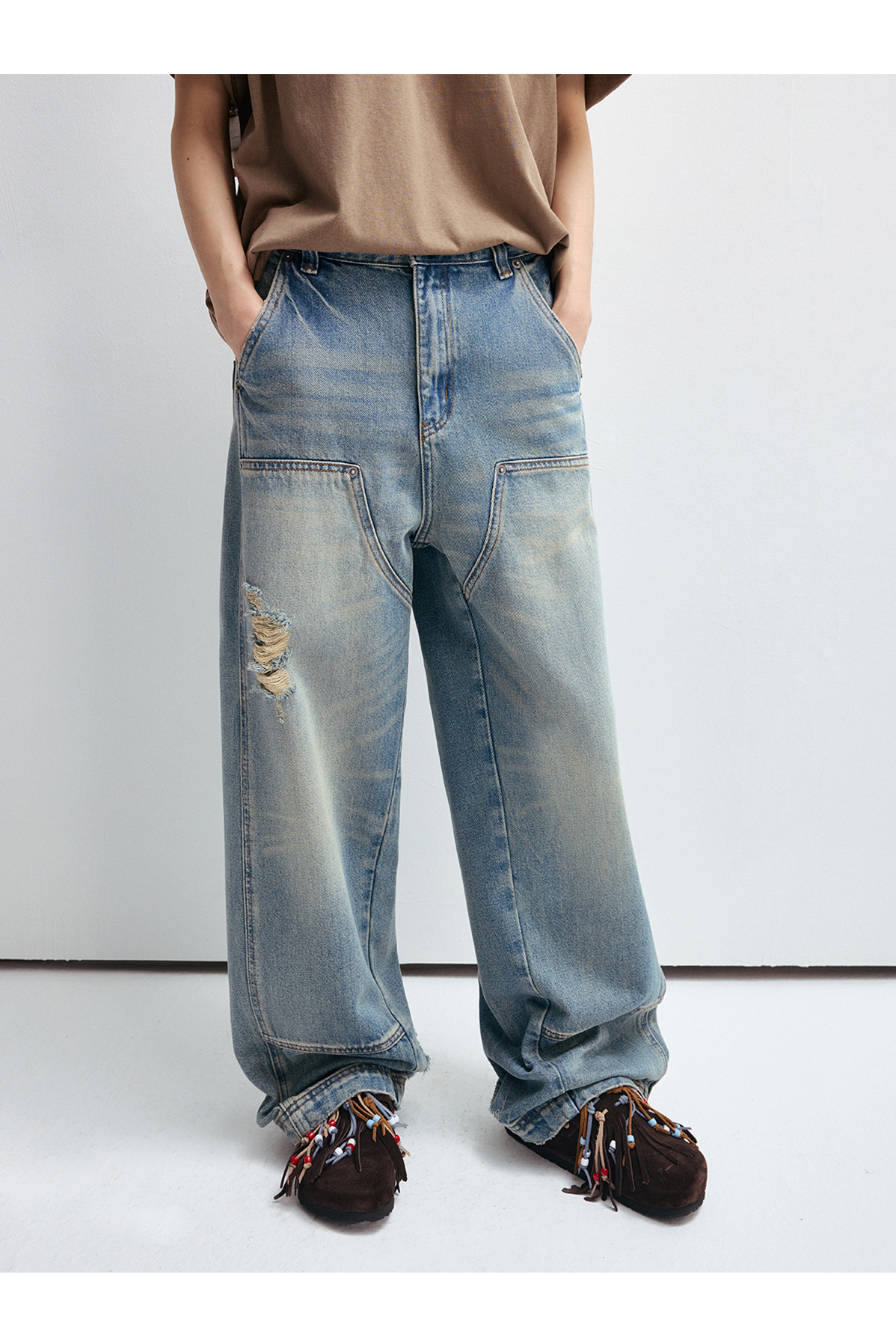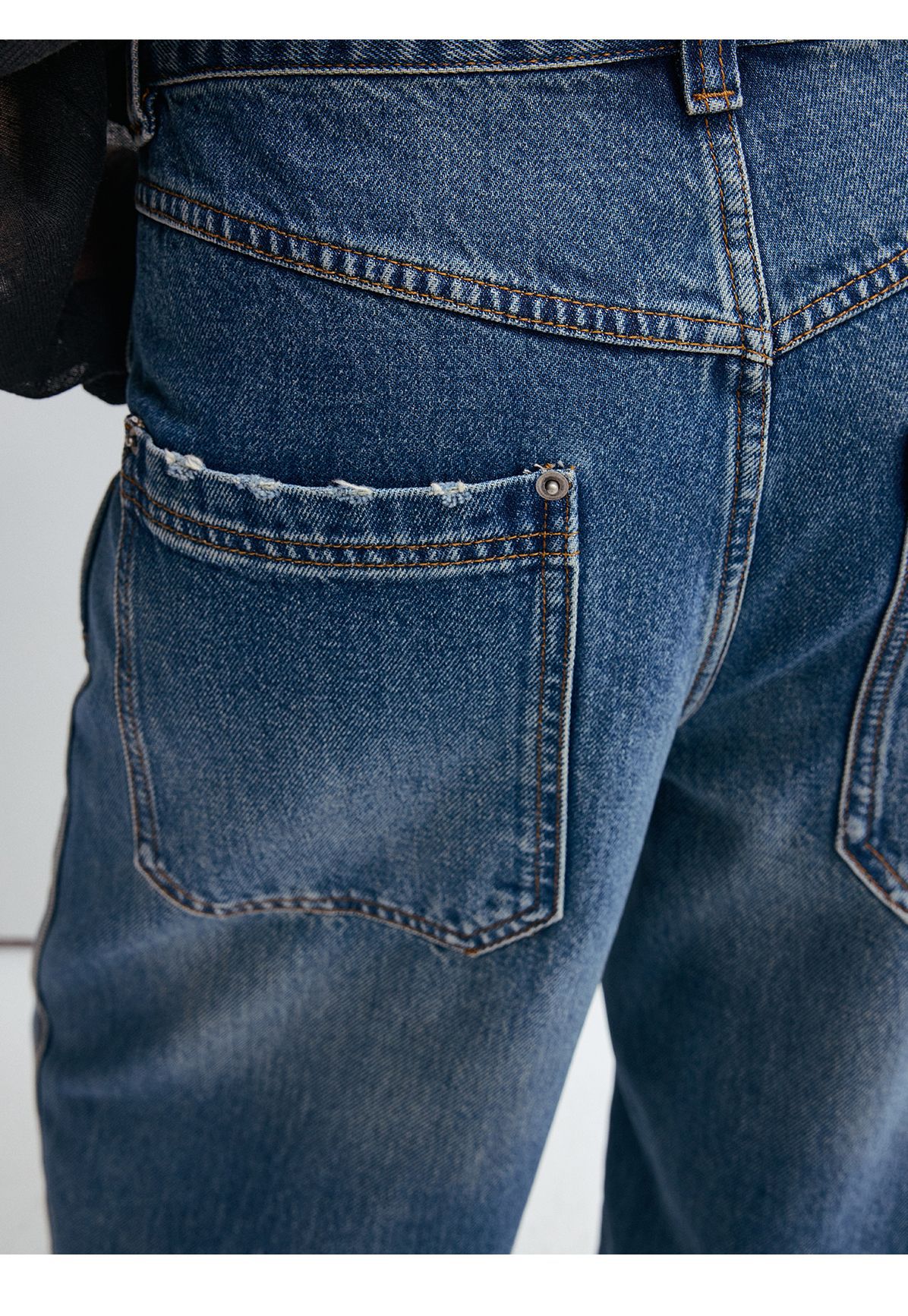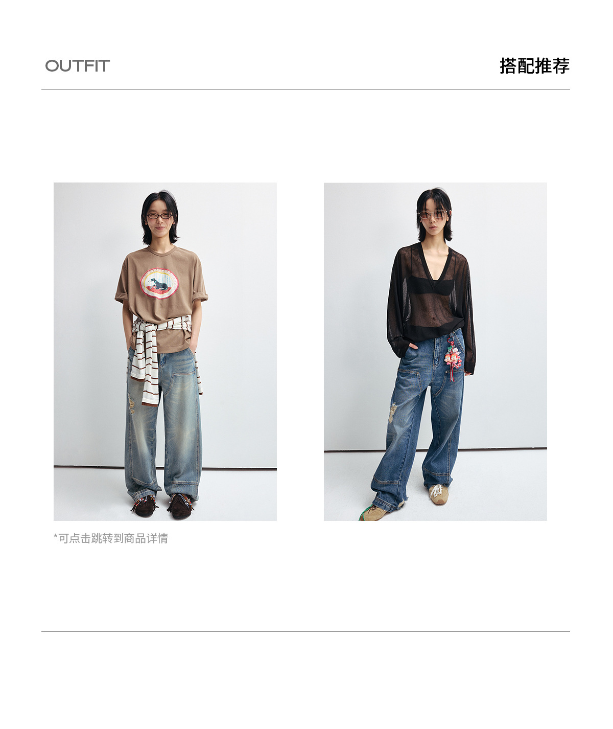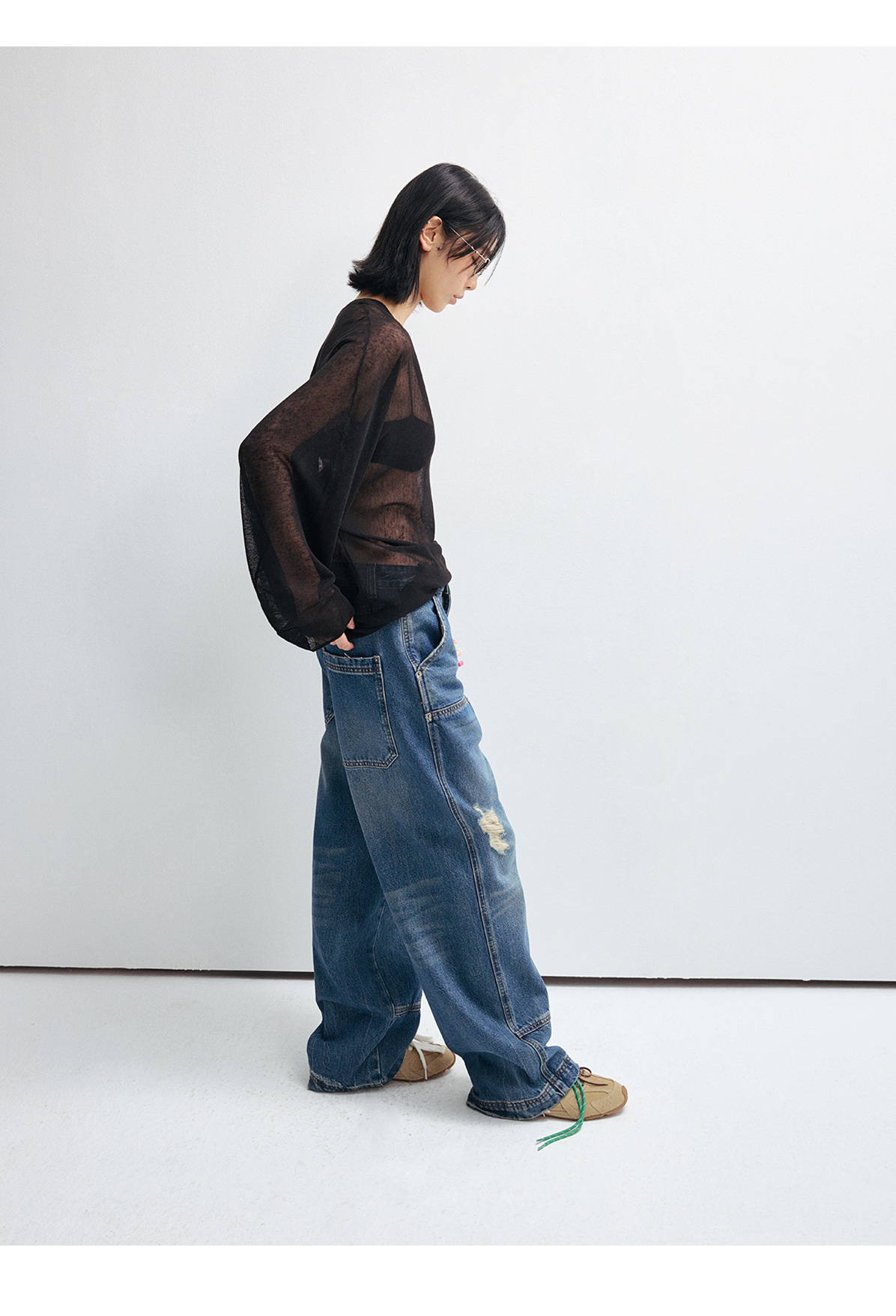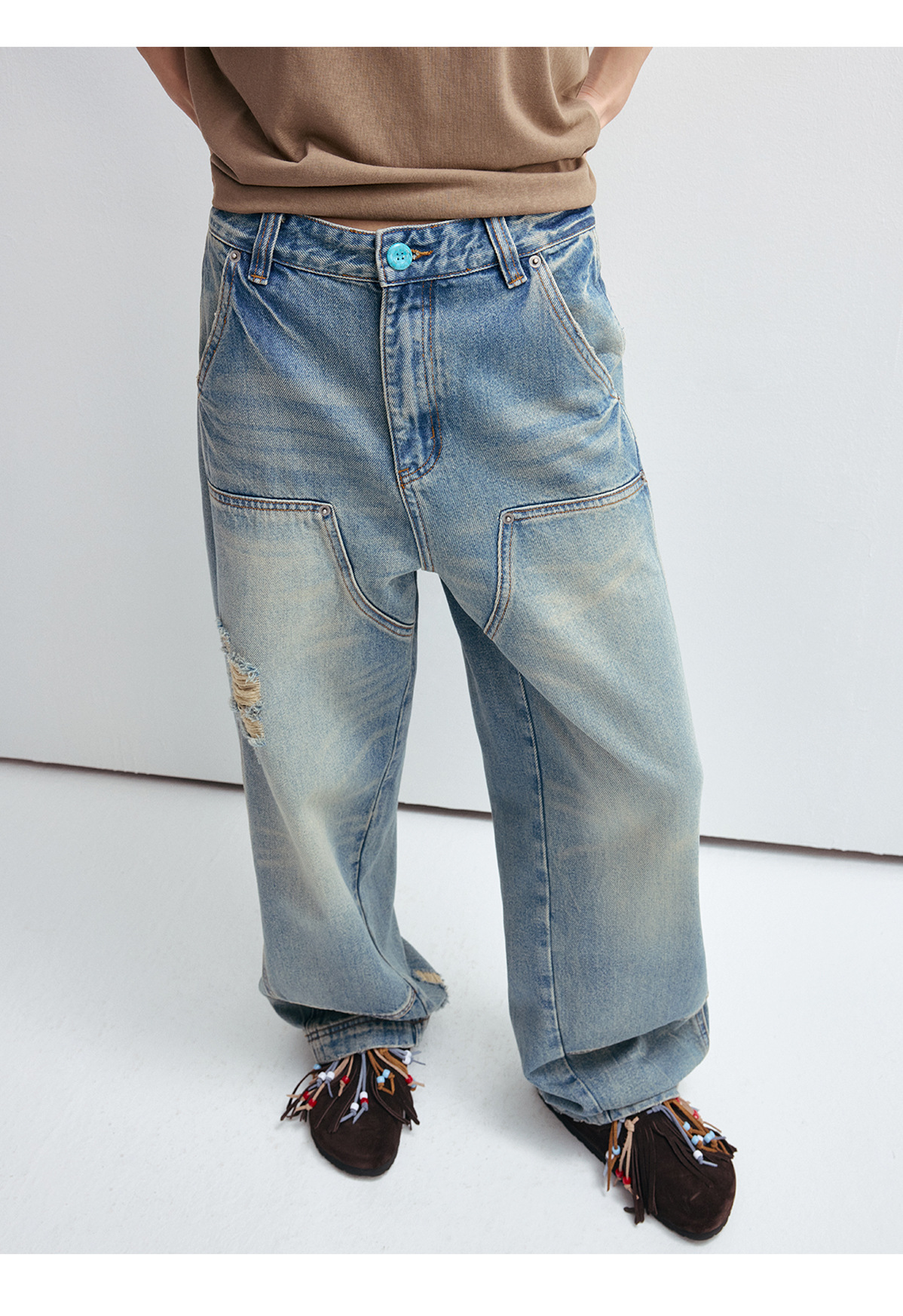 [시시] 신상 블루 터키석 버클 벌커 스타일 루즈핏 롱 팬츠 텐셀 데미지 디테일 미드로우 웨이스트 데님 팬츠 V8276