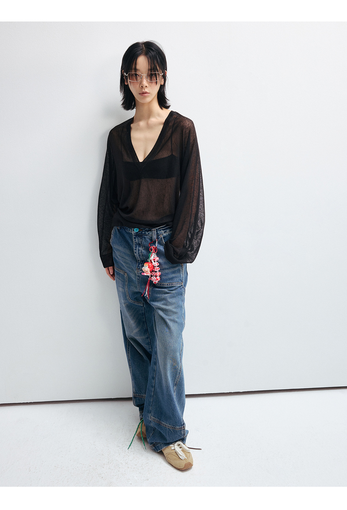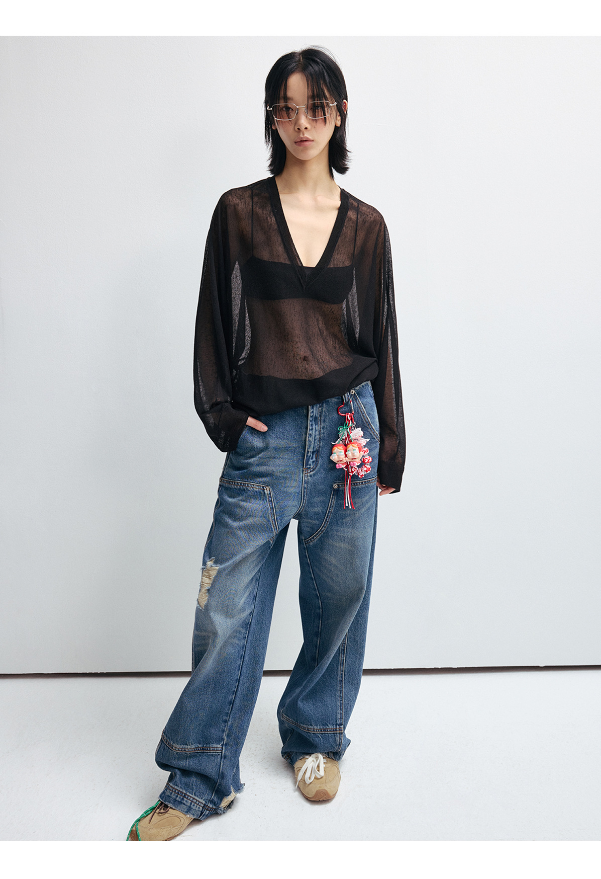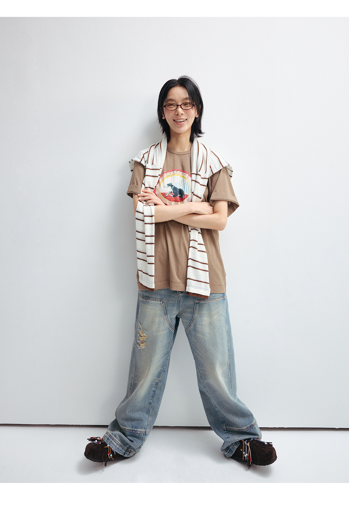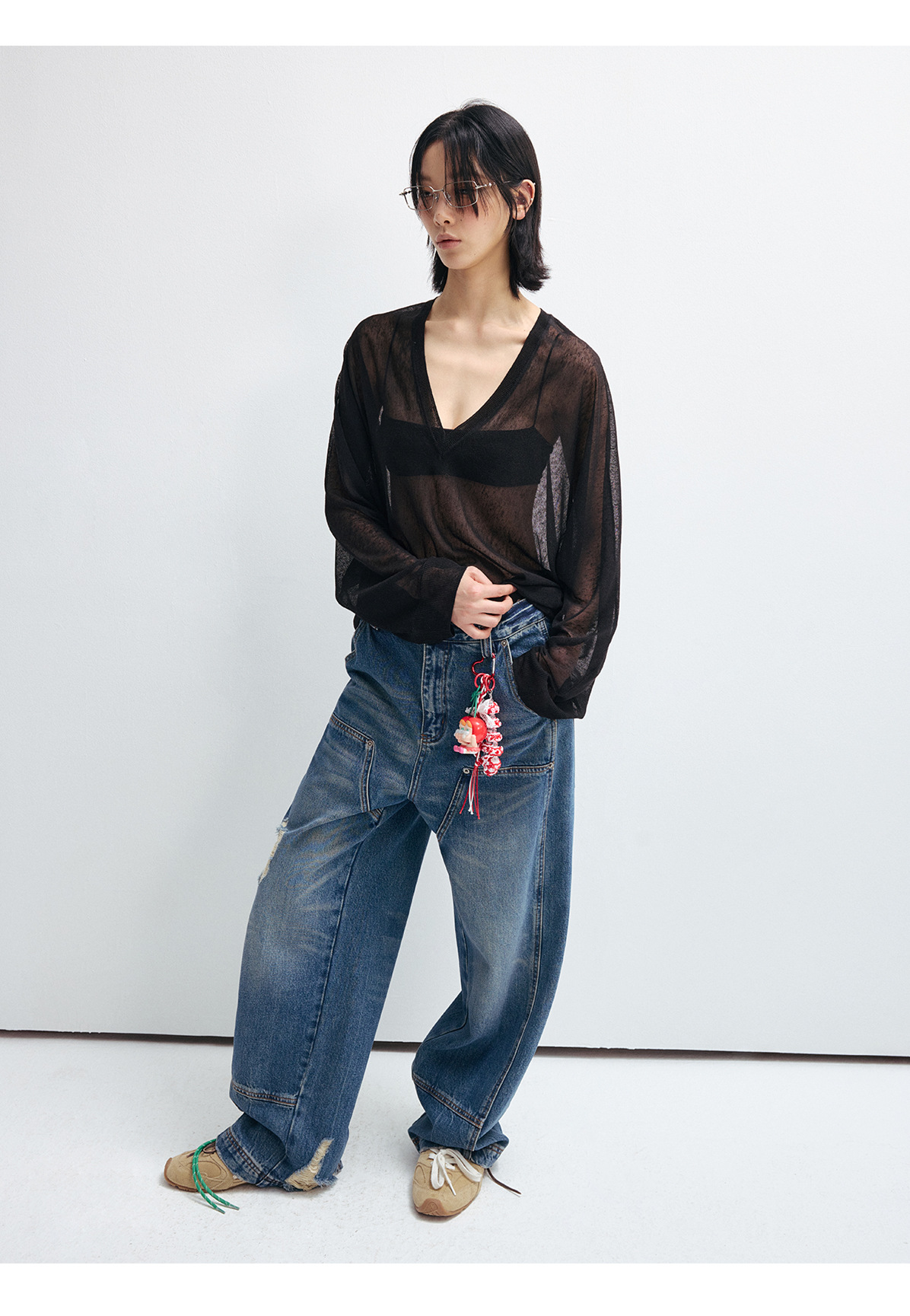[시시] 신상 블루 터키석 버클 벌커 스타일 루즈핏 롱 팬츠 텐셀 데미지 디테일 미드로우 웨이스트 데님 팬츠 V8276