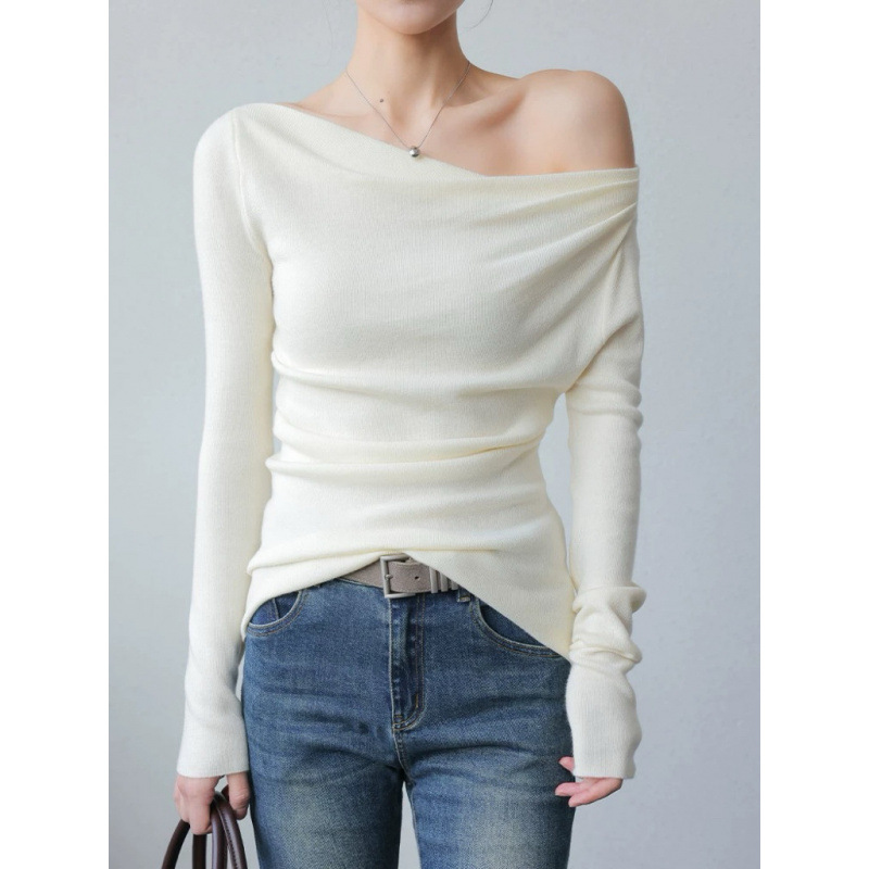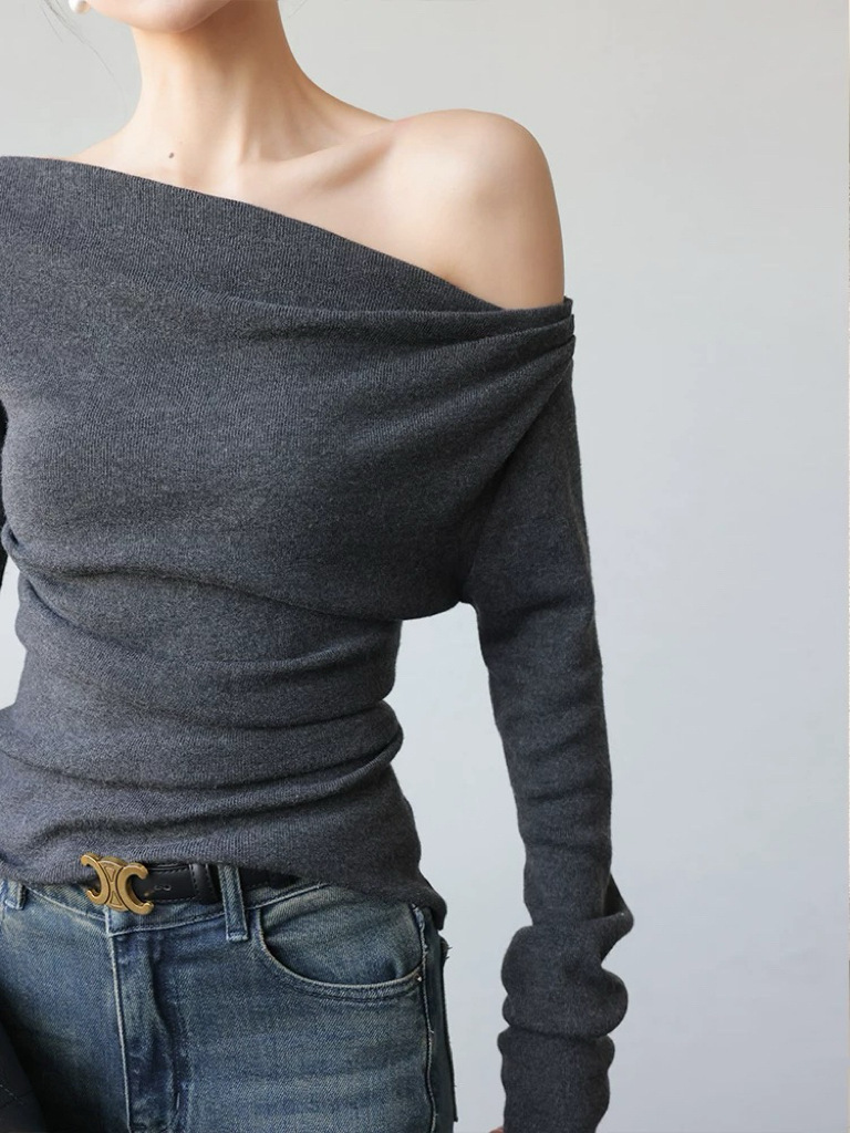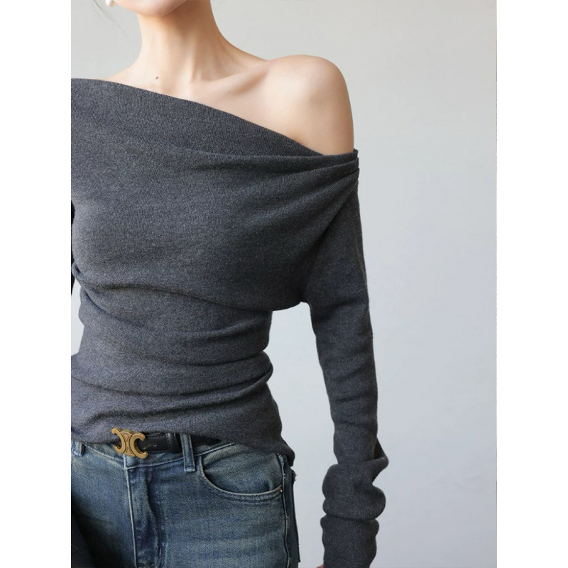 회색 오프 숄더 긴팔 니트 바닥 셔츠 여성의 2025 가을과 겨울 새로운 디자인 감각 틈새 슬림 탑스토어 가기