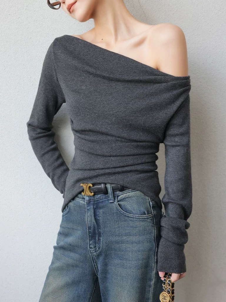 회색 오프 숄더 긴팔 니트 바닥 셔츠 여성의 2025 가을과 겨울 새로운 디자인 감각 틈새 슬림 탑