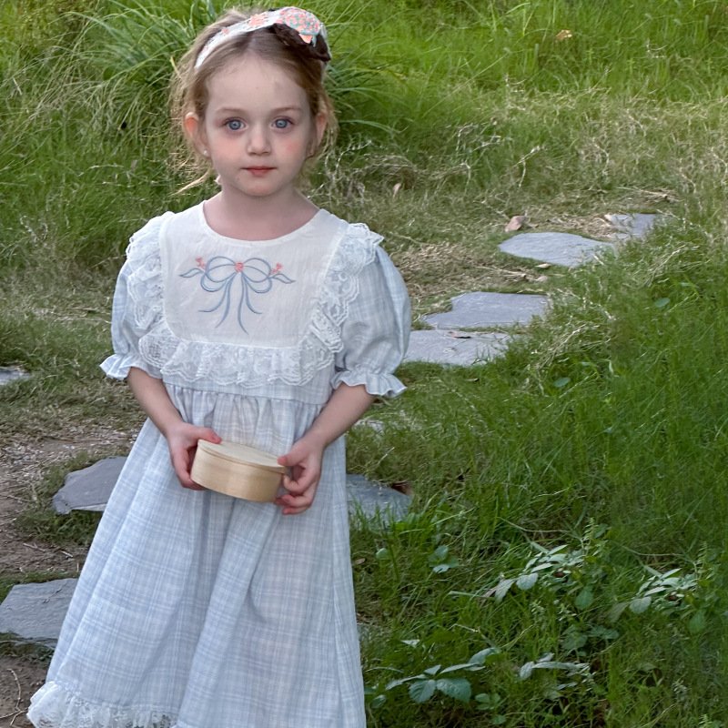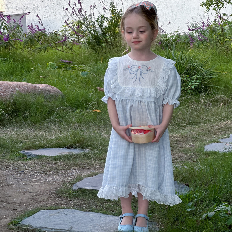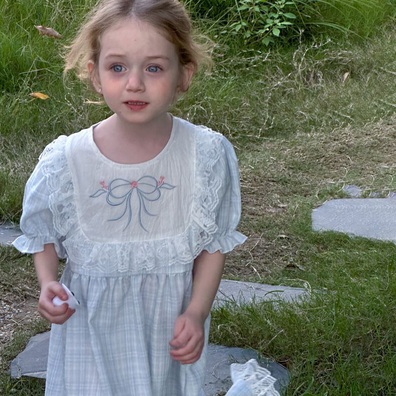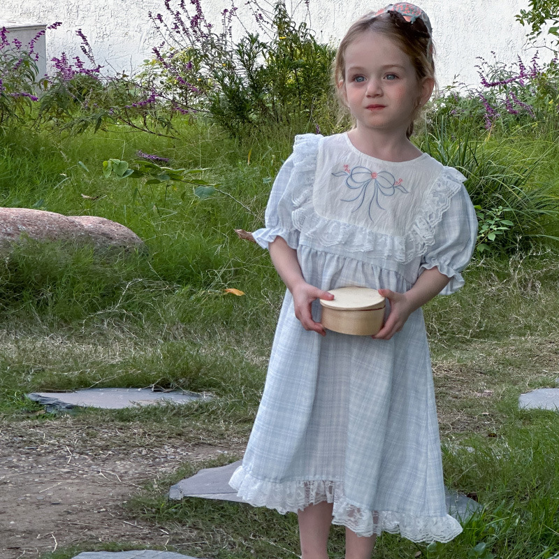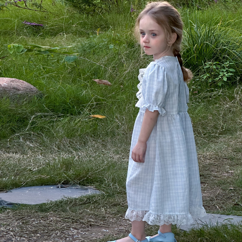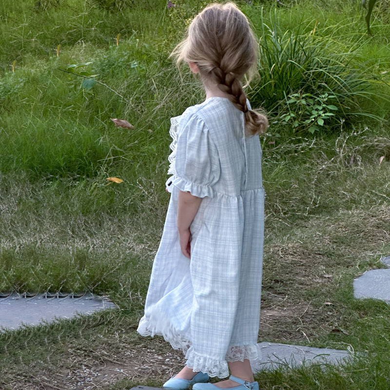 한국 소녀 원피스 2025 여름 새로운 도착 어린 소녀 달콤한 레이스 스티칭 격자 무늬 원피스 어린이 공주 원피스스토어 가기