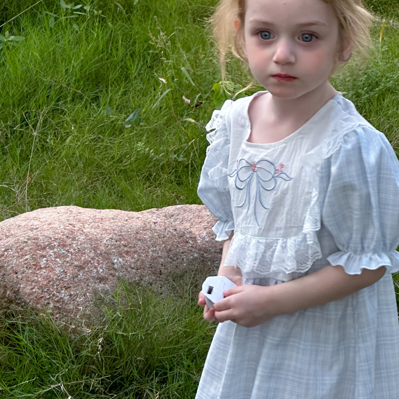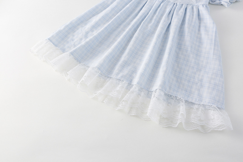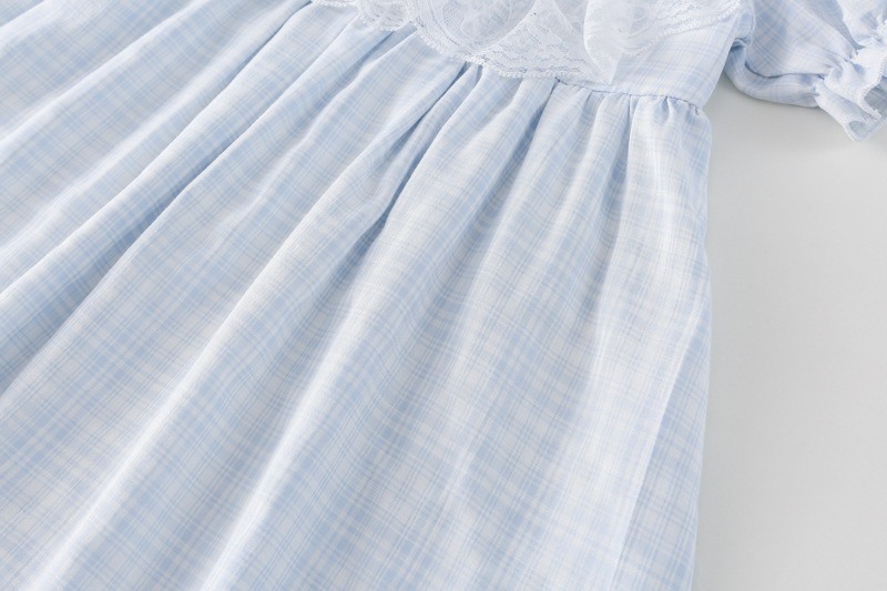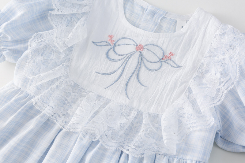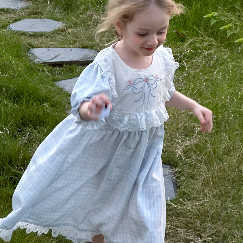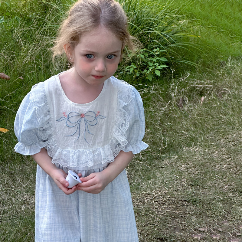 한국 소녀 원피스 2025 여름 새로운 도착 어린 소녀 달콤한 레이스 스티칭 격자 무늬 원피스 어린이 공주 원피스스토어 가기