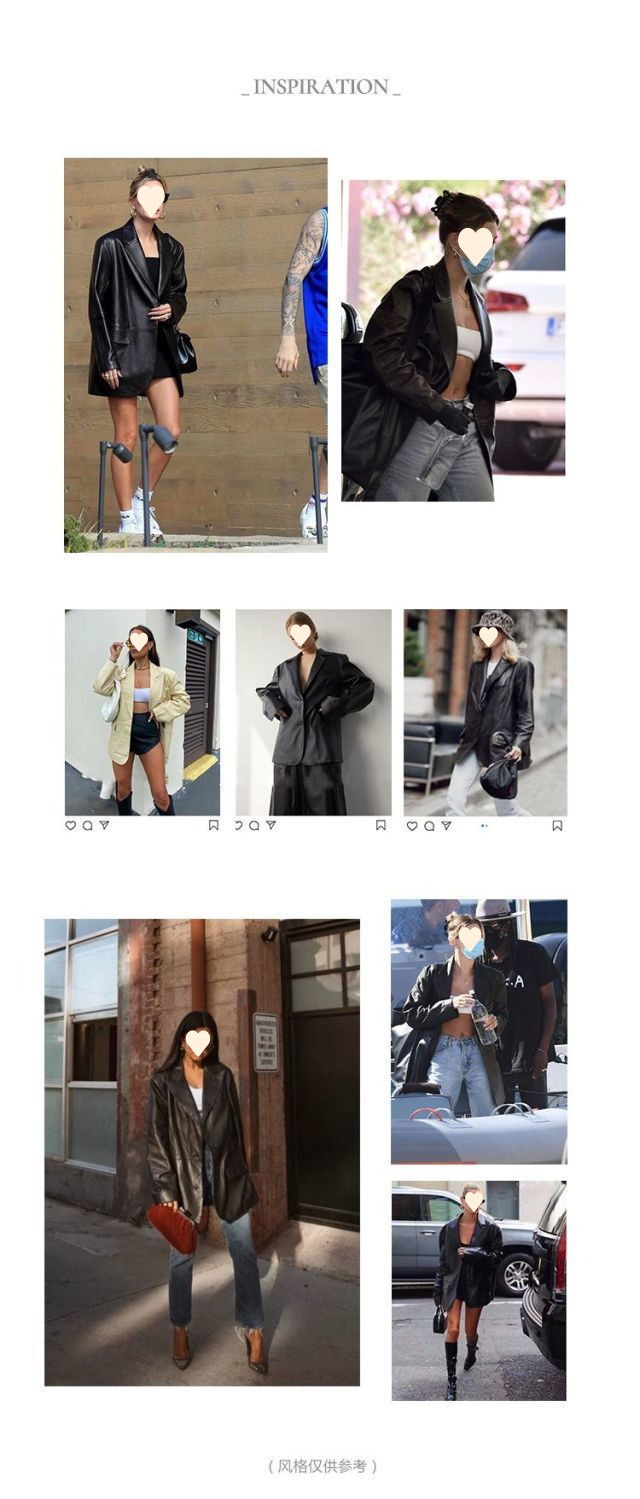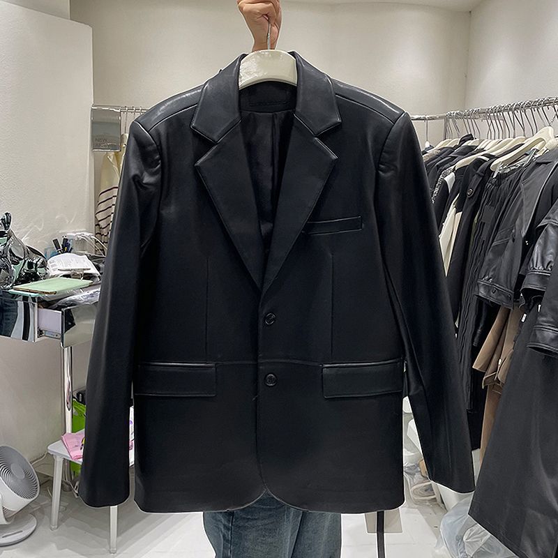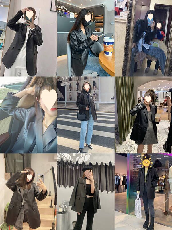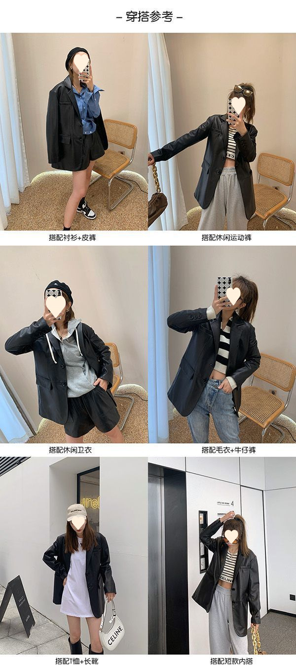 2024 새로운 한국 스타일 느슨한 블랙 PU 중간 길이 가죽 세트 재킷 여성 세트 칼라 센스 가죽 자켓스토어 가기