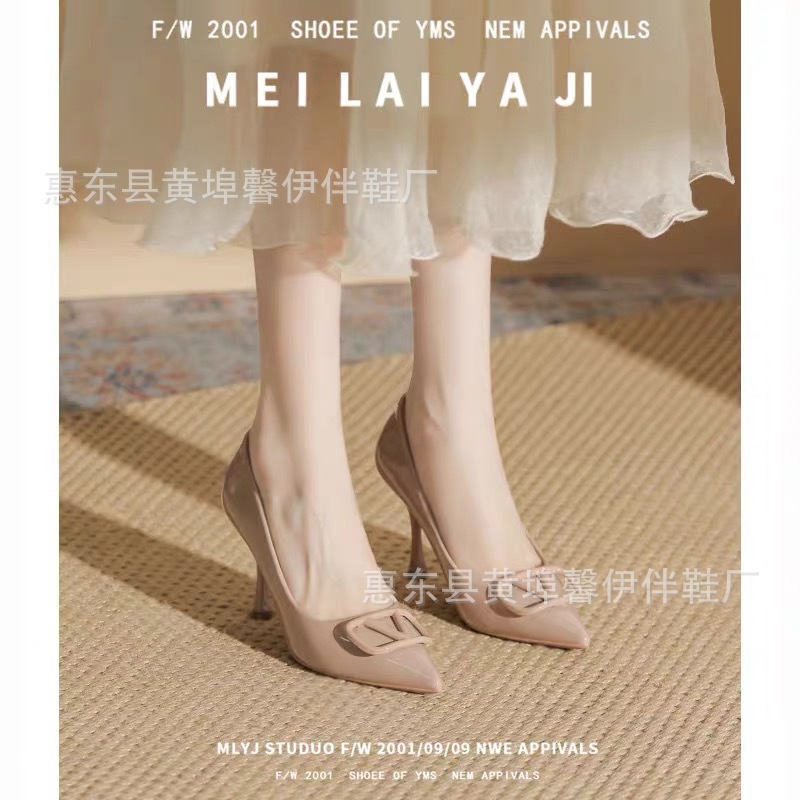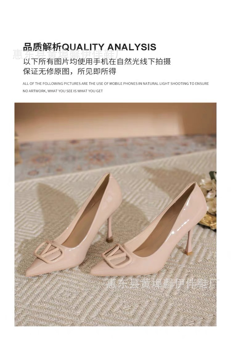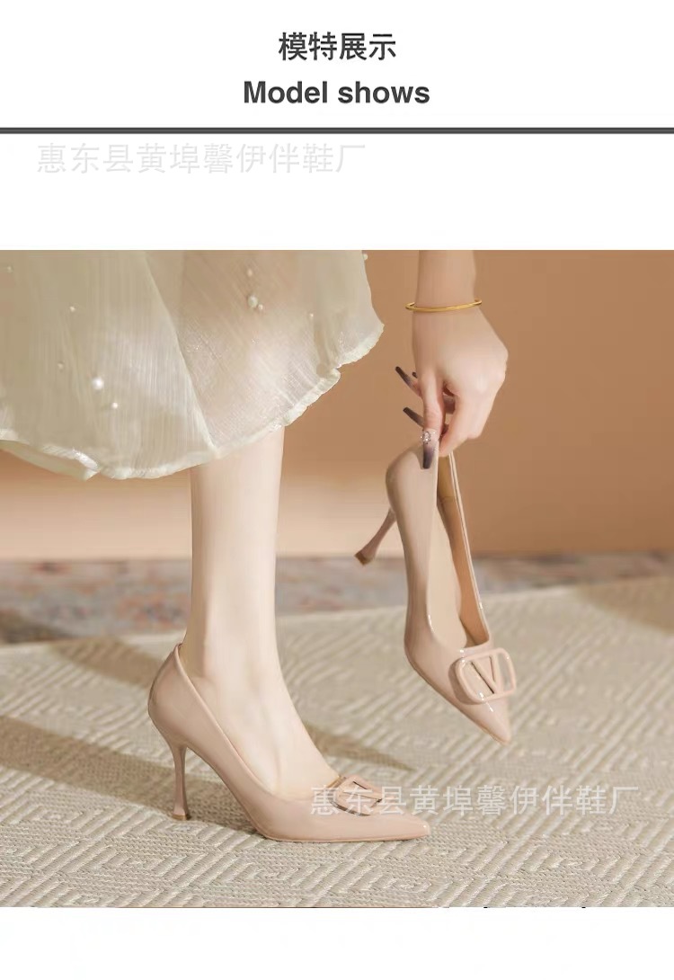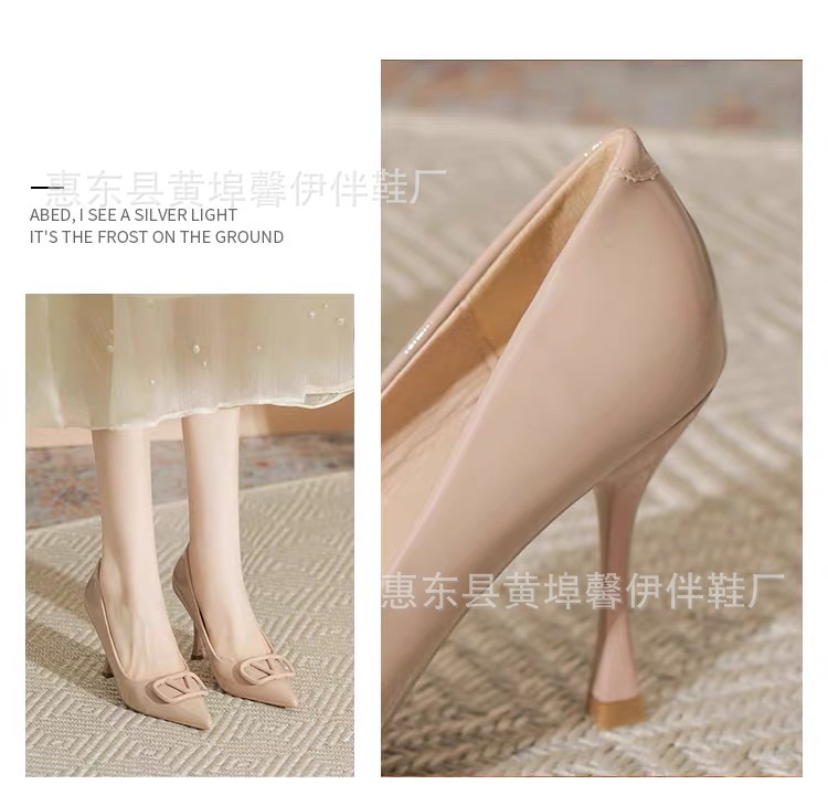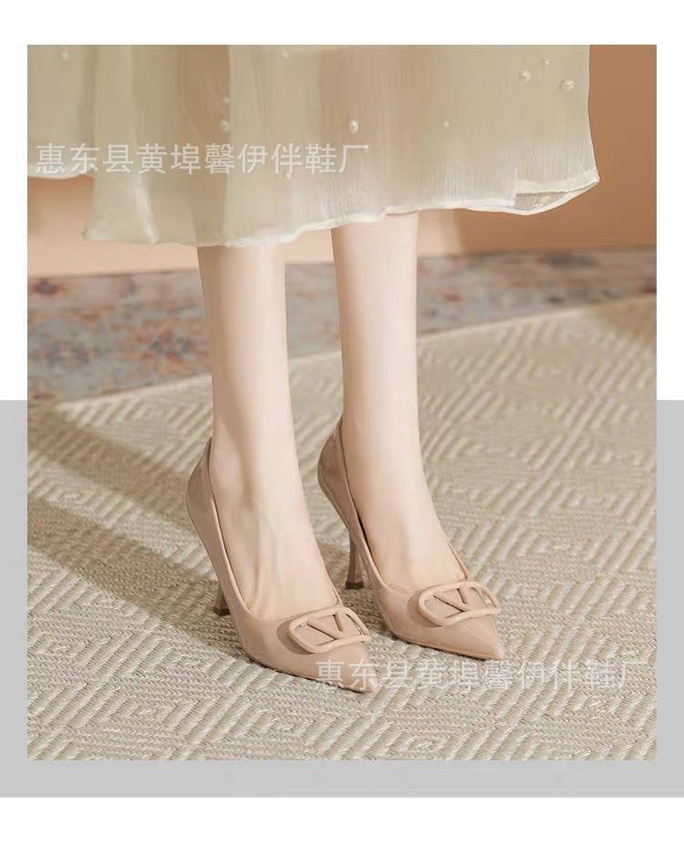 V 버클 하이힐 여성용 스틸레토 힐 2025 봄 새로운 도착 특허 가죽 뾰족한 발가락 아름다운 섹시한 패션 누드 컬러 싱글 레이어 신발 여성 신발스토어 가기