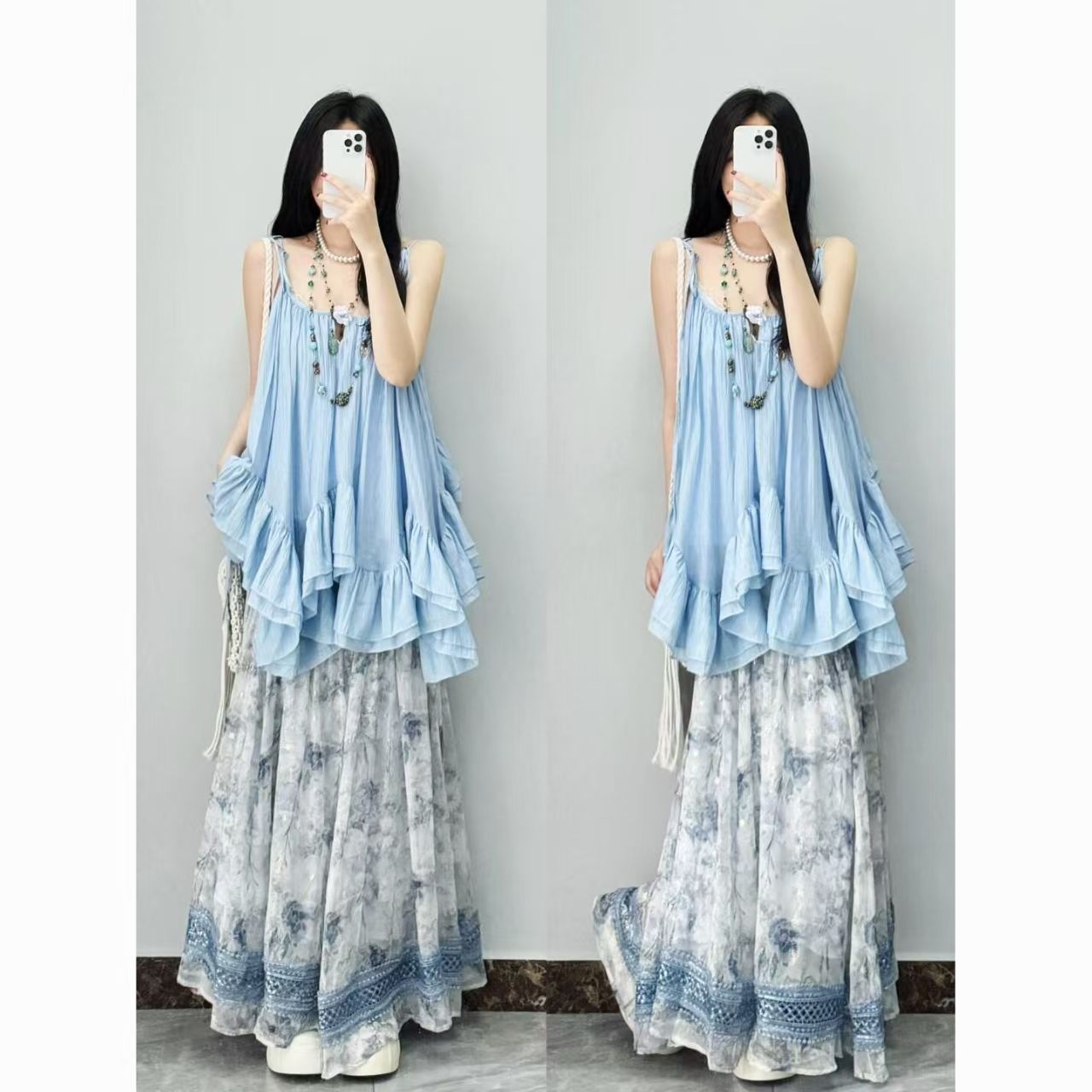 휴가 스타일 세트 여성의 여름 새로운 디자인 센스 레이스 슬립 스커트 스택 넥타이 염색 스커트 투피스 세트 센스스토어 가기