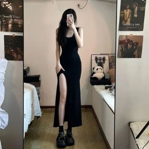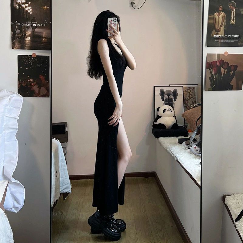 슬링 원피스 2025 새로운 여름 우아한 슬림 슬림 핏 퓨어 스파이스 걸 스플릿 스커트스토어 가기