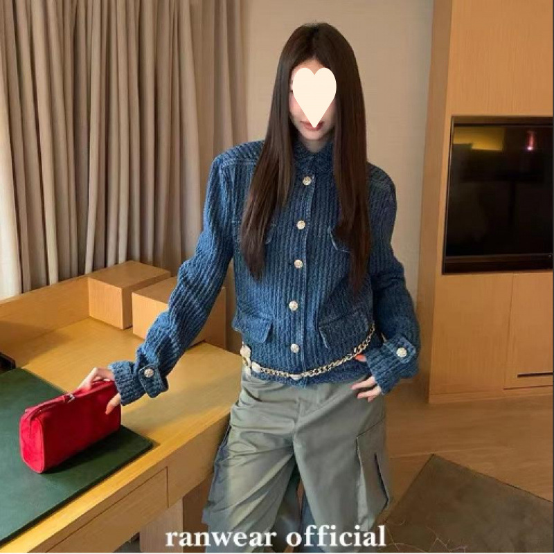 작은 샤넬 스타일 데님 짧은 재킷 2025 봄 새로운 가짜 포켓 디자인 수직 칼라 스트레이트 긴 소매 탑