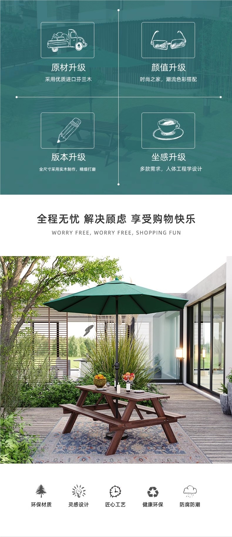 야외 테라스 탈색 나무 테이블과 의자 우산 야외 안뜰 단단한 나무 레저 테이블 야외 방비 방수 선 스크린 긴 테이블