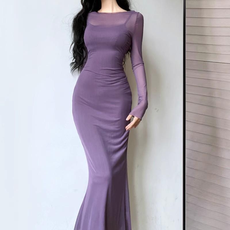가을 2025 년 새로운 여성의 프랑스 관점 메쉬 로얄 자매 스타일 우아한 슬림 핏 슬림 긴 투피스 원피스