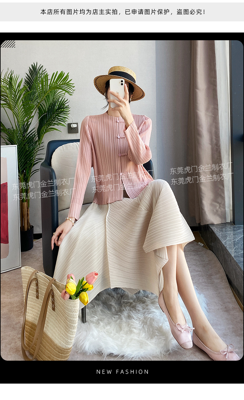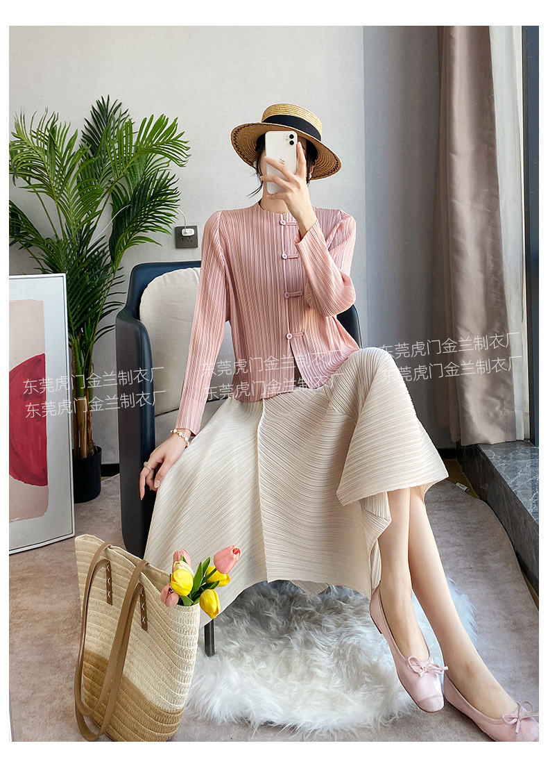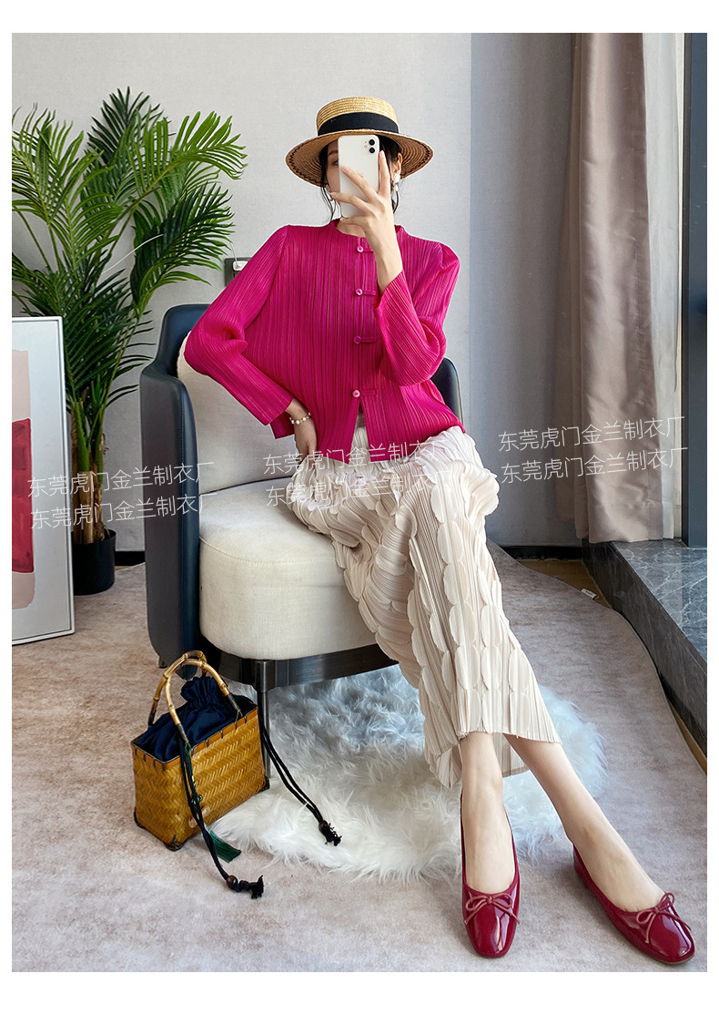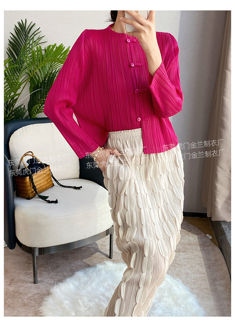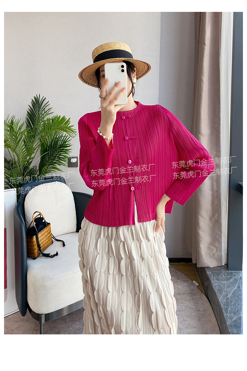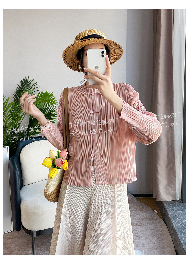 미야케 우아한 라운드 넥 탑 솔리드 컬러 셔츠 느슨한 중국 복고풍 여성의 봄과 여름 주름 국경 셔츠