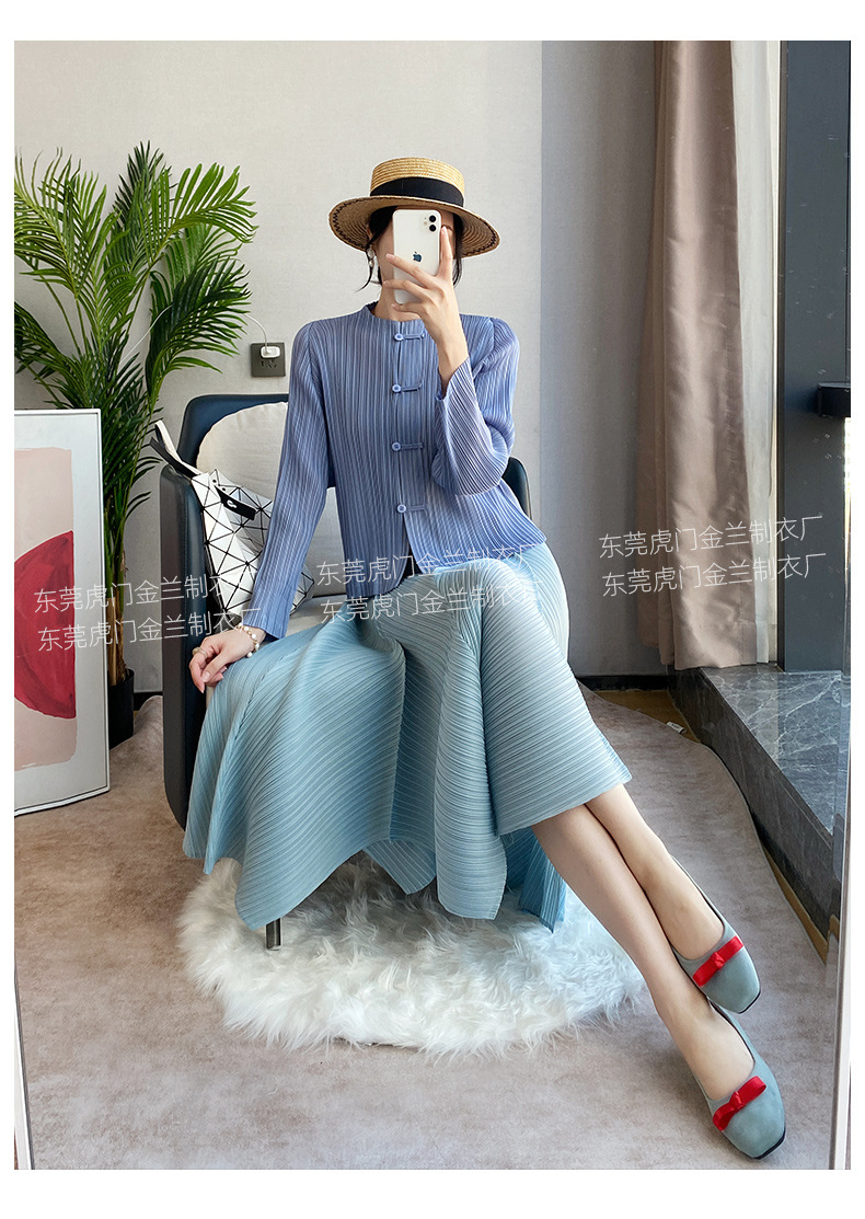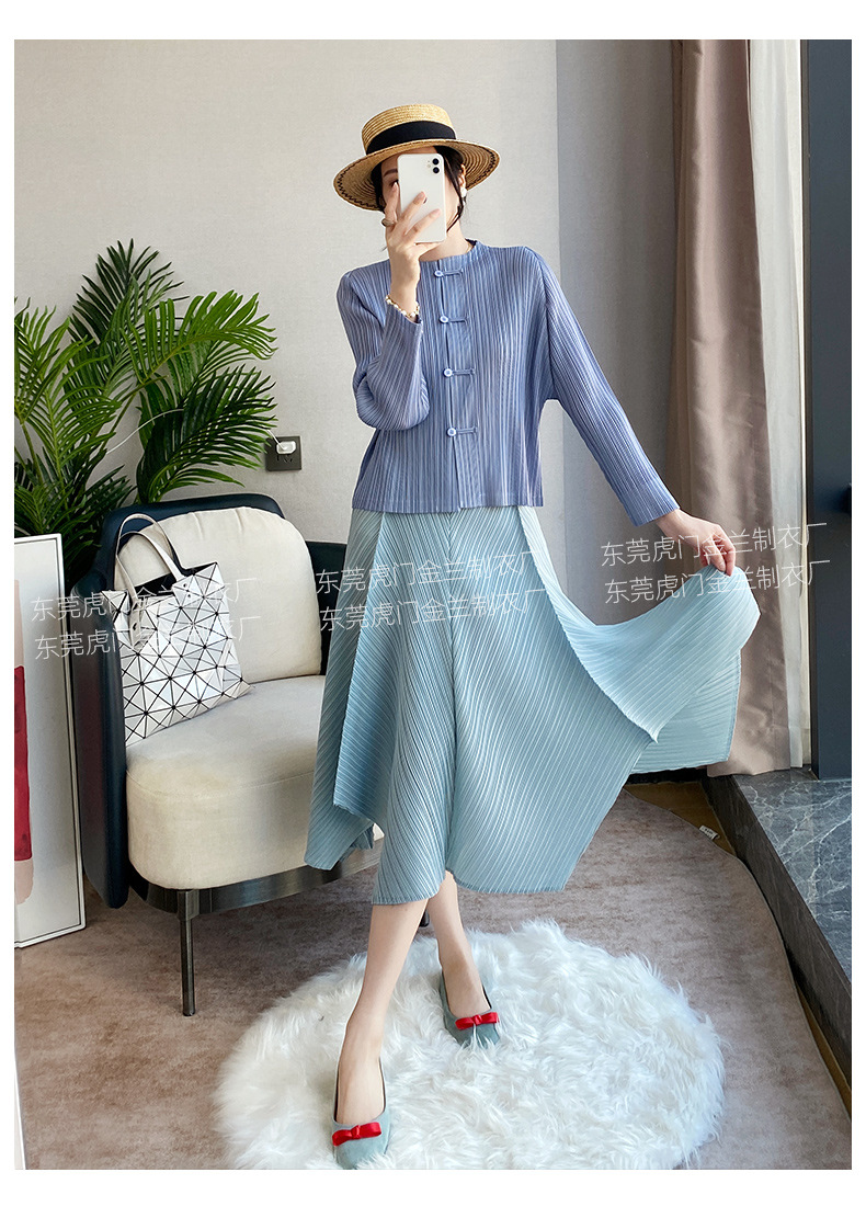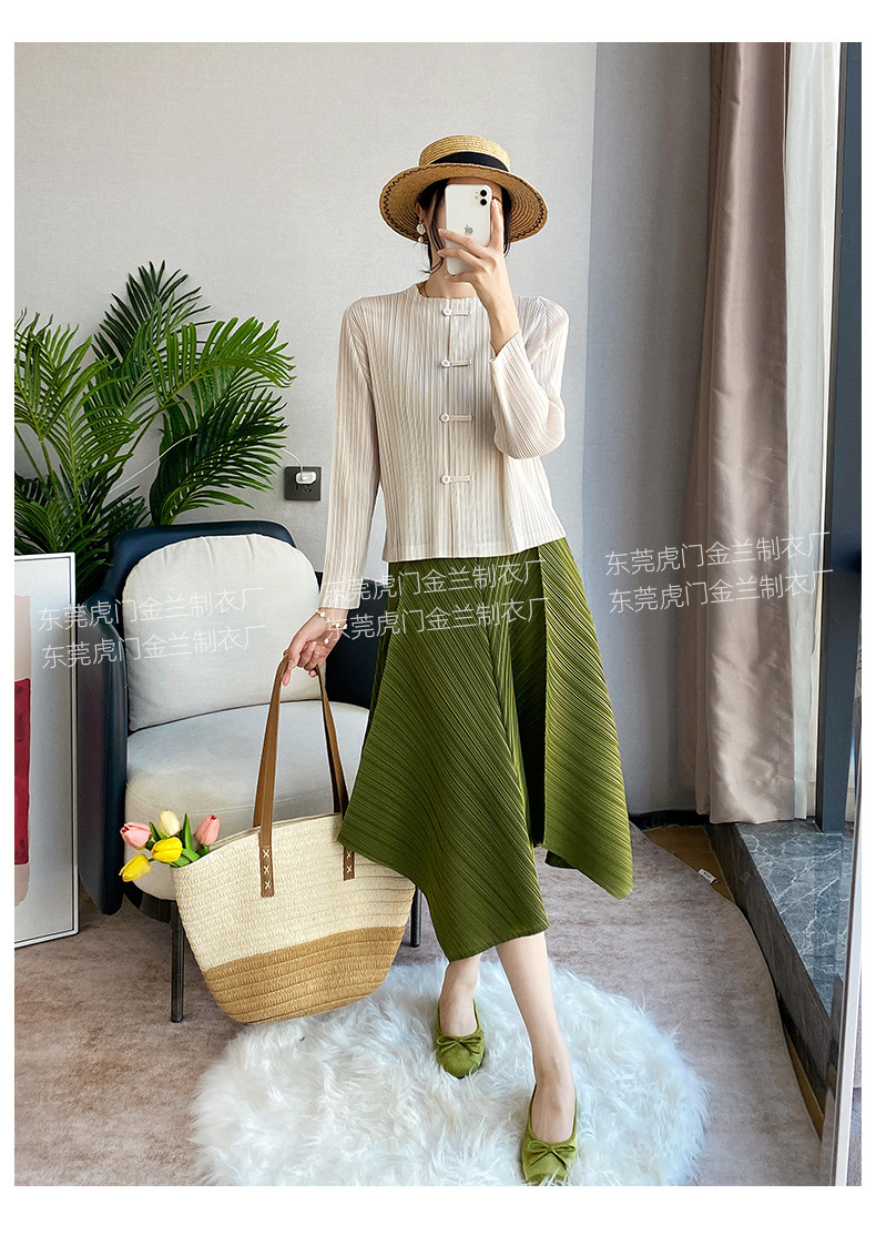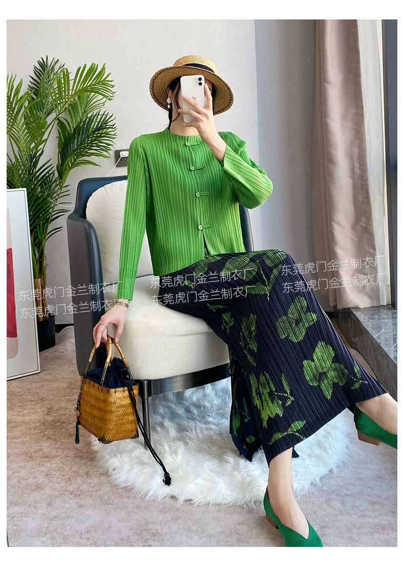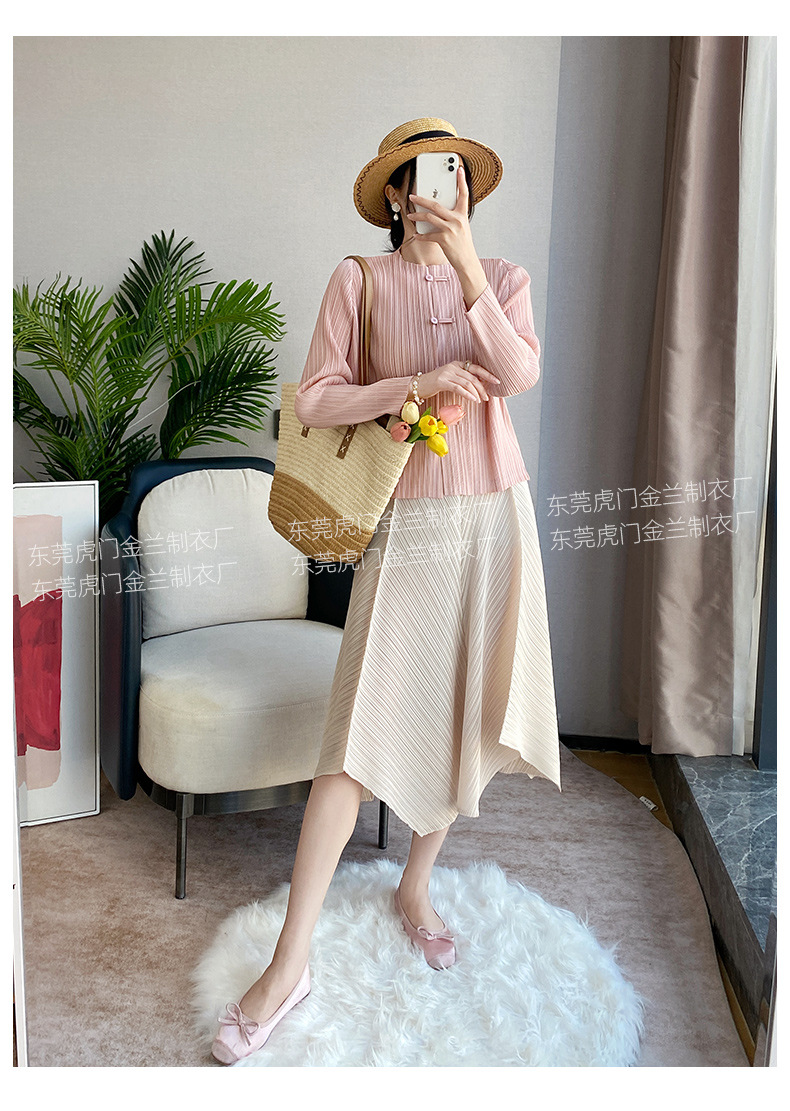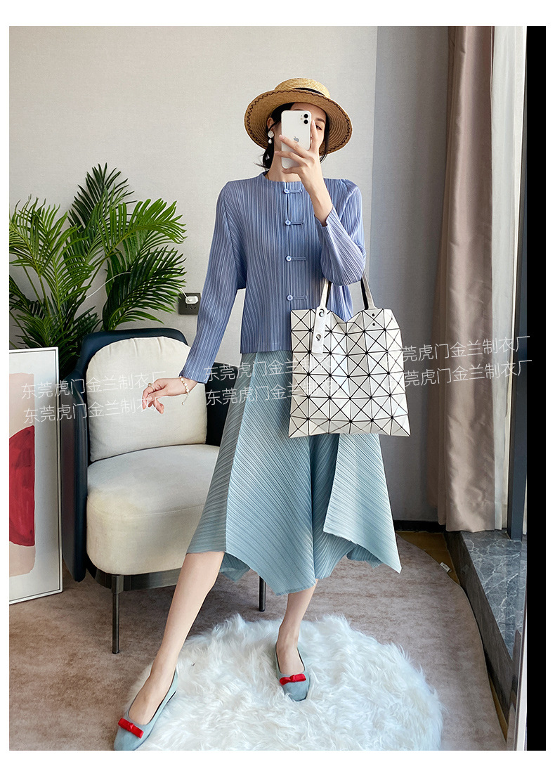 미야케 우아한 라운드 넥 탑 솔리드 컬러 셔츠 느슨한 중국 복고풍 여성의 봄과 여름 주름 국경 셔츠