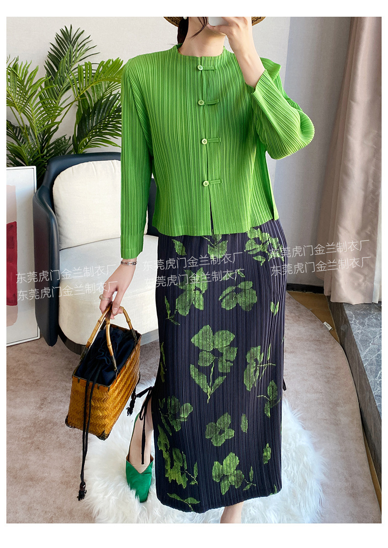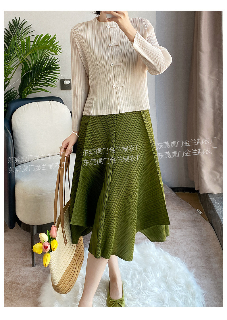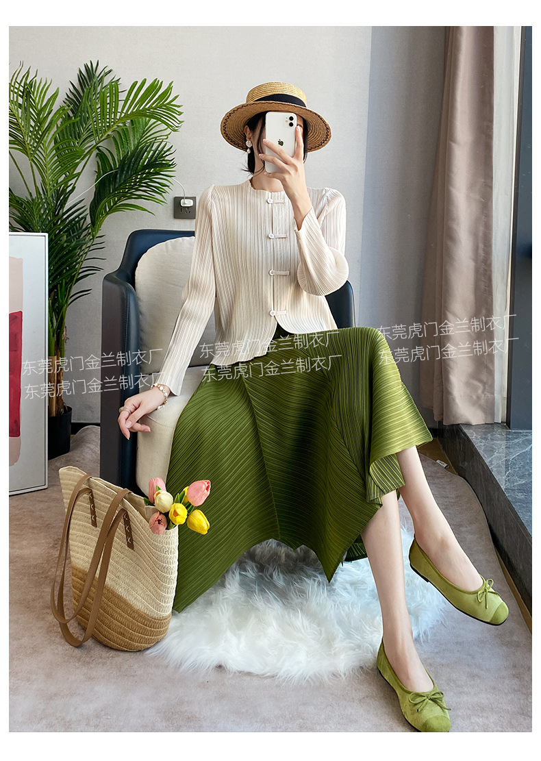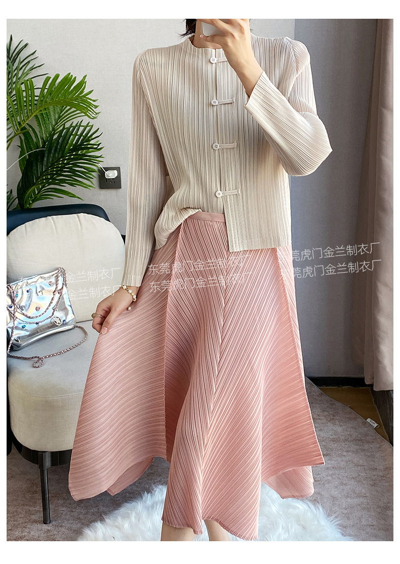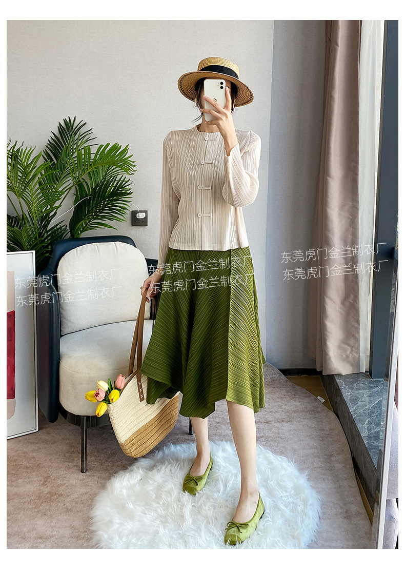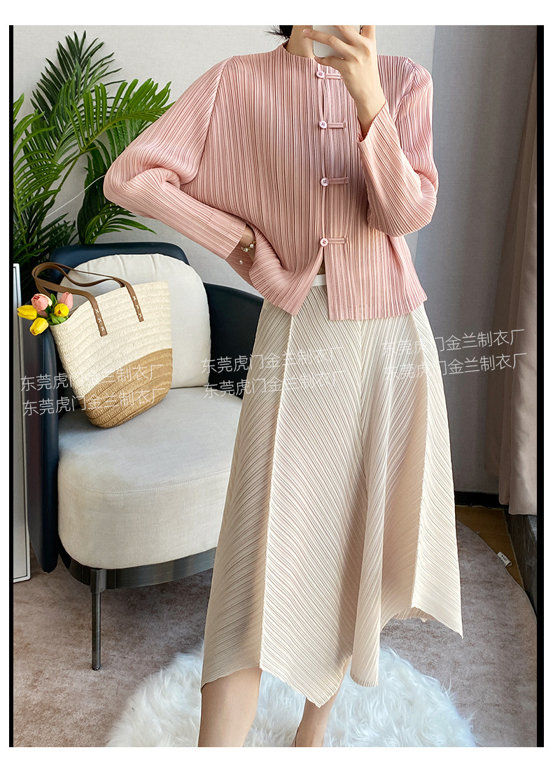 미야케 우아한 라운드 넥 탑 솔리드 컬러 셔츠 느슨한 중국 복고풍 여성의 봄과 여름 주름 국경 셔츠
