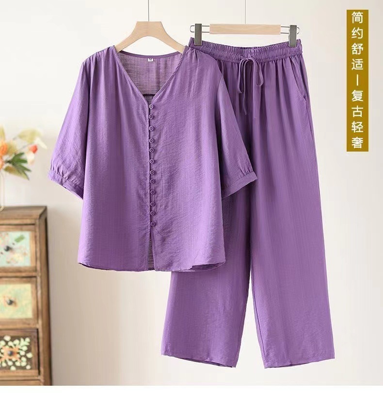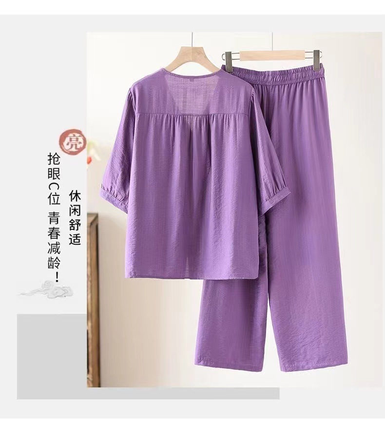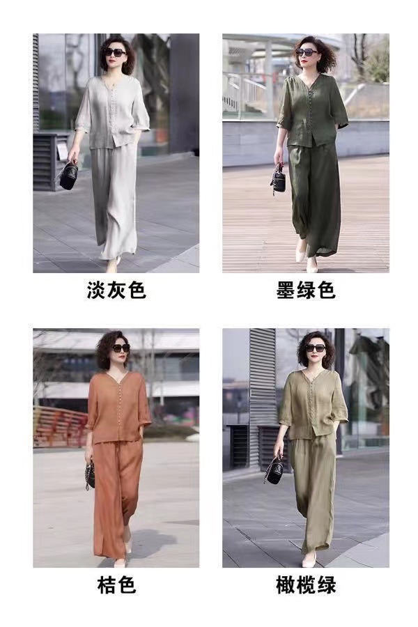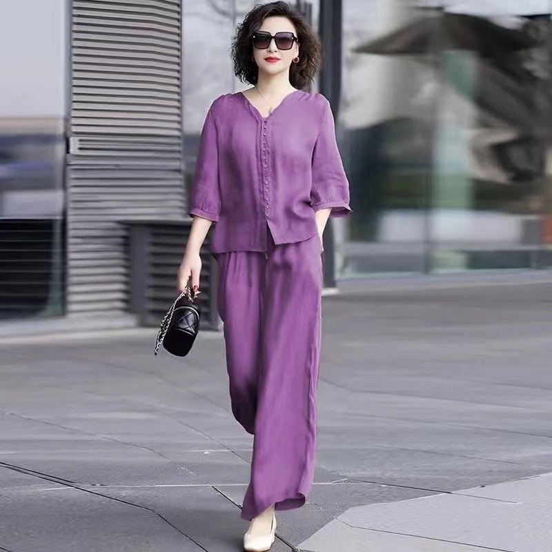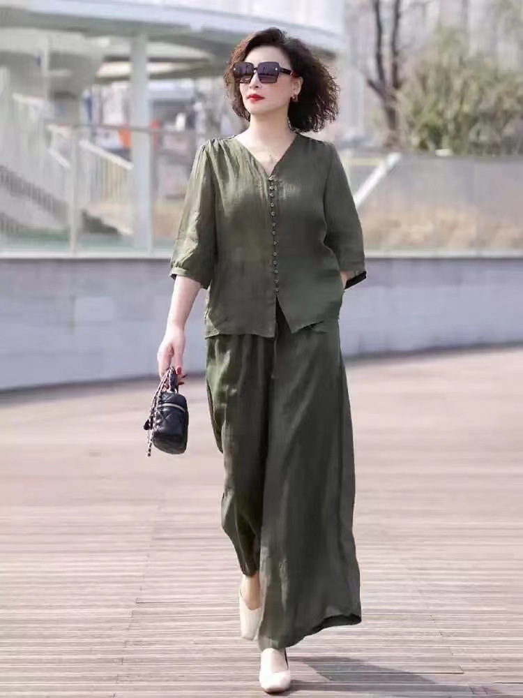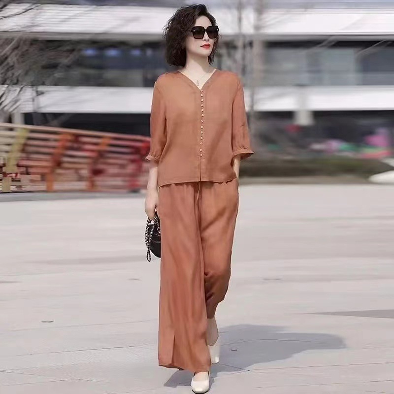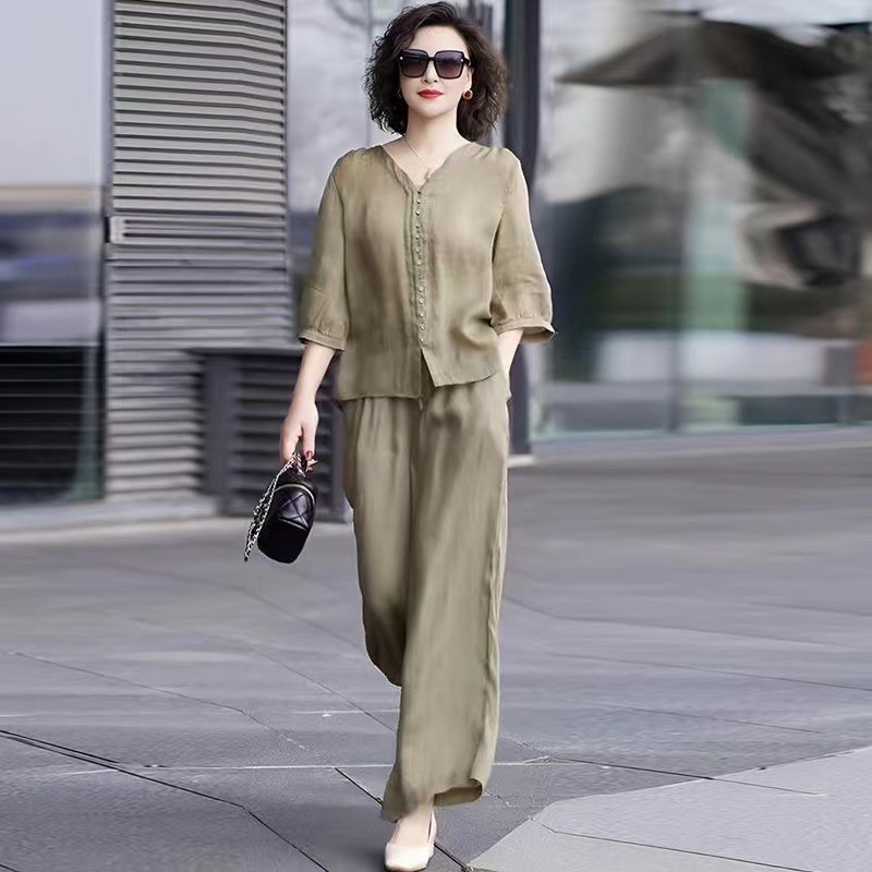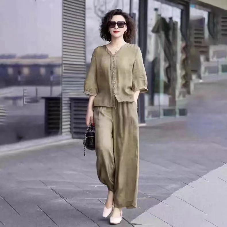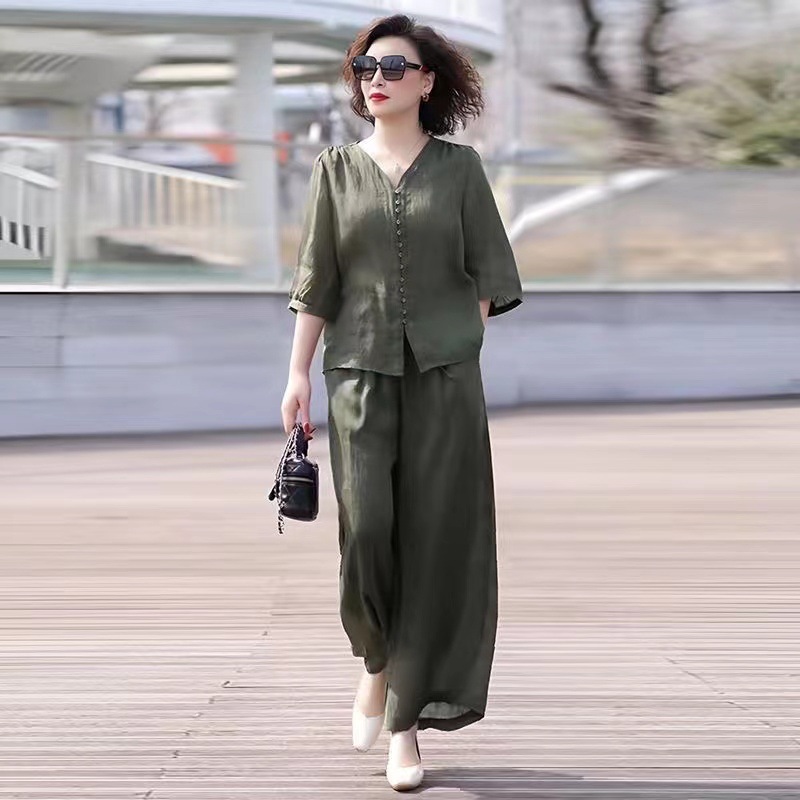 Gastrodia 세트 여성 2025 새로운 여름 캐주얼 한국 스타일 중년 어머니의 칼라 와이드 다리 바지 투피스 세트스토어 가기