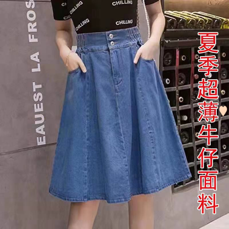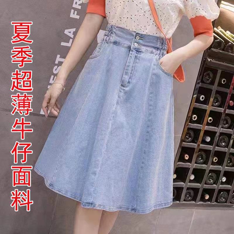 봄 데님 치마 여성 플러스 사이즈 높은 허리 높은 허리 글로스트 허리 중간 길이의 주름 치마스토어 가기