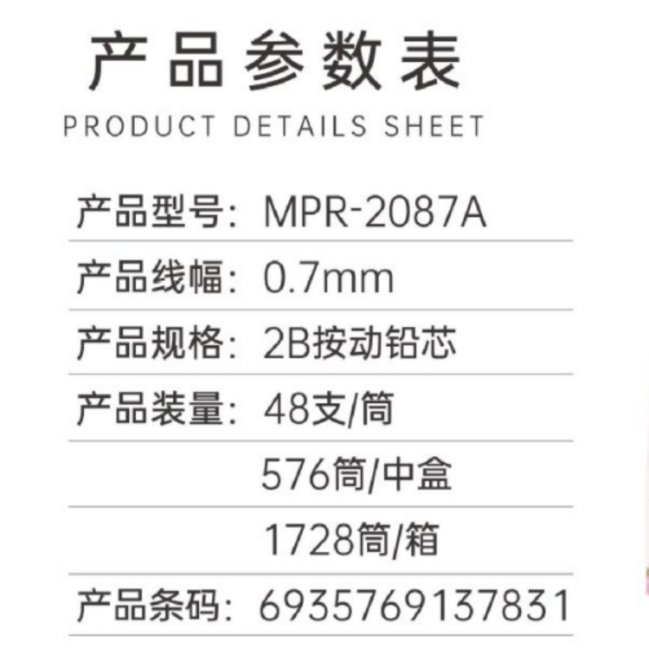 Chenqi MPR-2087A 액티브 리드 리필 자동 리드 리필 2B 리필 0.7mm 학생 자동 연필