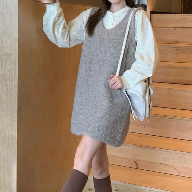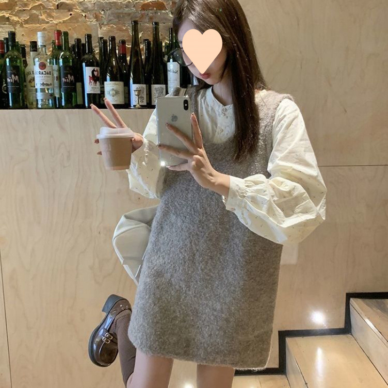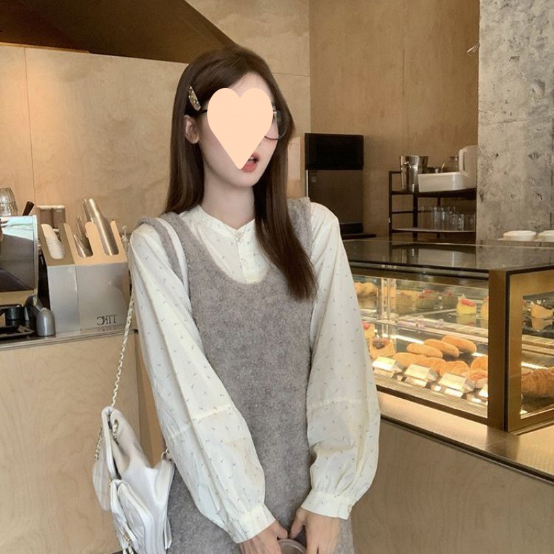 한국식 느슨한 꽃 긴팔 셔츠 단색 니트 조끼 원피스 봄 새로운 패션 투피스 세트스토어 가기