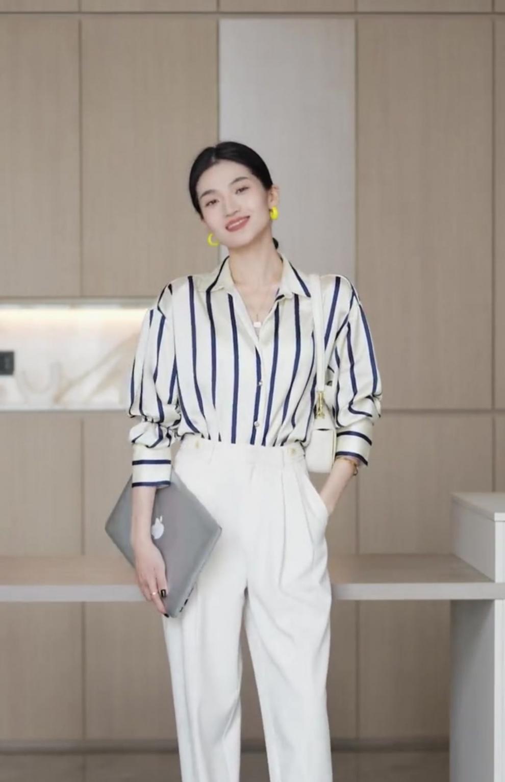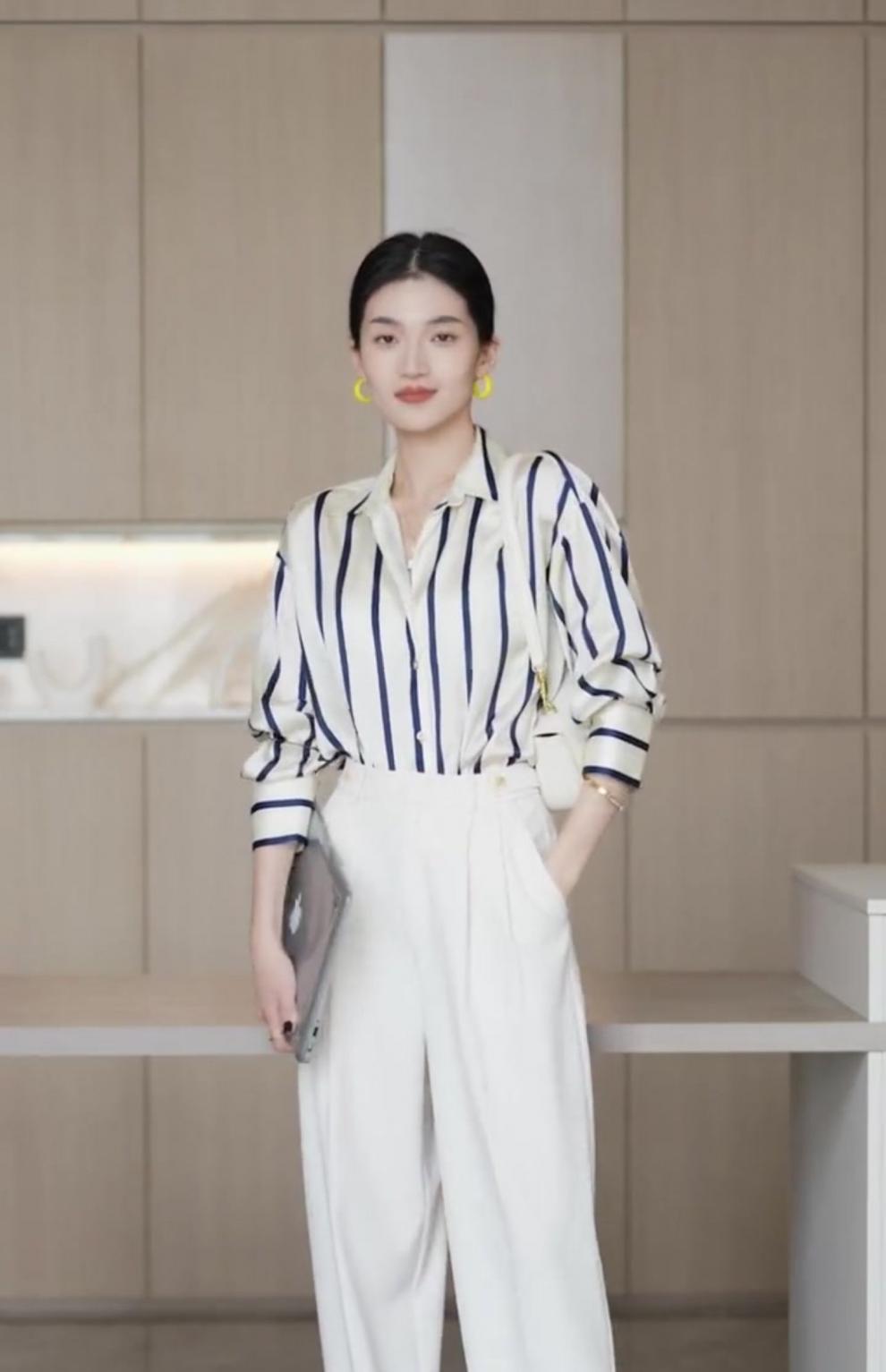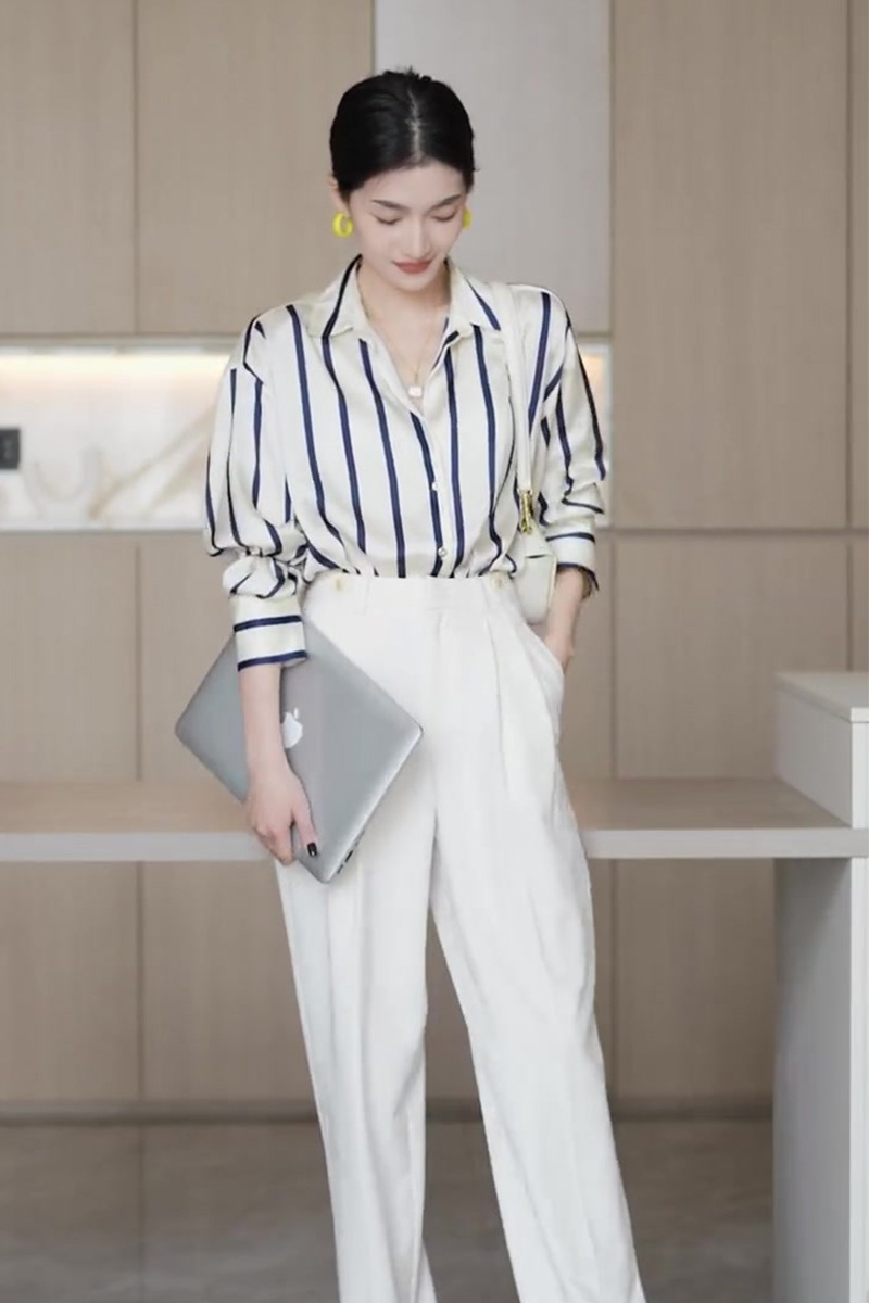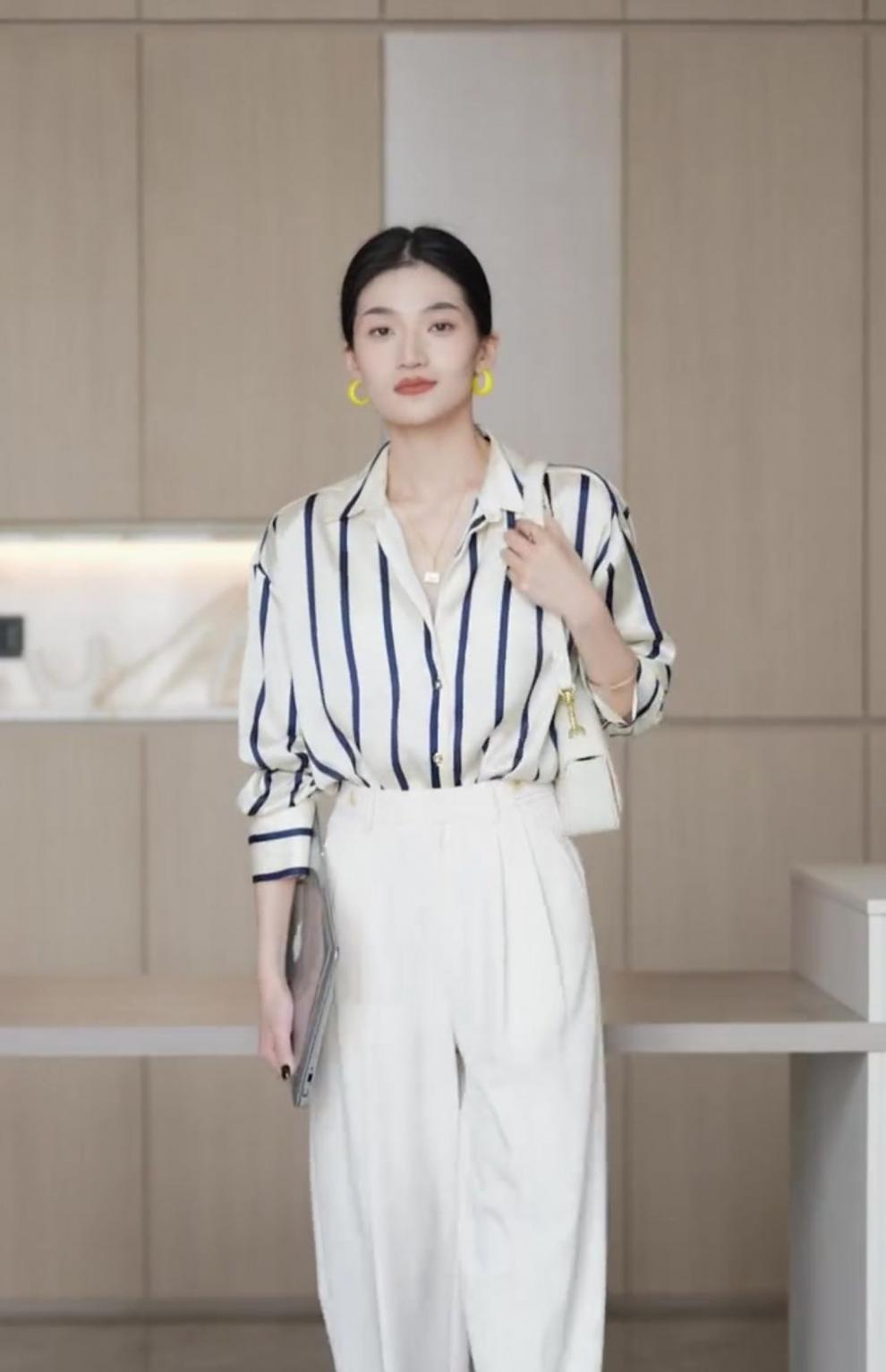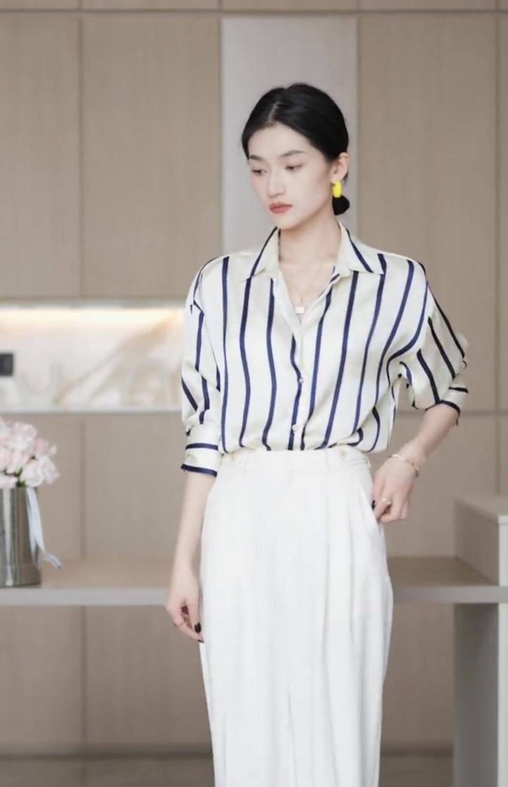 Acetic Acid Satin 줄무늬 셔츠 여성의 봄과 가을 2025 새로운 디자인 센스 틈새 쉬폰 탑 올 매치 셔츠 여자스토어 가기