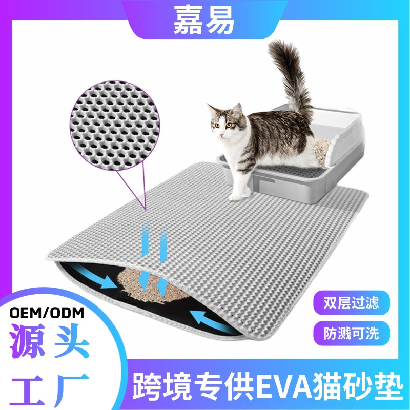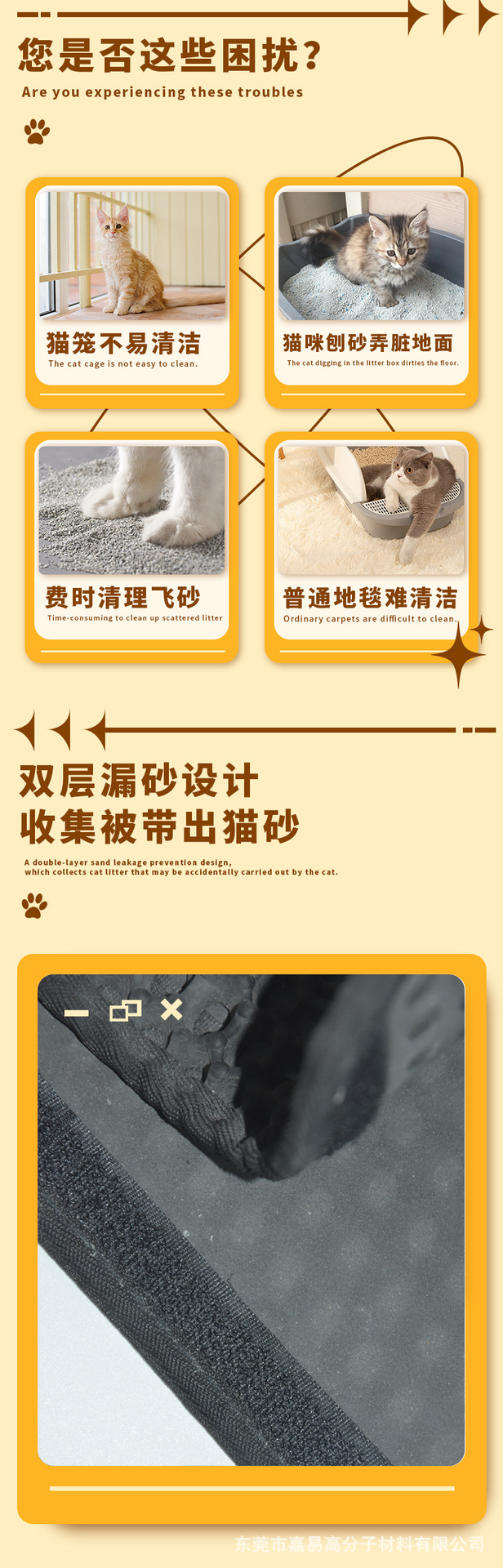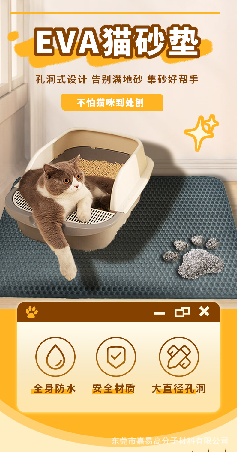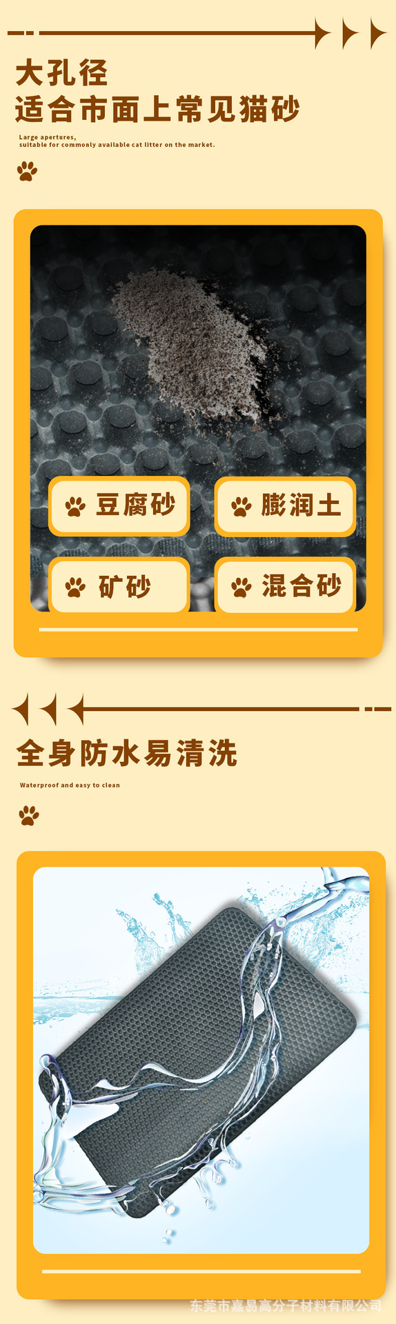 产品功能:适用95%以上种类的猫砂,上层通孔材料,猫砂可轻易通过,下层防水材质,猫砂、小便等脏物可聚集于此。猫砂垫为上下双层设计:上层采用六角形的洞孔凹凸设计,除了让猫砂落入后不再溅出外,圆球型的柔滑触感也可以避免猫咪抓坏,下层垫密封专门存放猫砂,底部设计成规则性的圆孔,有效防滑避免横冲直撞的猫咪滑到受伤。