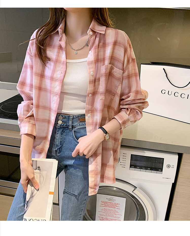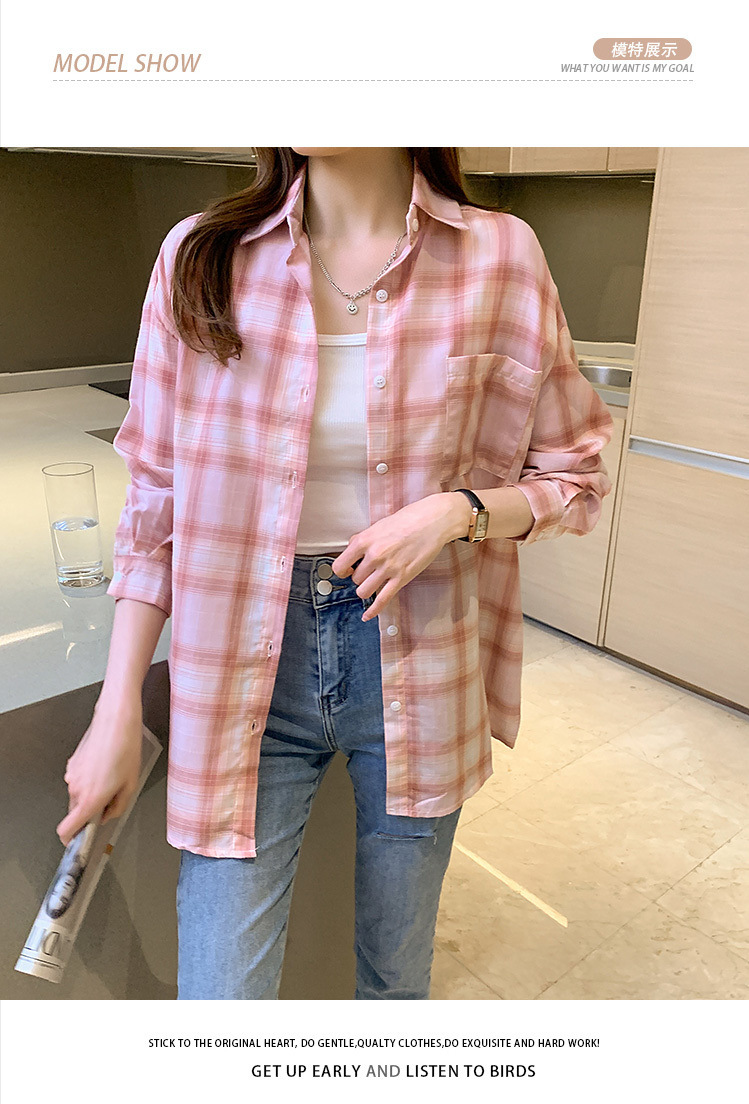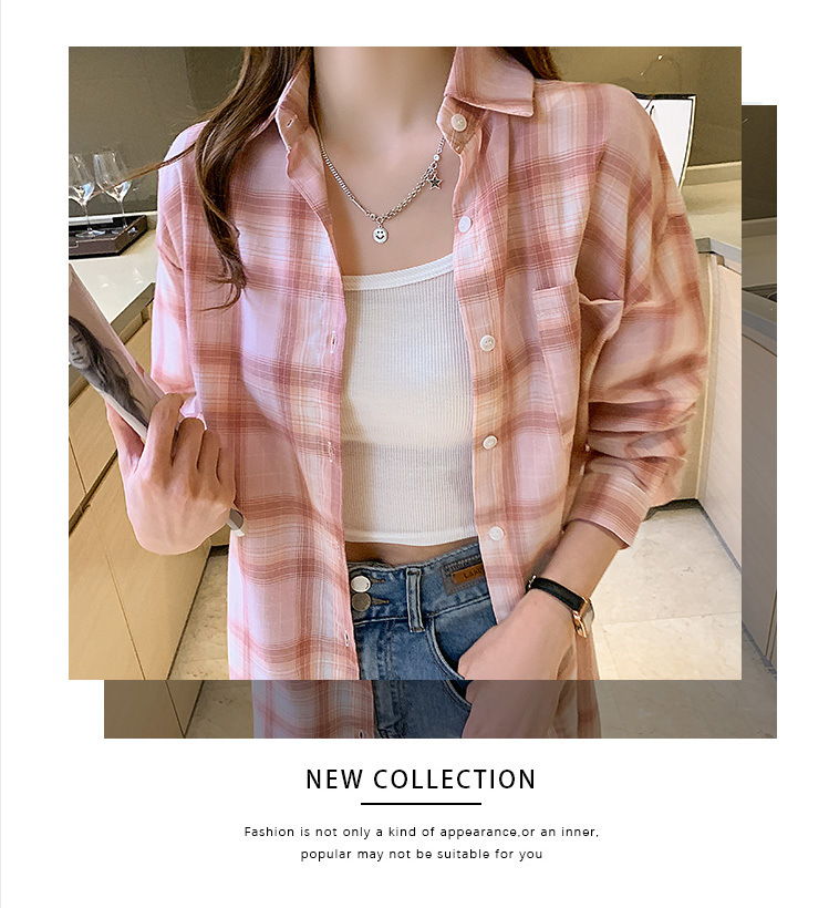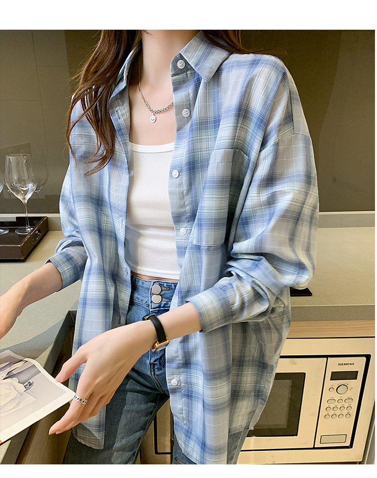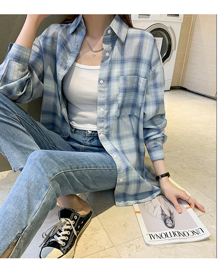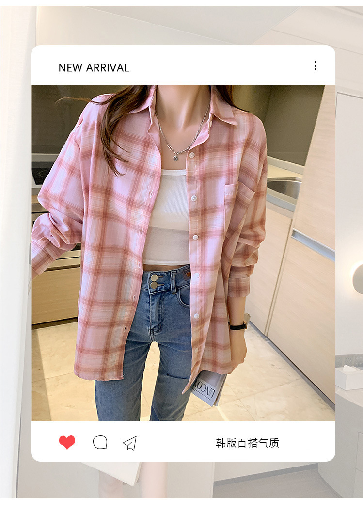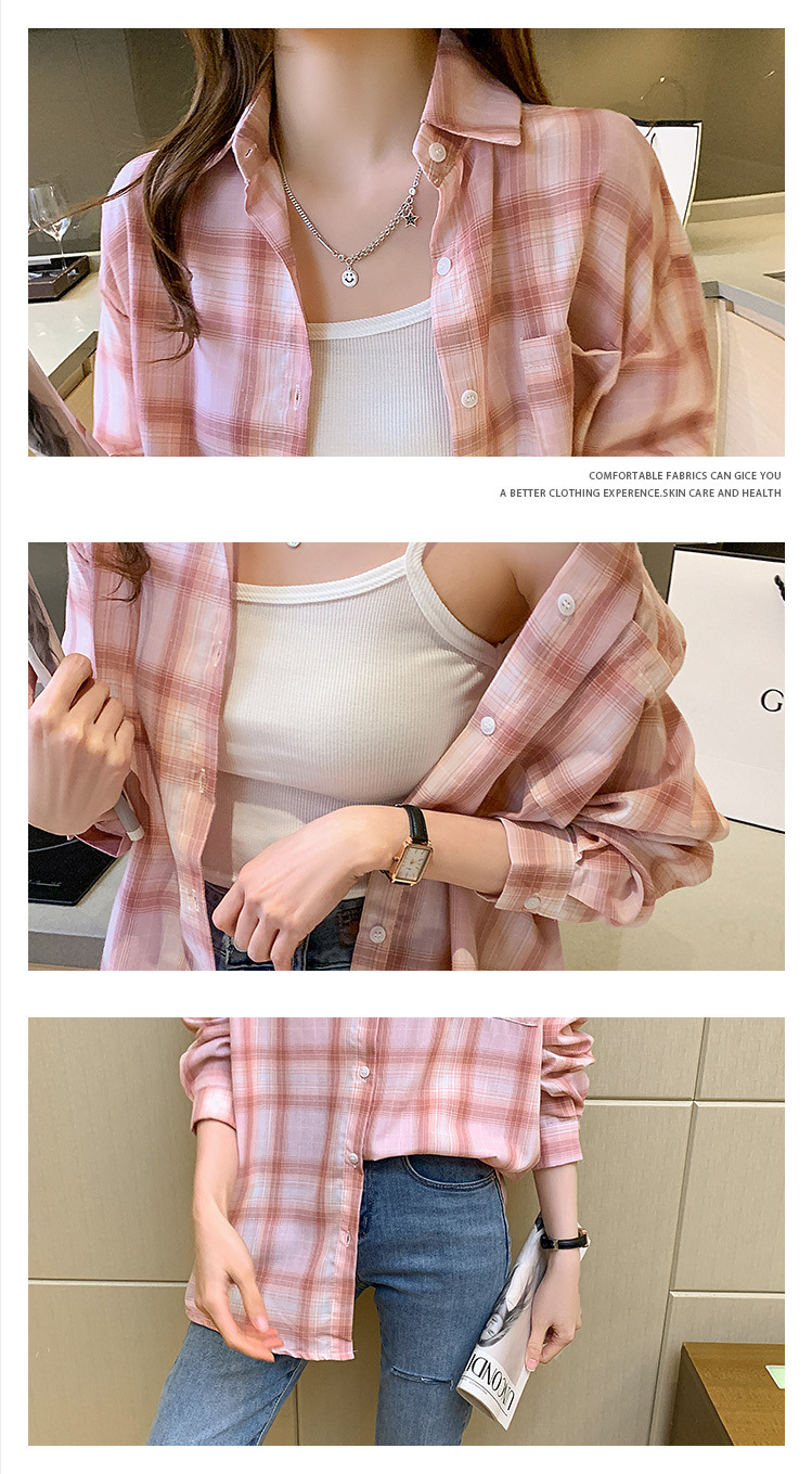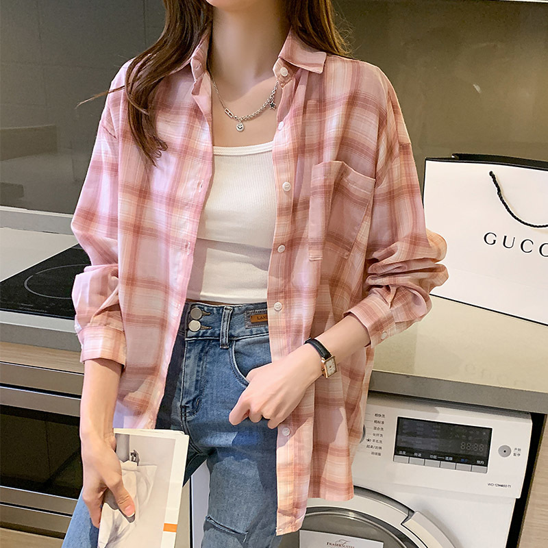 태양 보호 의류 여성용 격자 무늬 셔츠 외부 얇은 코트 탑 느슨한 올매치 숄을 입고 여름 에어컨 셔츠 여성용 긴 소매
