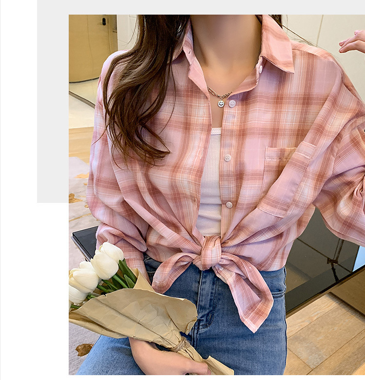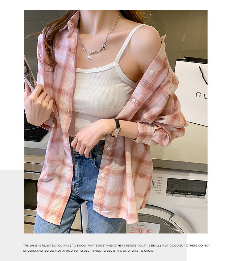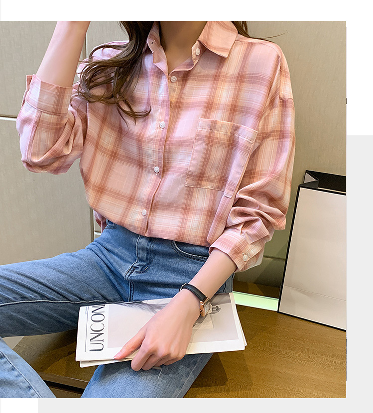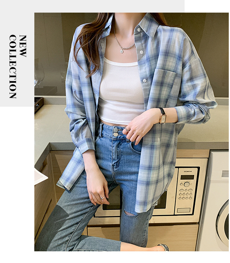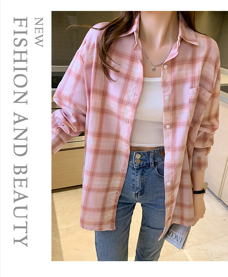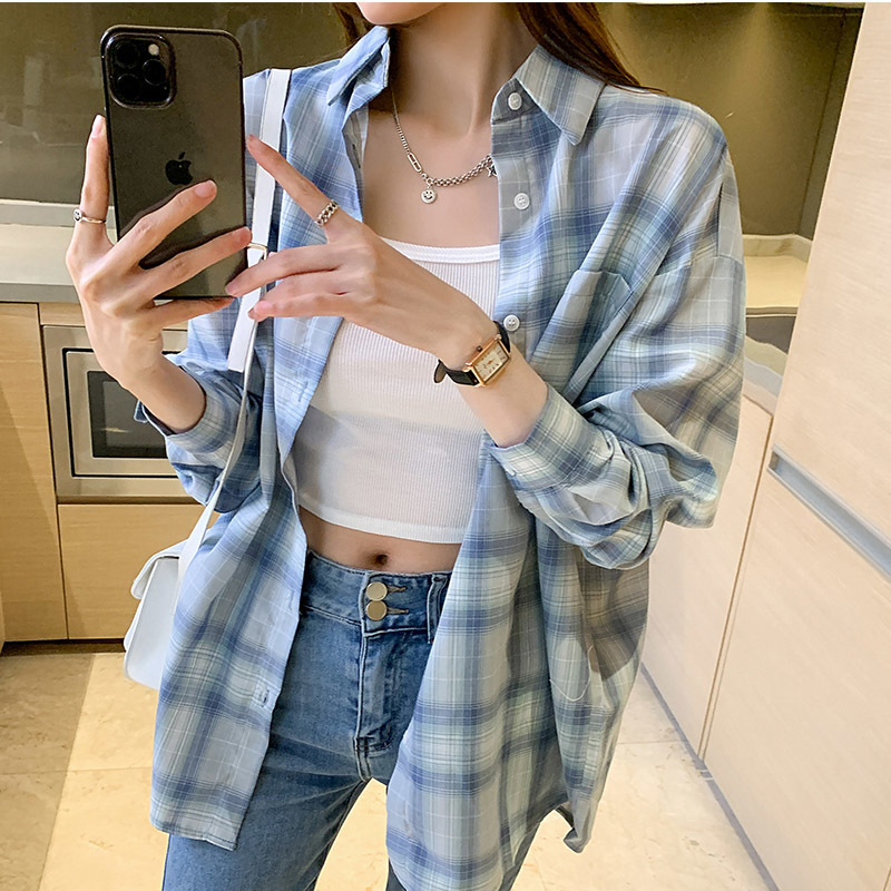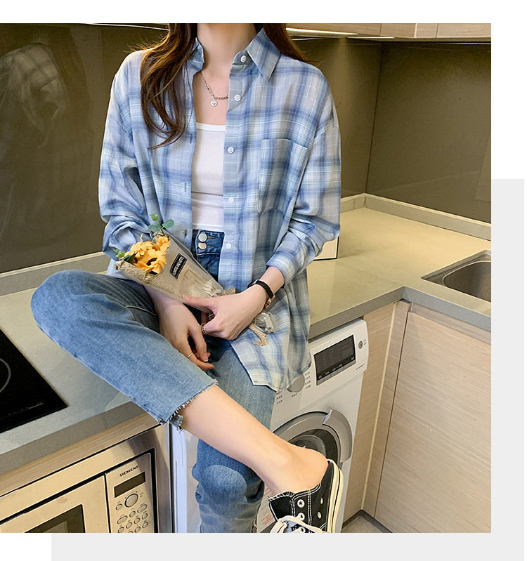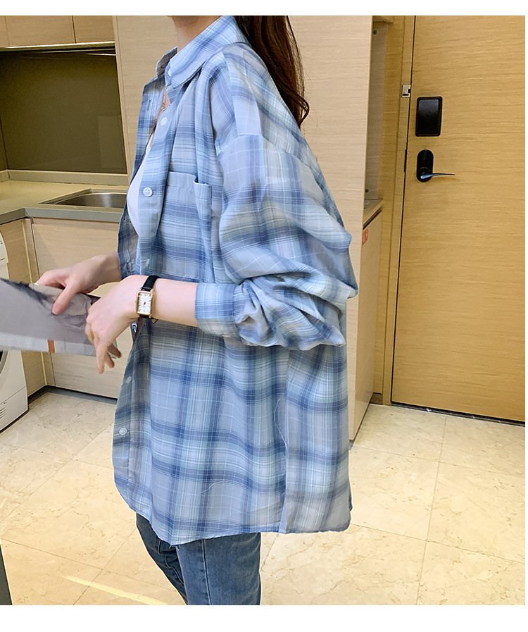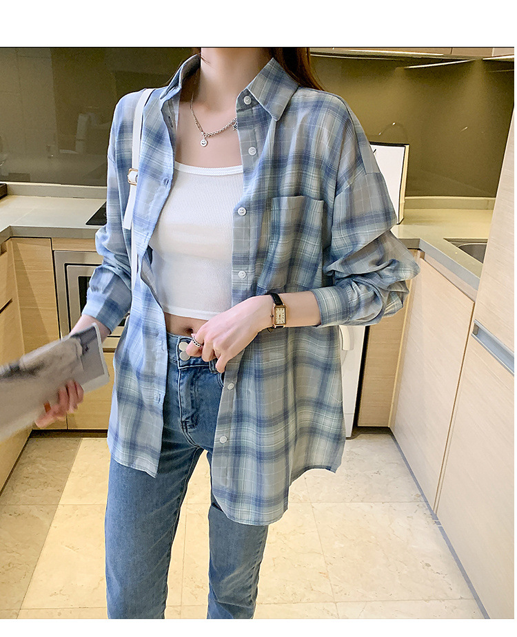 태양 보호 의류 여성용 격자 무늬 셔츠 외부 얇은 코트 탑 느슨한 올매치 숄을 입고 여름 에어컨 셔츠 여성용 긴 소매