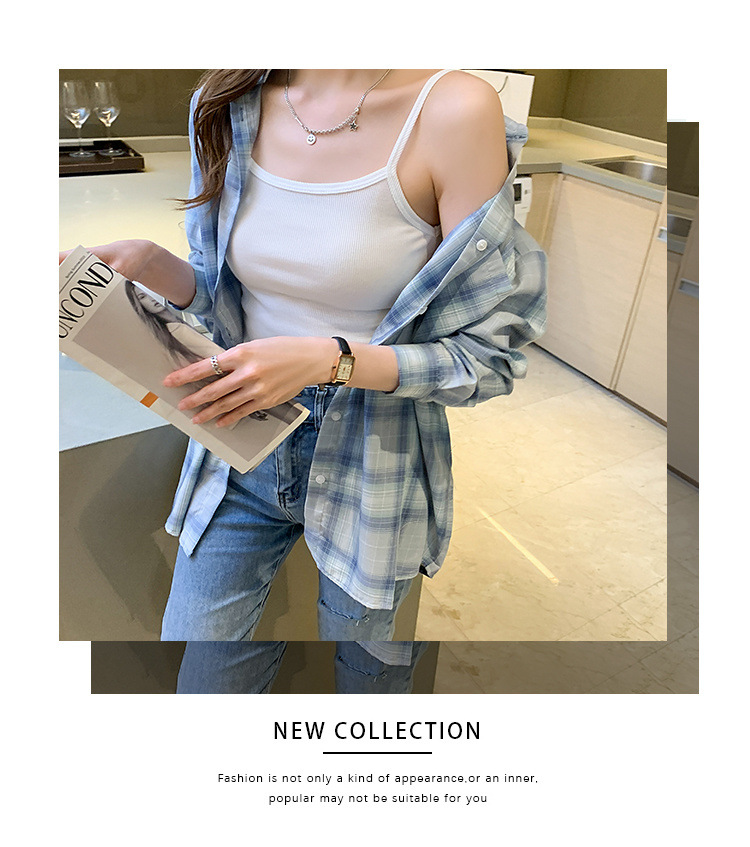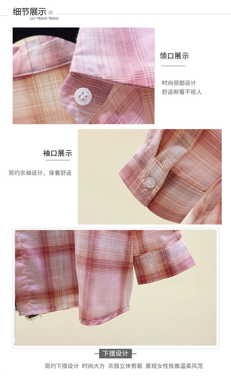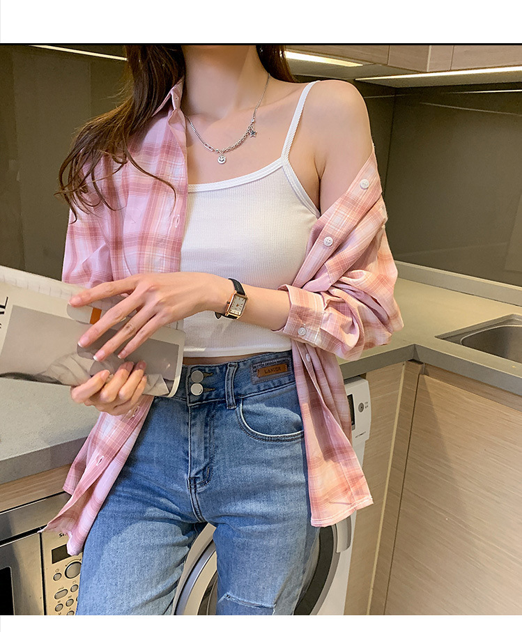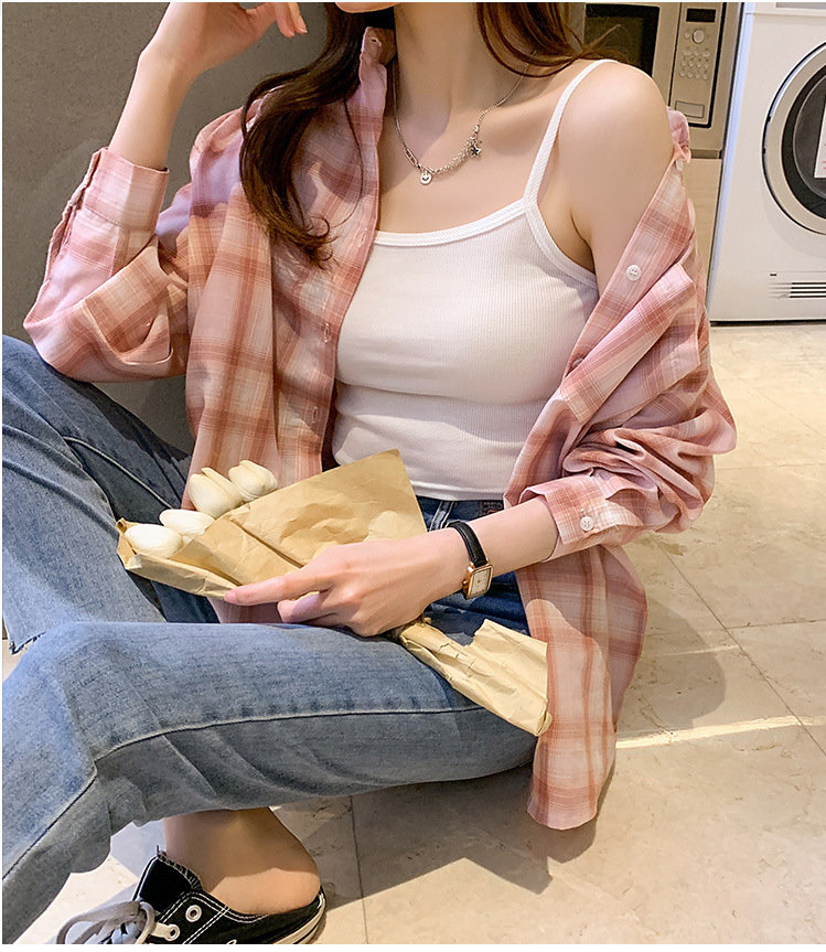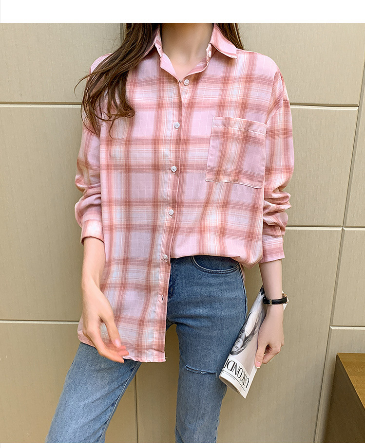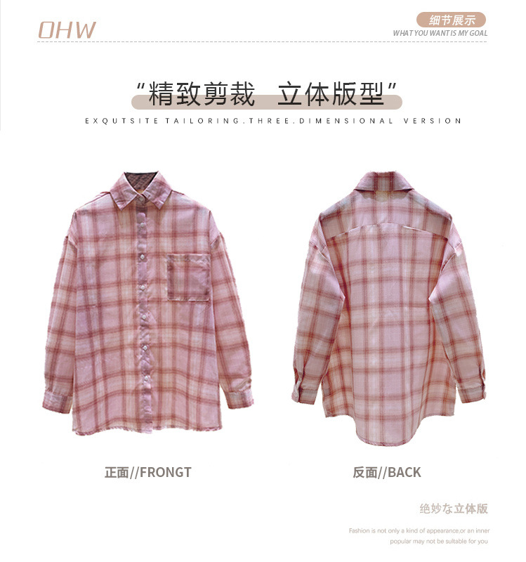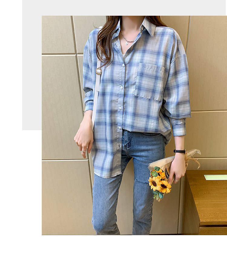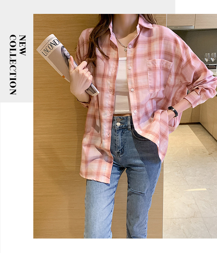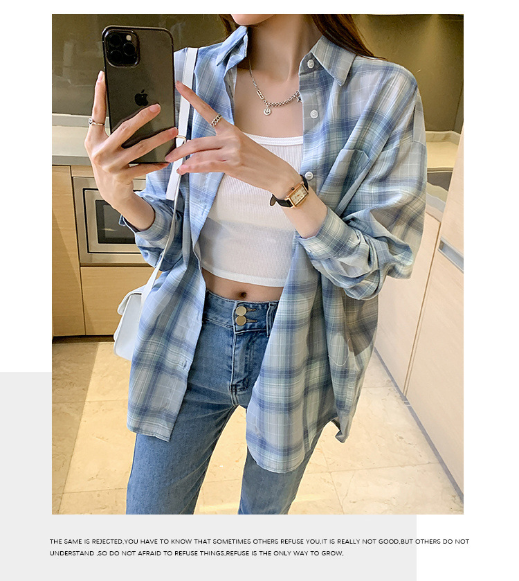 태양 보호 의류 여성용 격자 무늬 셔츠 외부 얇은 코트 탑 느슨한 올매치 숄을 입고 여름 에어컨 셔츠 여성용 긴 소매