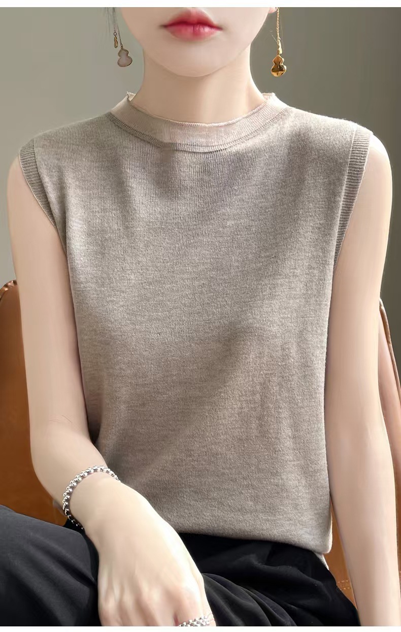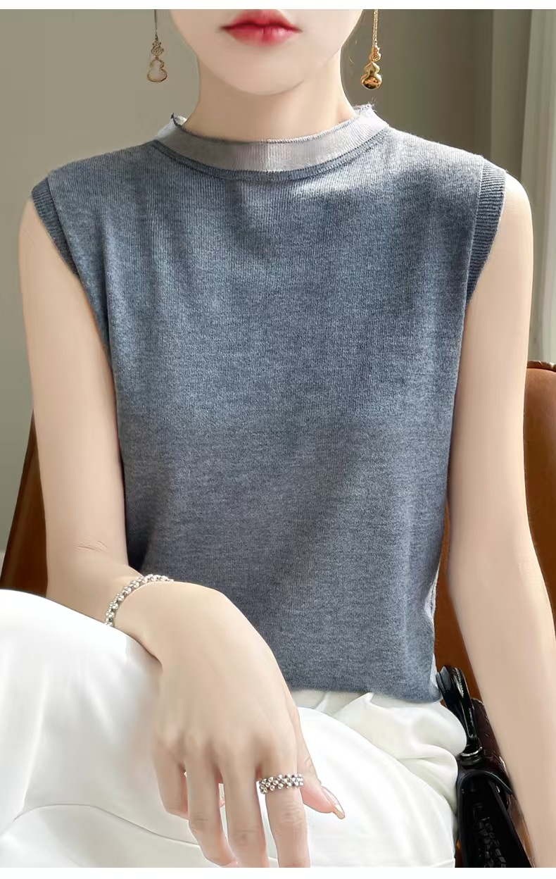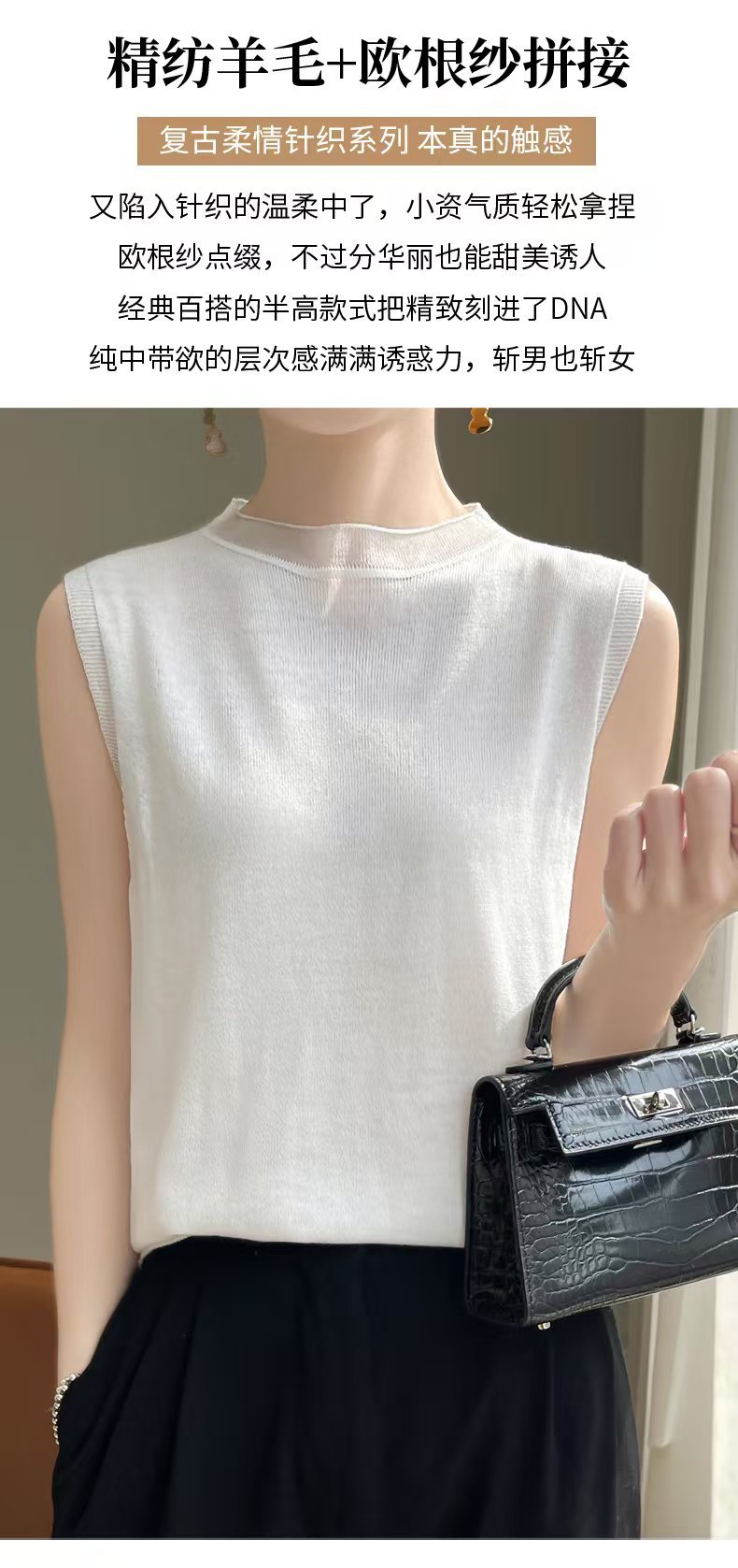 오간자 바느질 민소매 조끼 여성용 티셔츠 느슨한 울 니트 셔츠 짧은 소매 내베이스 셔츠 탑