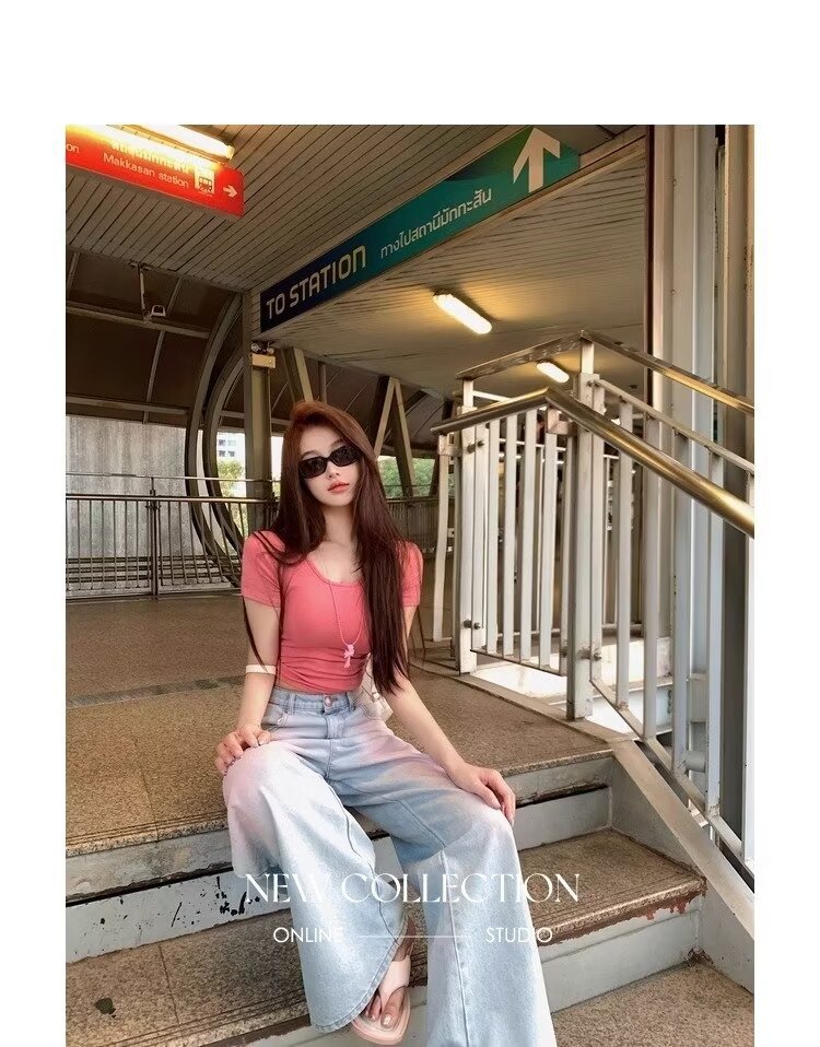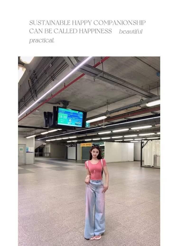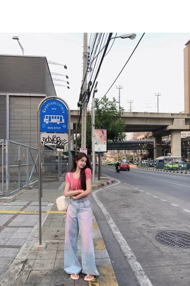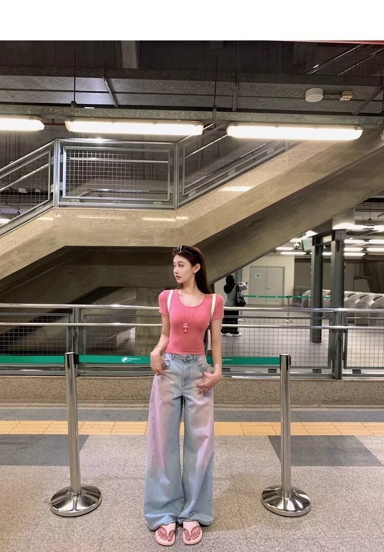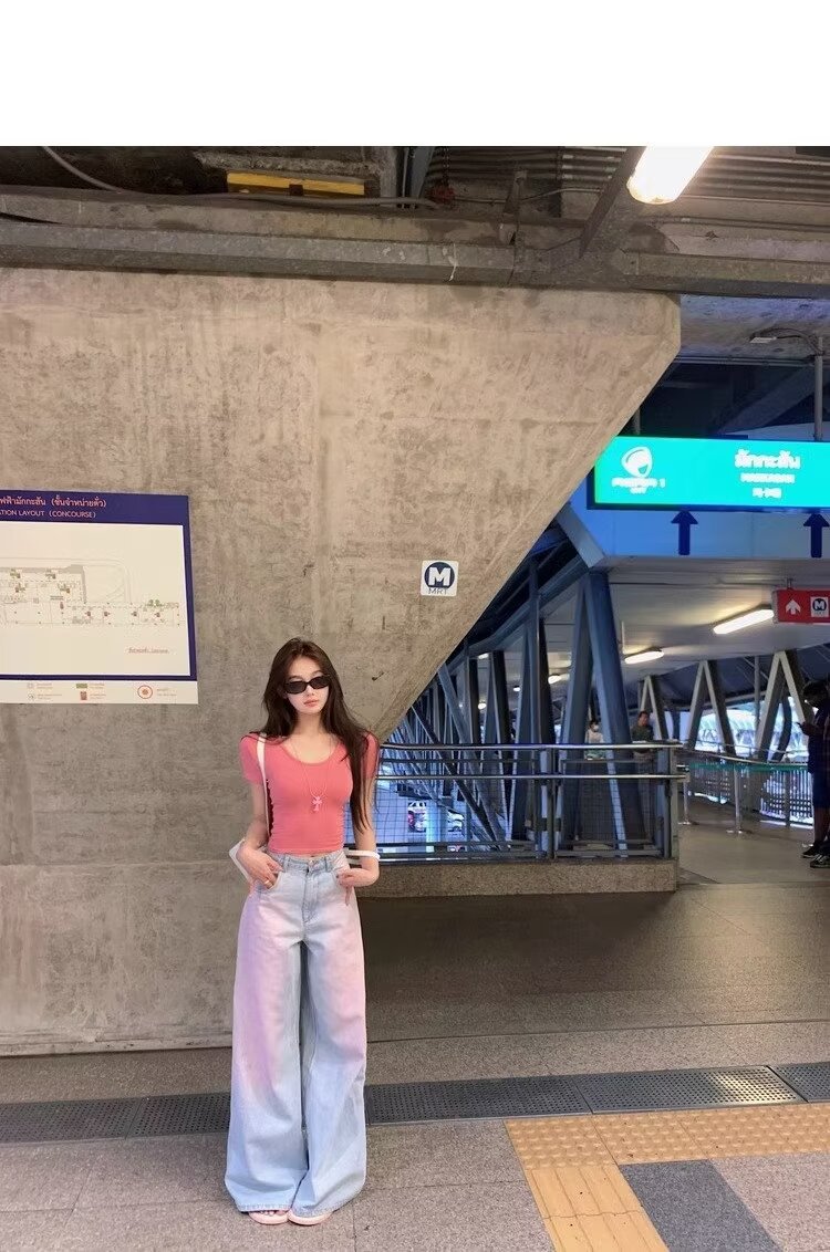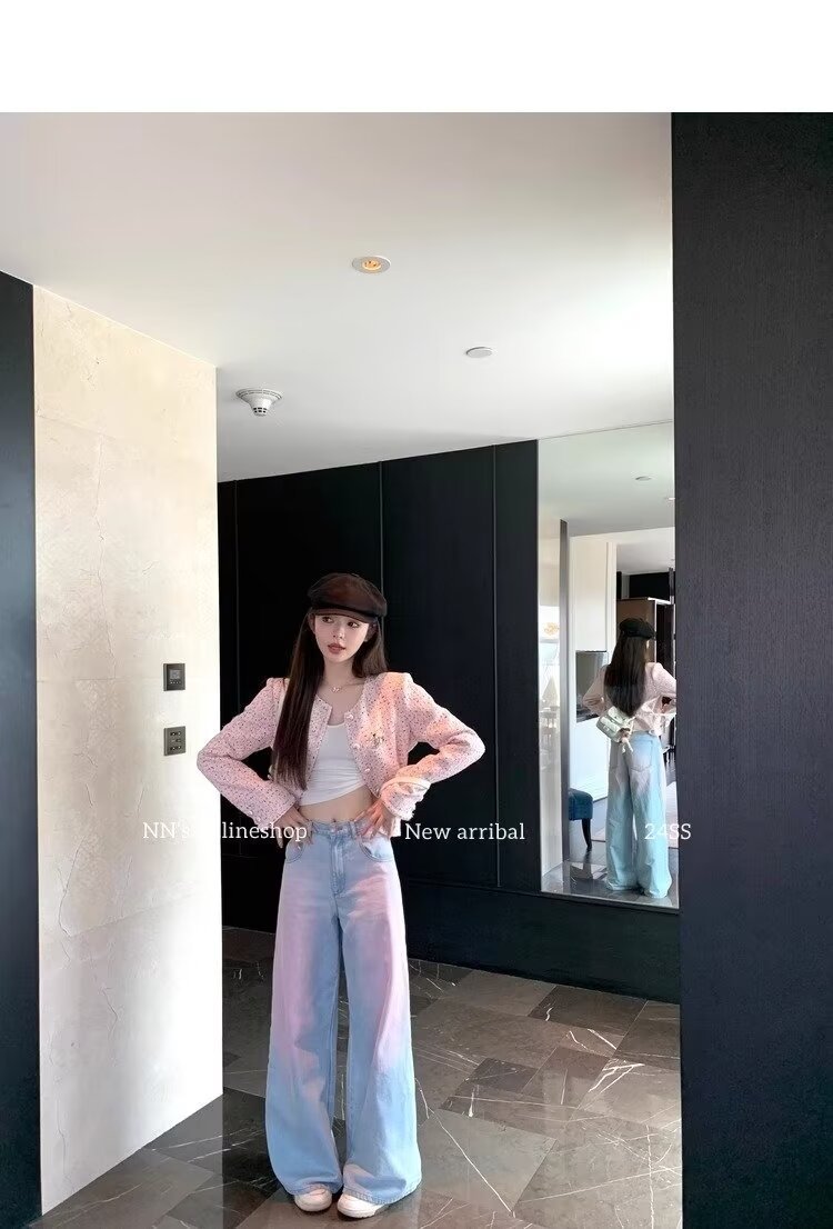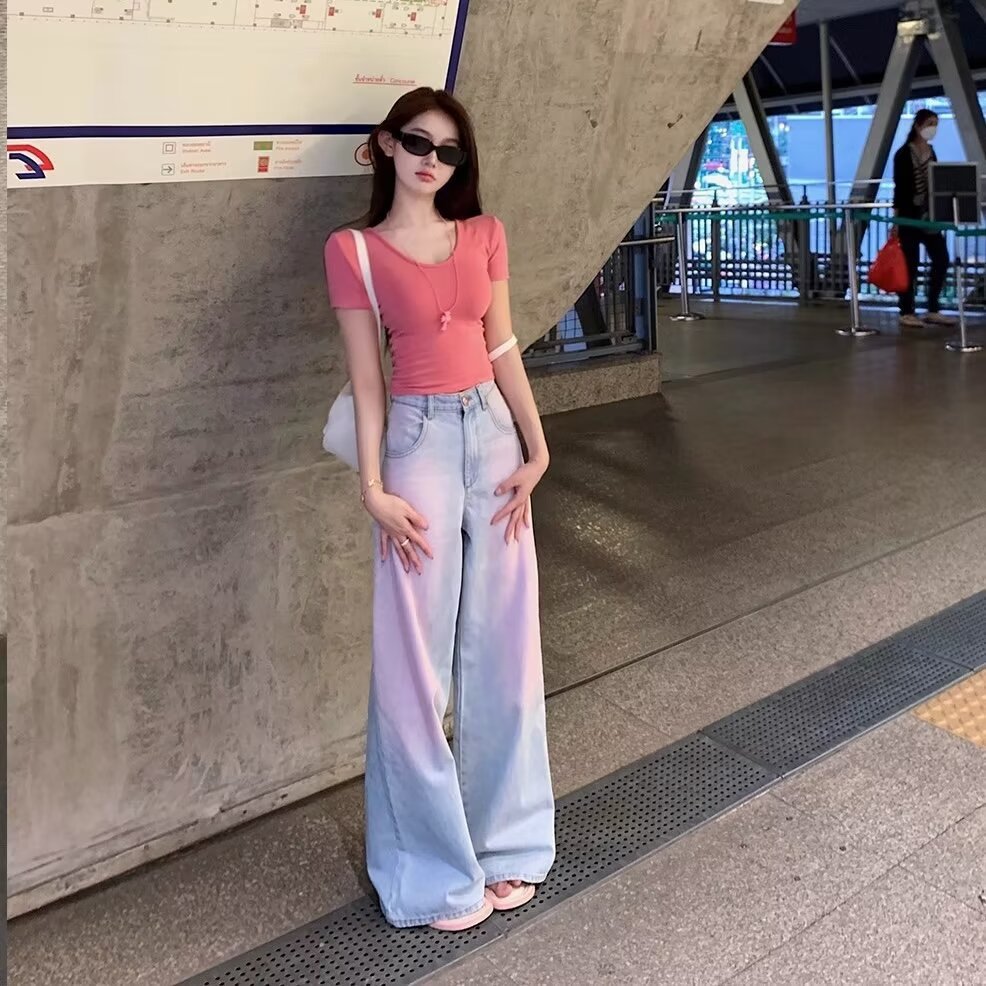 아메리칸 스타일 빈티지 오래 된 스프레이 그린 블러쉬 핑크 청바지 여성용 트렌디 브랜드 와이드 레그 루즈 캐주얼 팬츠스토어 가기