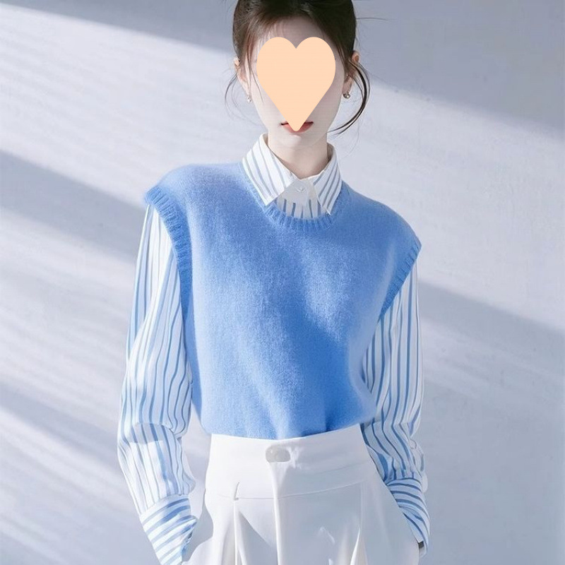 올해의 폭발 가짜 투피스 블루 스트라이프 셔츠 여성의 2025 년 초봄 새로운 내부 스택 긴 소매 니트 탑
