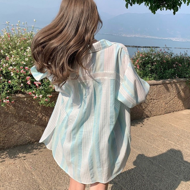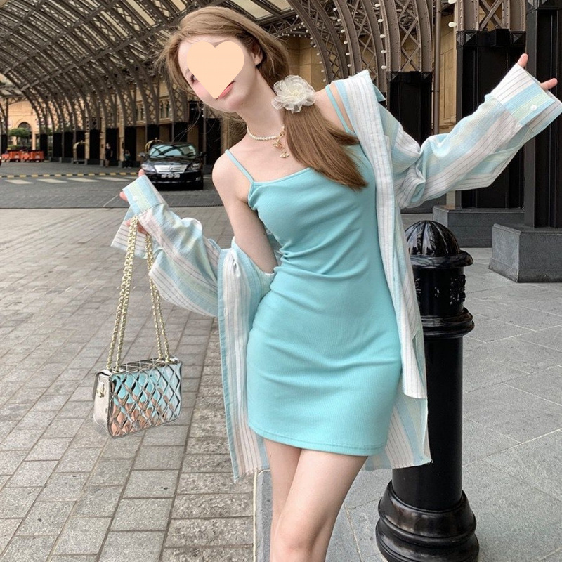 플러스 사이즈 여성의 우아한 사교계 세트 여성의 봄 새로운 얇은 태양 셔츠 블루 슬립 스커트 투피스 세트스토어 가기