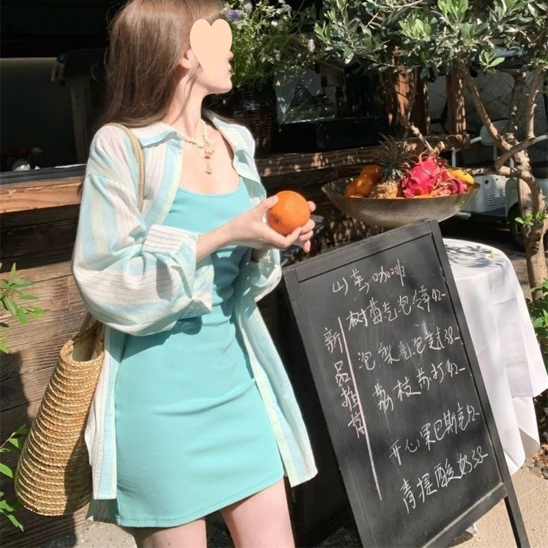 플러스 사이즈 여성의 우아한 사교계 세트 여성의 봄 새로운 얇은 태양 셔츠 블루 슬립 스커트 투피스 세트