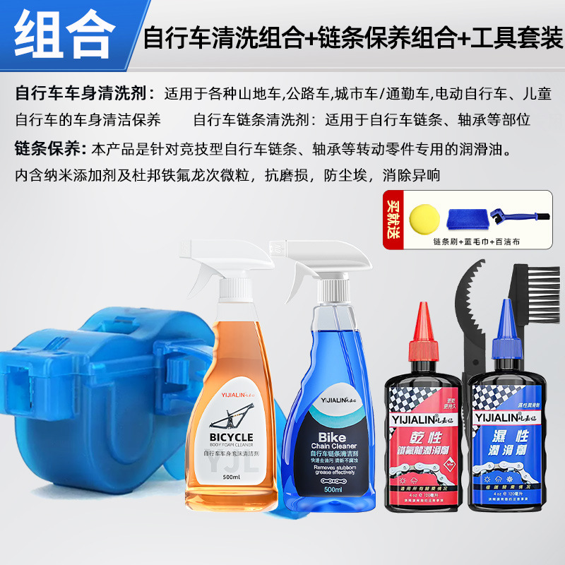 • 자전거 청소 조합 + 체인 유지 관리 조합 + 윤활 조합 + 도구 세트 (체인 브러시 + 파란색 수건 + 수세미 포함)