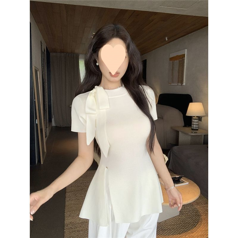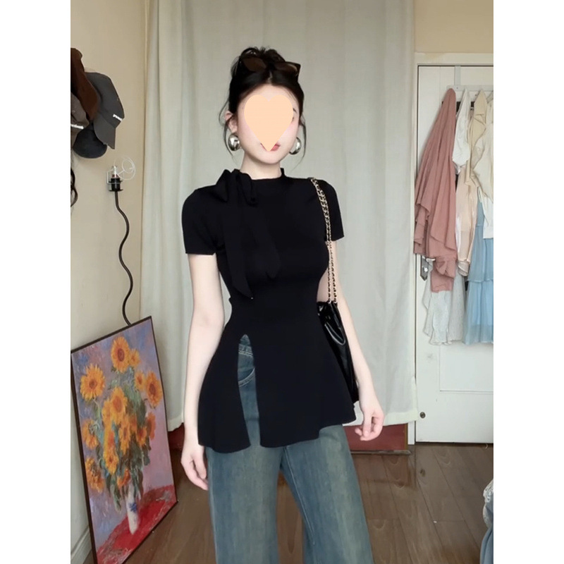 검은 활 넥타이 짧은 소매 니트 스웨터 여성의 2025 여름 새로운 순수한 욕망 바람 긴 분할 탑스토어 가기
