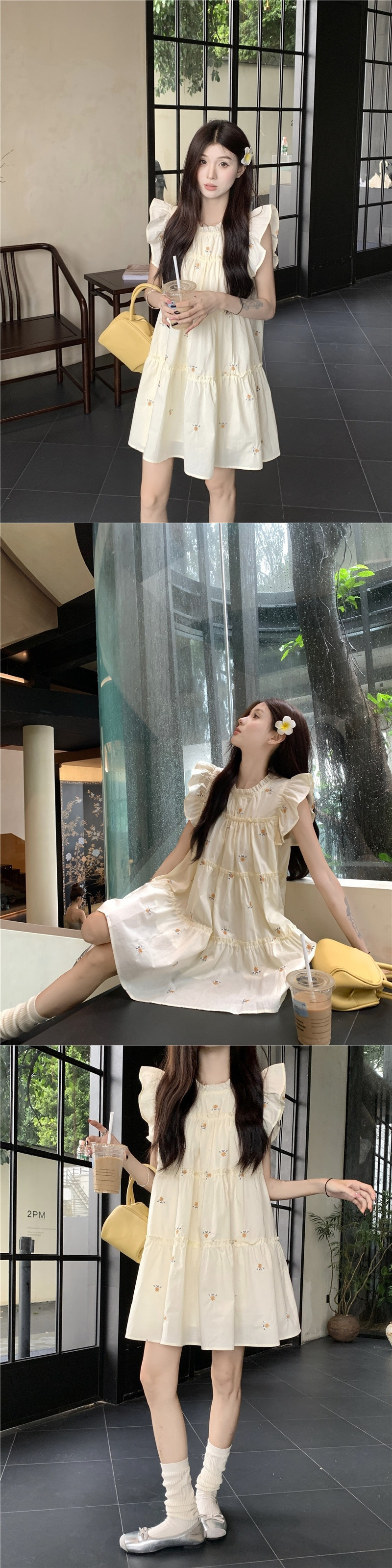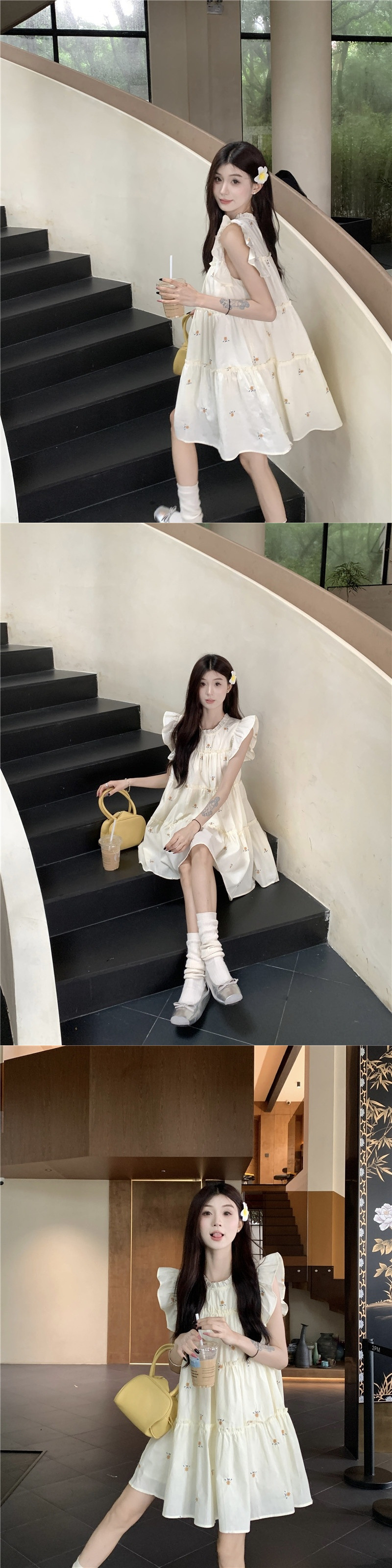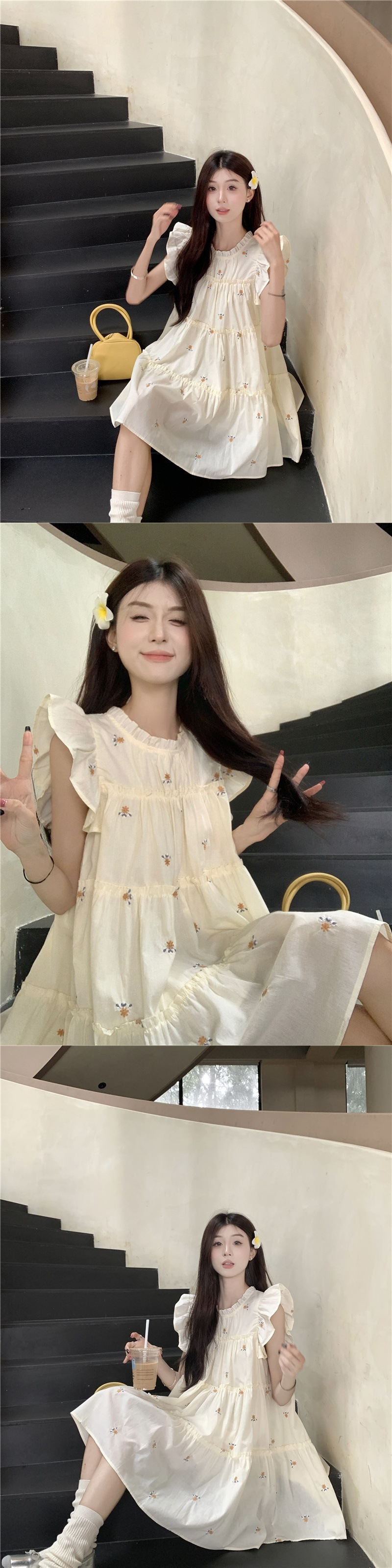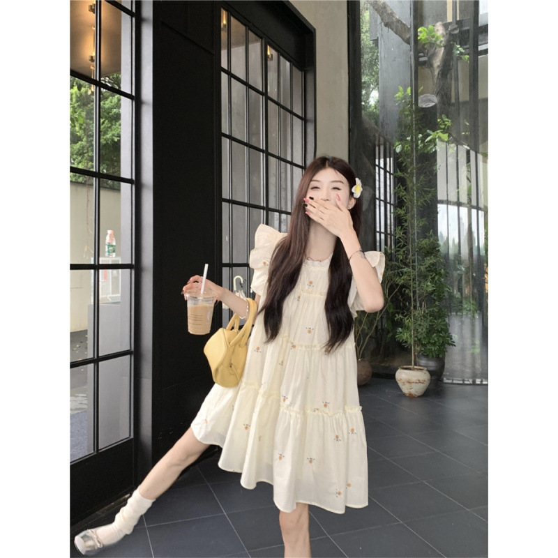 여름 차 스타일 프랑스 달콤한 자수 꽃 작은 비행 소매 원피스 여성 느슨한 작은 케이크 짧은 A 모양