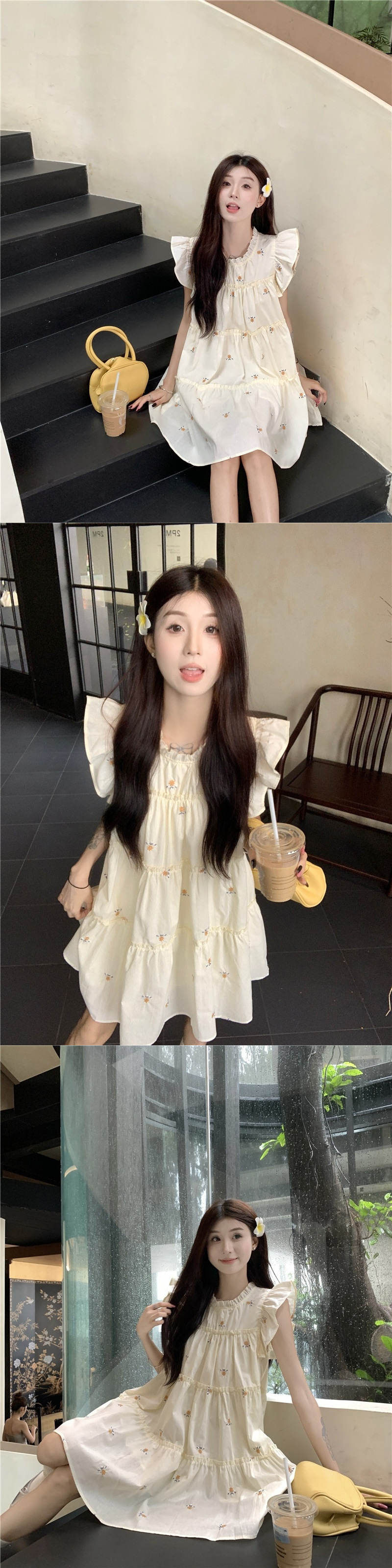 여름 차 스타일 프랑스 달콤한 자수 꽃 작은 비행 소매 원피스 여성 느슨한 작은 케이크 짧은 A 모양스토어 가기