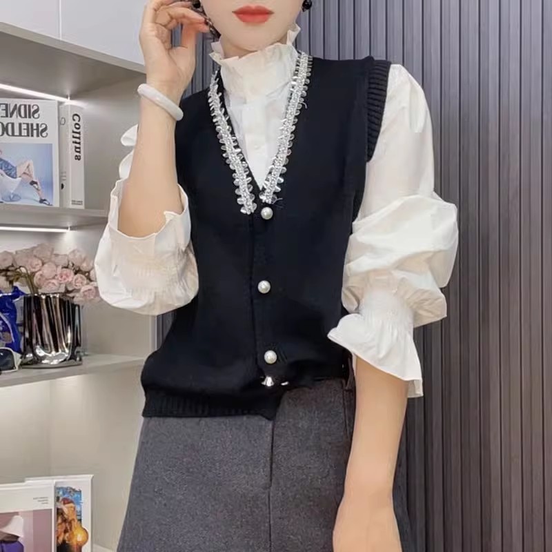 레이스 칼라 셔츠 여성 2025 봄 새로운 한국 패션 투피스 니트 조끼 올 매치 서양식 작은 셔츠스토어 가기