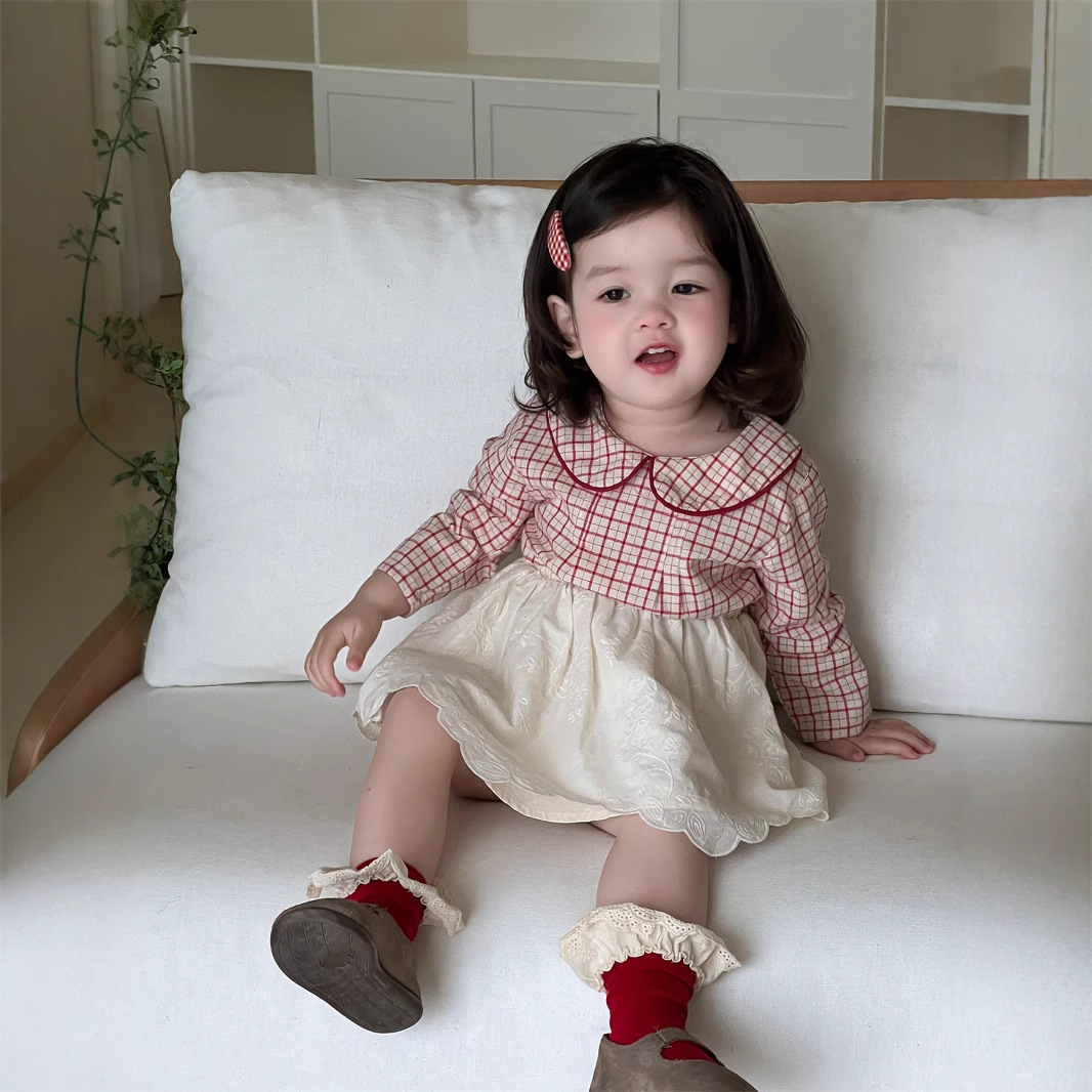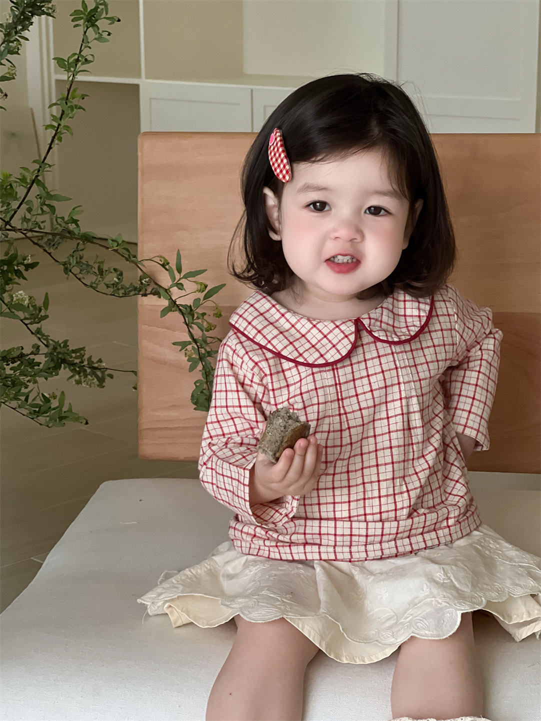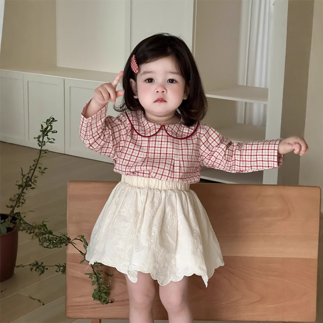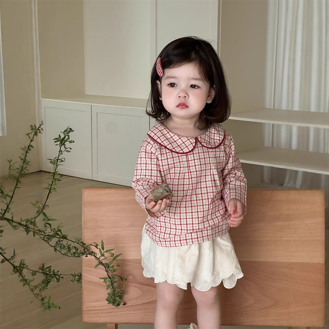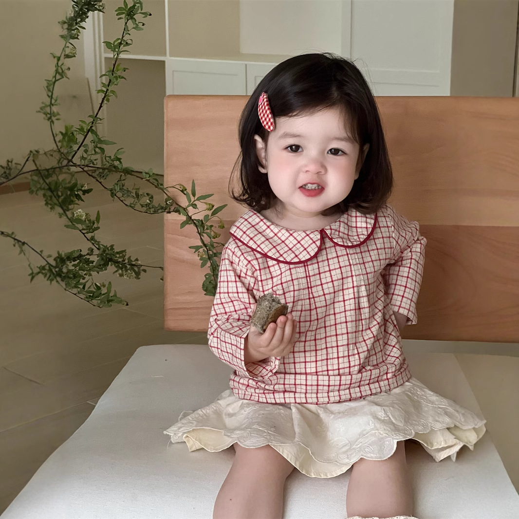아기 소녀 가을 옷 2025 새로운 한국 스타일 아동 의류 소녀 격자 무늬 인형 셔츠 짧은 치마 정장 어린이 가을 옷