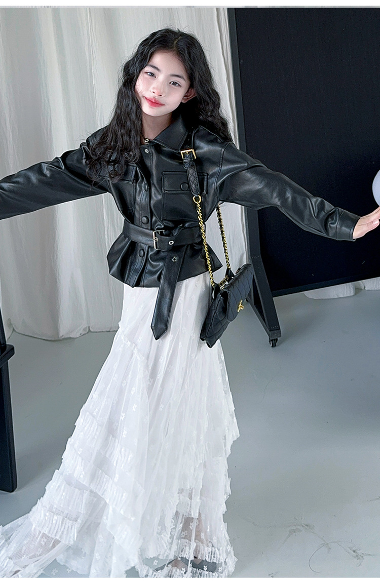 소녀 타이트 허리 PU 가죽 자켓 봄 2025 새로운 스타일 중대형 어린이 슬림 핏 슬림 재킷 벨트 트렌디 자켓