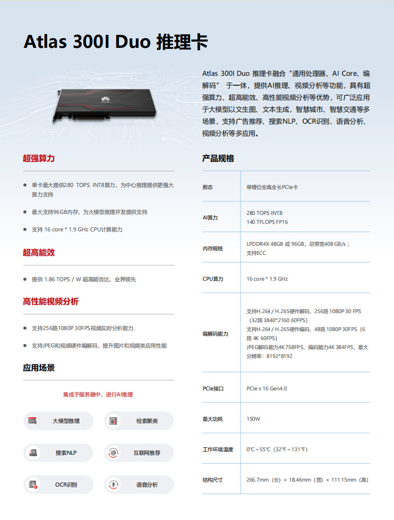 昇腾Atlas300i duo 48GB 96GB 280T 대형 모델 고성능 국산 AI 추론 카드