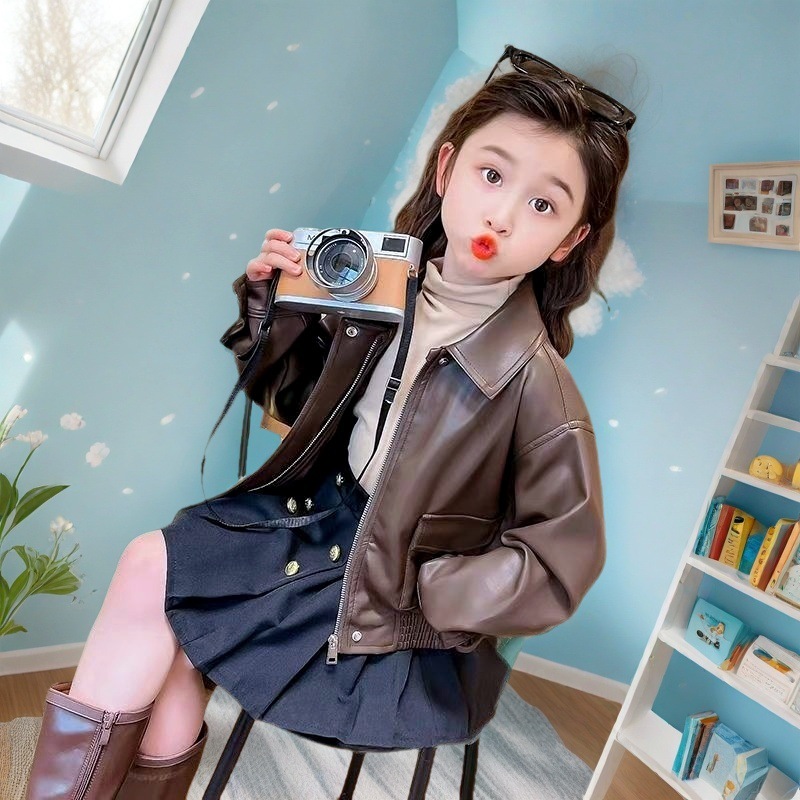 소녀 인터넷 인기있는 봄과 가을 멋진 가죽 코트 어린이 서양식 가을 2025 새로운 유행 여름 거리 탑